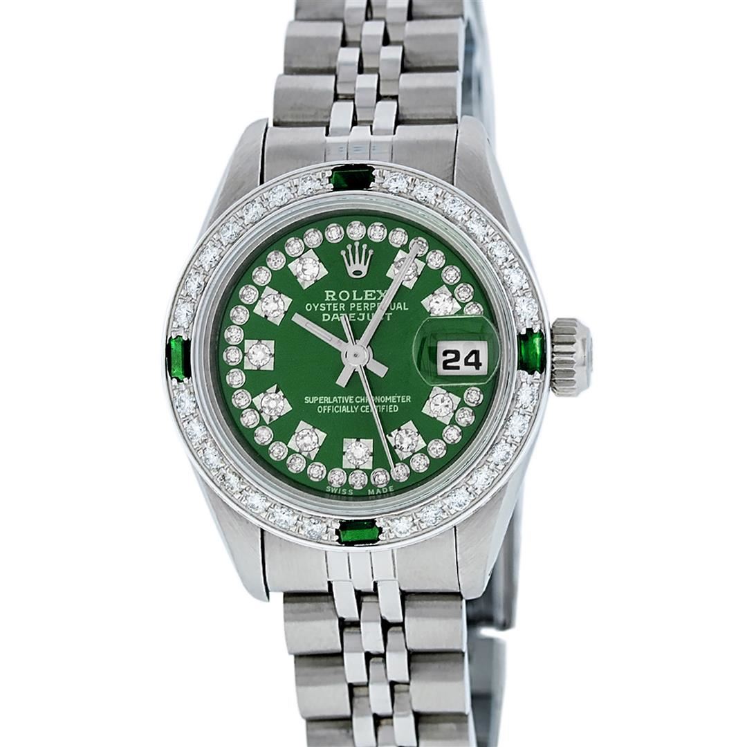 One Ladies Pre Owned Stainless Steel Rolex Datejust Polished Bright with Satin Finish, Serviced & Electronically Tested, Stainless Steel Case: 26mm, Stainless Steel Crown. Custom Bezel: New 18K White Gold Beadset & Emerald Diamond Bezel, Diamond Count: 28