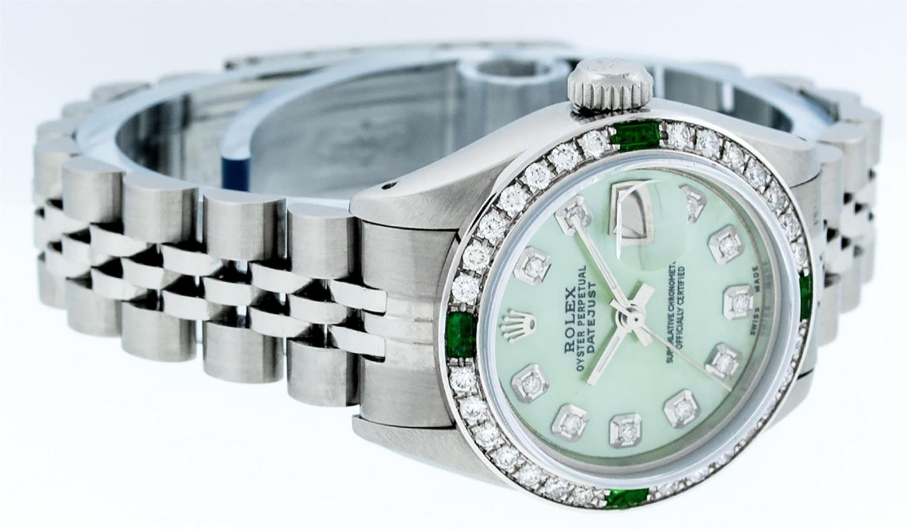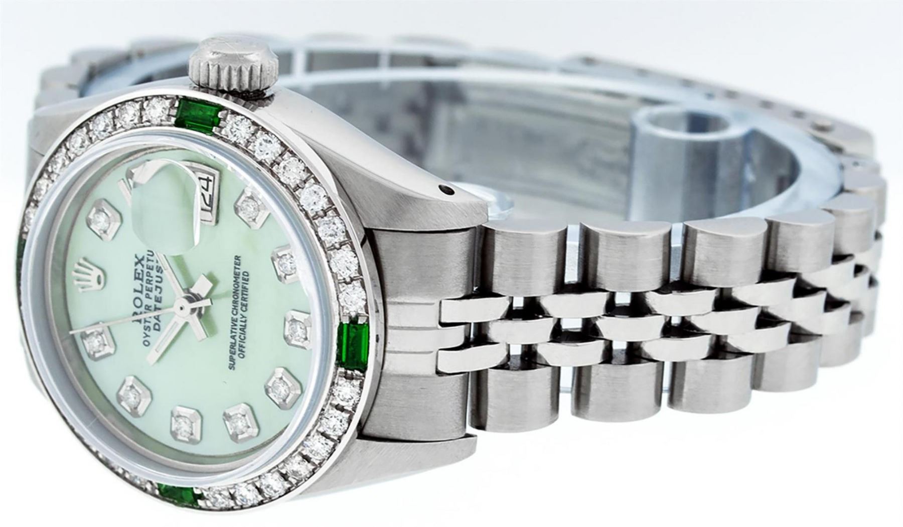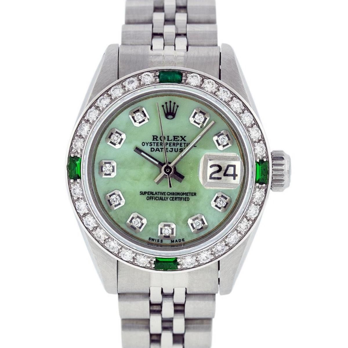 One Ladies Stainless Steel Rolex Datejust Polished Bright with Satin Finish, Serviced & Electronically Tested, Stainless Steel Case: 26mm, Stainless Steel Crown. Custom Bezel: New 18K White Gold Beadset & Synthetic Emerald Diamond Bezel, Diamond Count: 28 Diamonds + 4 Synthetic Emeralds. Total Weight .70 Carat, Clarity: SI-VS, Color: G to H. Custom Crystal: New Synthetic Sapphire Cyclops Lens. Custom Hands: New Luminescent Hands. Movement: Automatic Winding Movement. Custom Dial: Refinished Green Mother Of Pearl Diamond Dial, Stone Count: 10 Diamonds In Dial, G To H In Color, Clarity: SI-VS. Date Window: 3 O'Clock Position Date Display, Model: Datejust. Condition: G-6 Extra Fine. Bracelet: Stainless Steel Jubilee. Bright Polish & Satin Finish. 6.0 Inch Length, Adjustable. Standard Clasp, With Rolex Logo. This Watch Has Been Serviced Time Tested And Is In Excellent Condition It Is Free Of All Scratches And Dents.
