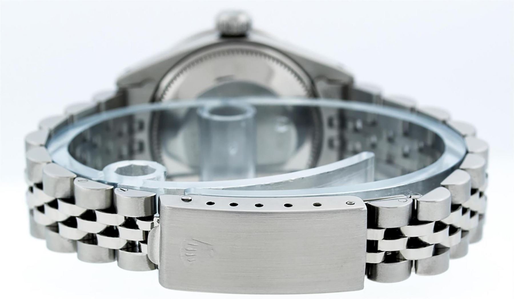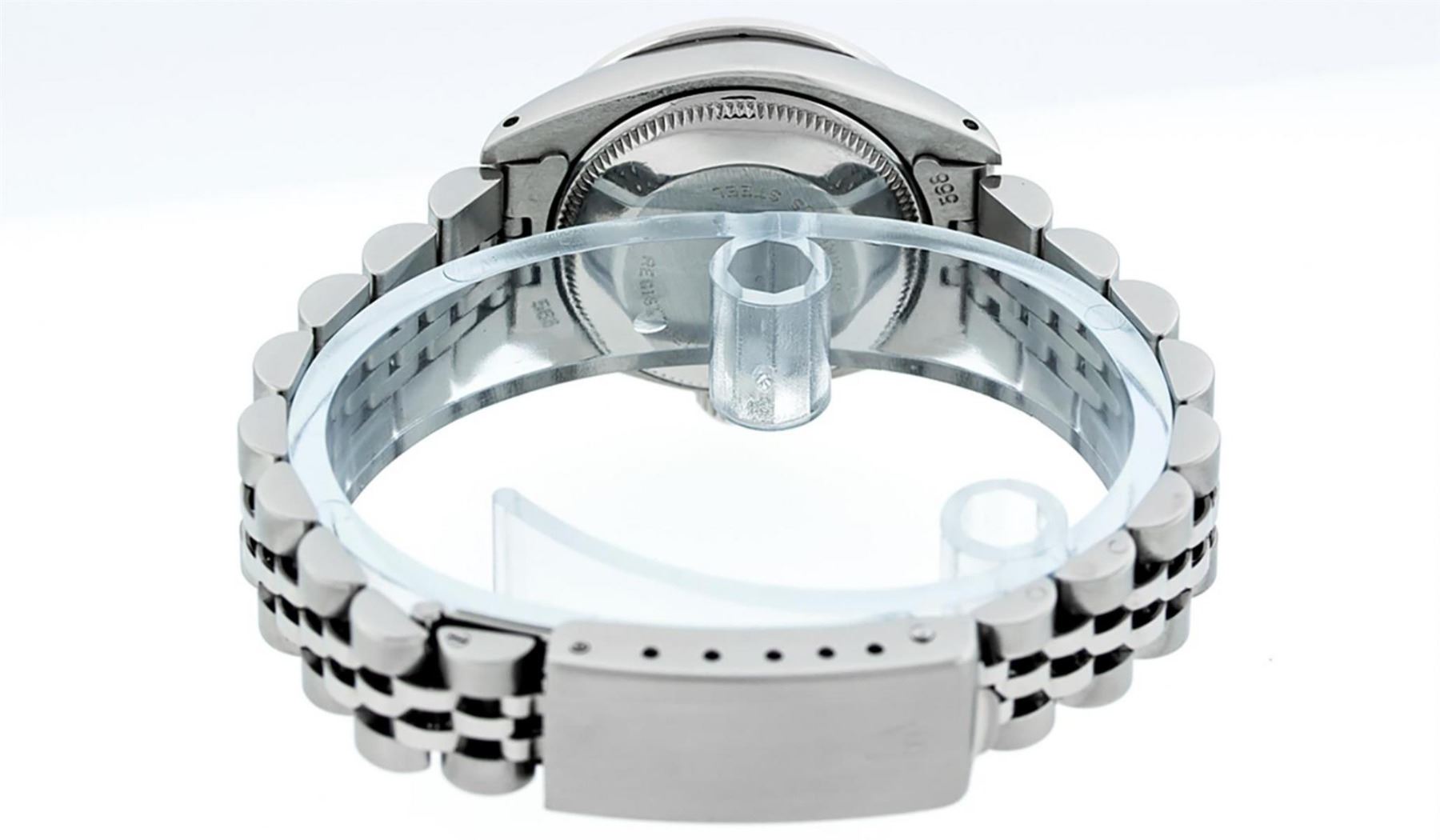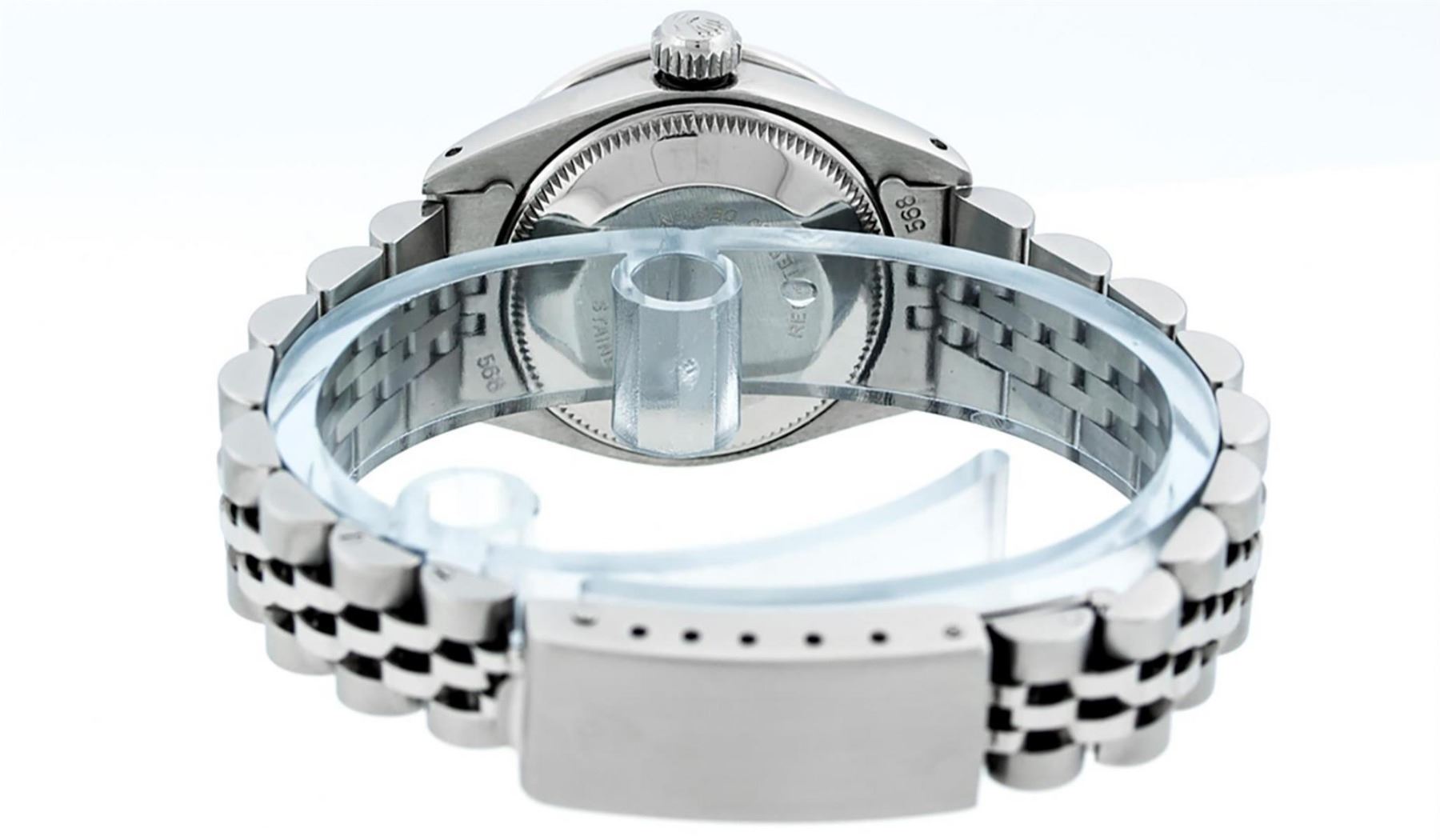 One Ladies Stainless Steel Rolex Datejust Polished Bright with Satin Finish, Serviced & Electronically Tested, Stainless Steel Case: 26mm, Stainless Steel Crown. Custom Bezel: New 18K White Gold Beadset & Synthetic Emerald Diamond Bezel, Diamond Count: 28 Diamonds + 4 Synthetic Emeralds. Total Weight .70 Carat, Clarity: SI-VS, Color: G to H. Custom Crystal: New Synthetic Sapphire Cyclops Lens. Custom Hands: New Luminescent Hands. Movement: Automatic Winding Movement. Custom Dial: Refinished Green Mother Of Pearl Diamond Dial, Stone Count: 10 Diamonds In Dial, G To H In Color, Clarity: SI-VS. Date Window: 3 O'Clock Position Date Display, Model: Datejust. Condition: G-6 Extra Fine. Bracelet: Stainless Steel Jubilee. Bright Polish & Satin Finish. 6.0 Inch Length, Adjustable. Standard Clasp, With Rolex Logo. This Watch Has Been Serviced Time Tested And Is In Excellent Condition It Is Free Of All Scratches And Dents.
