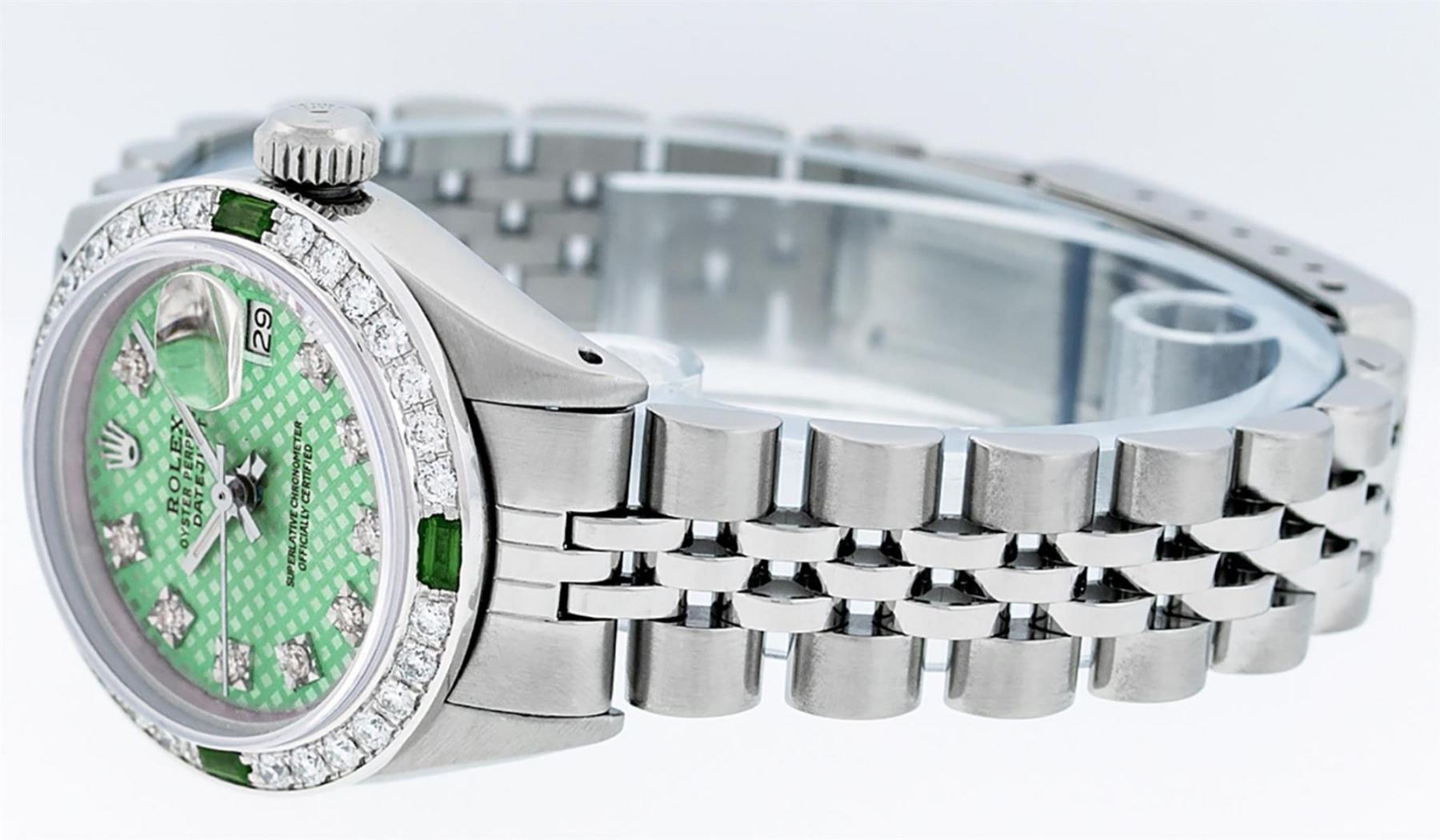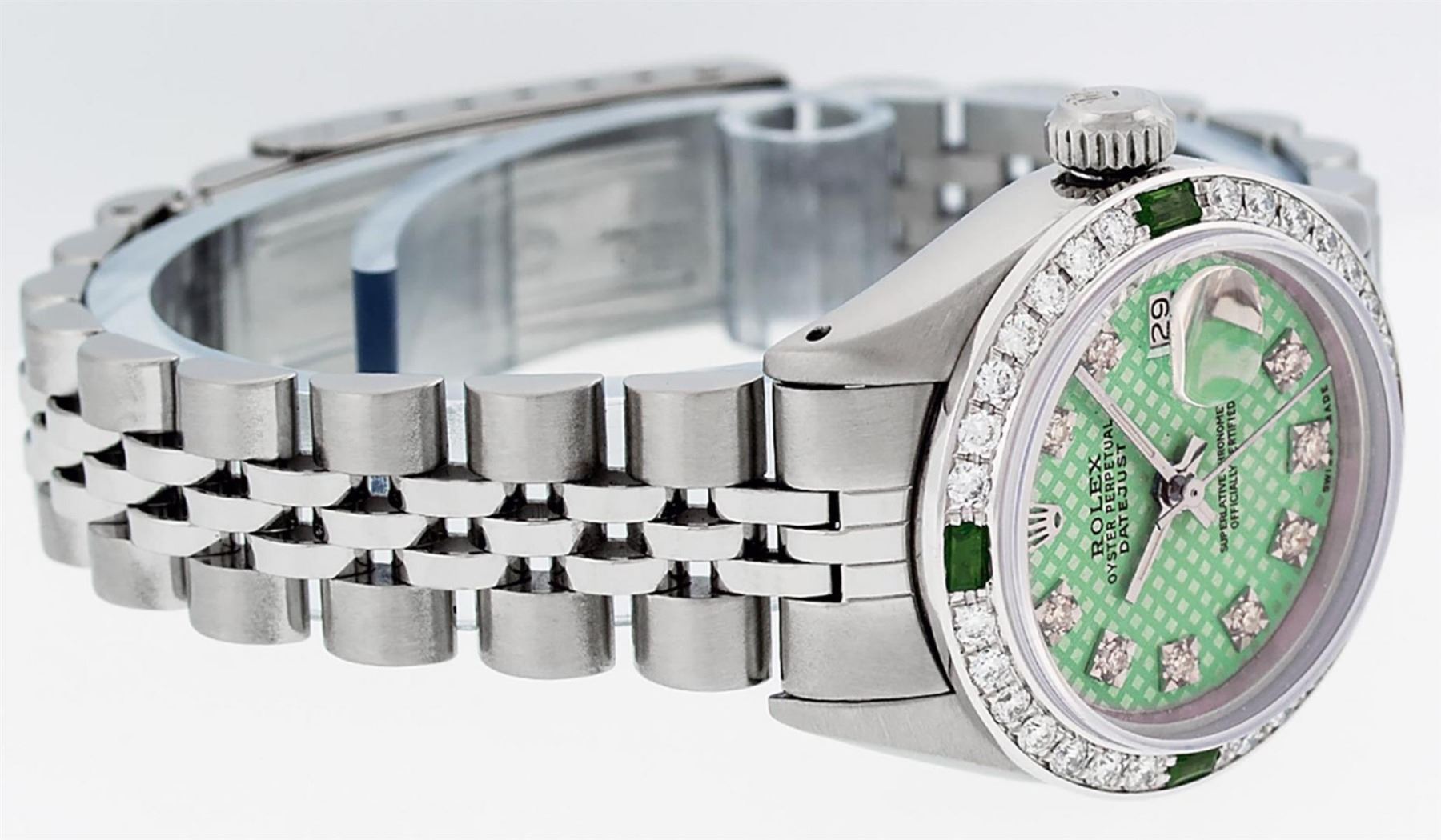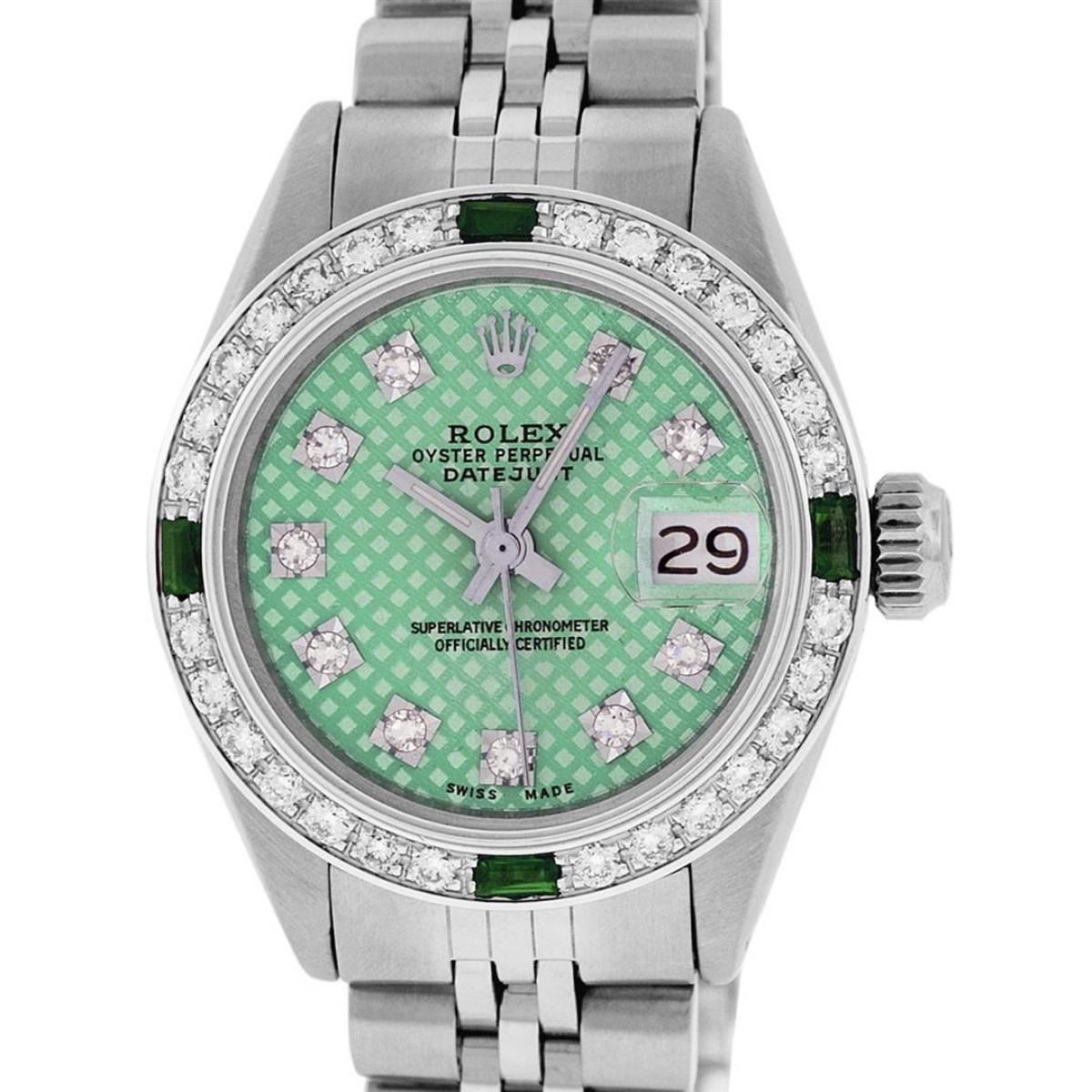 One Ladies Stainless Steel Rolex Datejust Polished Bright with Satin Finish, Serviced & Electronically Tested, Stainless Steel Case: 26mm, Stainless Steel Crown, Custom Bezel: New 18K White Emerald Beadset Diamond Bezel, Diamond + Gem Count: 28 Diamonds + 4 Emeralds. Total Weight .70 Carat, Clarity: SI-VS, Color: G to H. Custom Crystal: New Scratch Resistant Synthetic Sapphire Cyclops Lens. Custom Hands: New Luminescent Hands. Movement: Automatic Winding Movement. Custom Dial: Green Stamp With Single Cut Diamond Hour Markers, 10 Diamonds in Dial, G To H In Color, Clarity: SI-VS. Date Window: 3 O'Clock Position Date Display, Model: Datejust. Condition: G-6 Extra Fine. Bracelet: Stainless Steel Jubilee Band. Bright Polish & Satin Finish. 6.0 Inch Length, Adjustable. Standard Clasp, With Rolex Logo. This Watch Has Been Serviced Time Tested And Is In Excellent Condition It Is Free Of All Scratches And Dents.