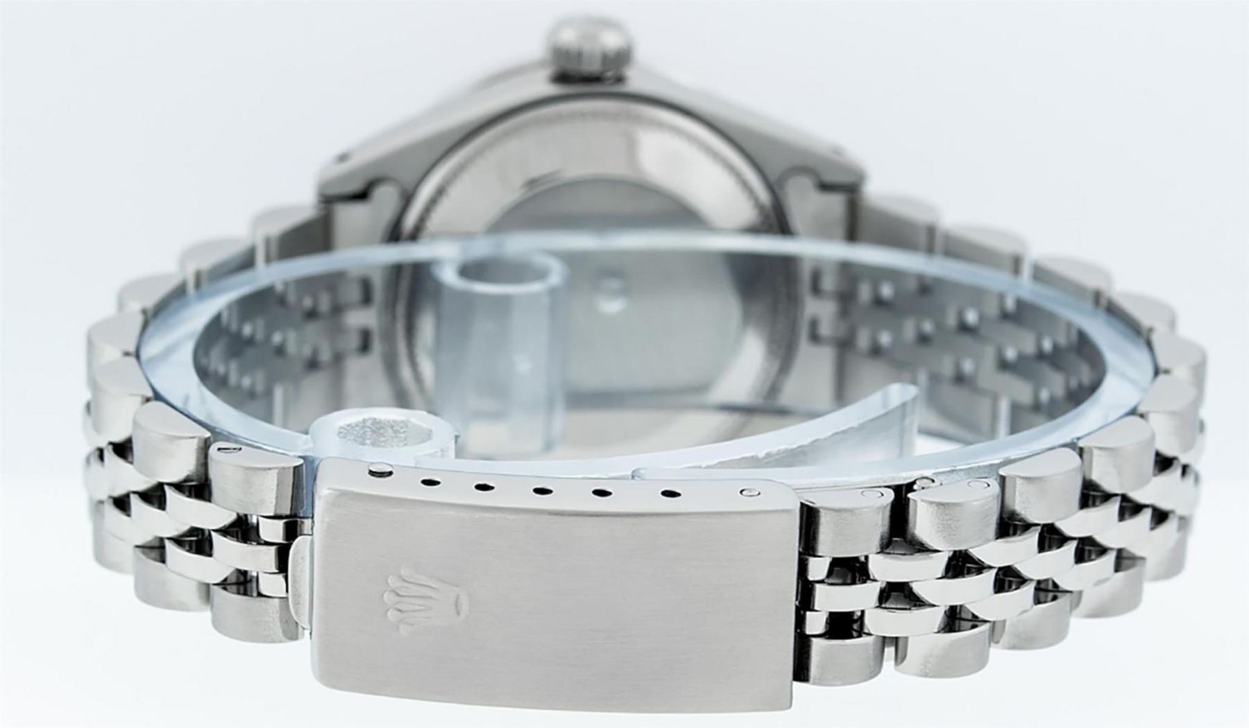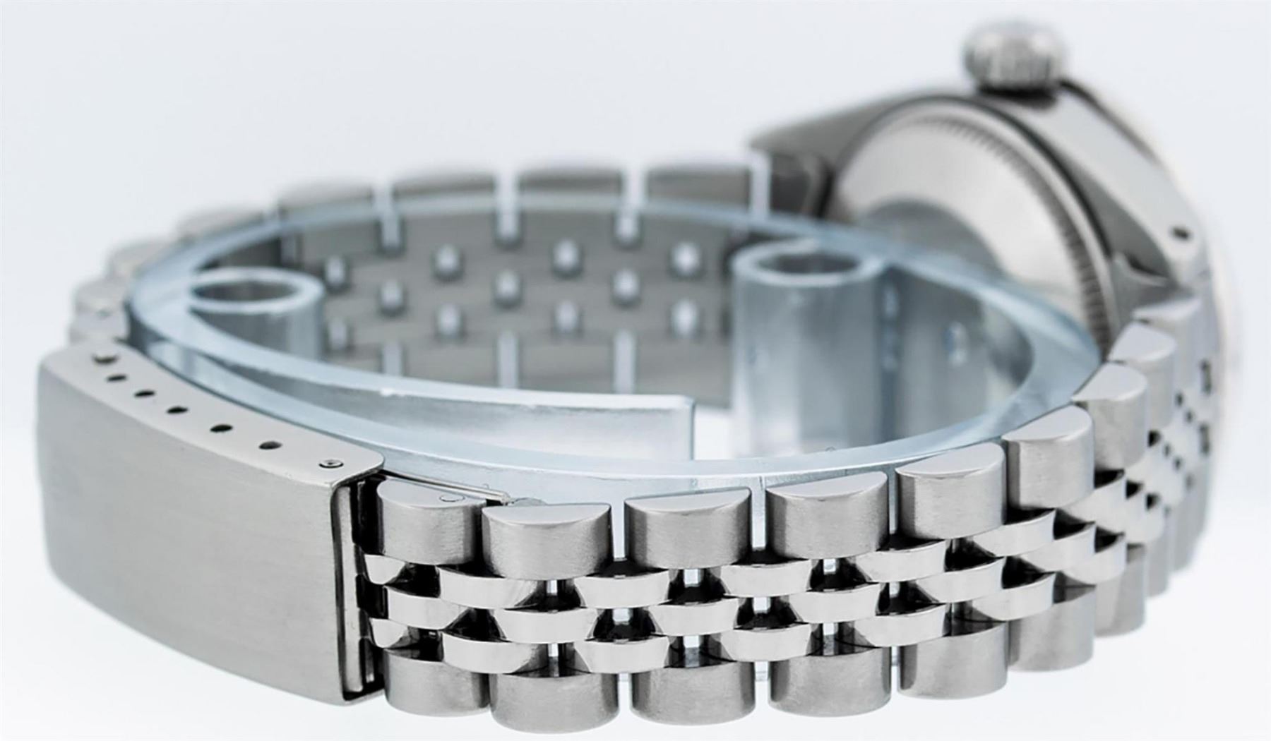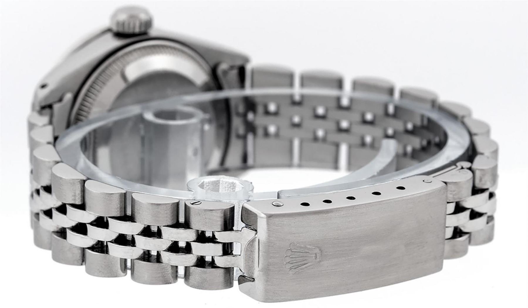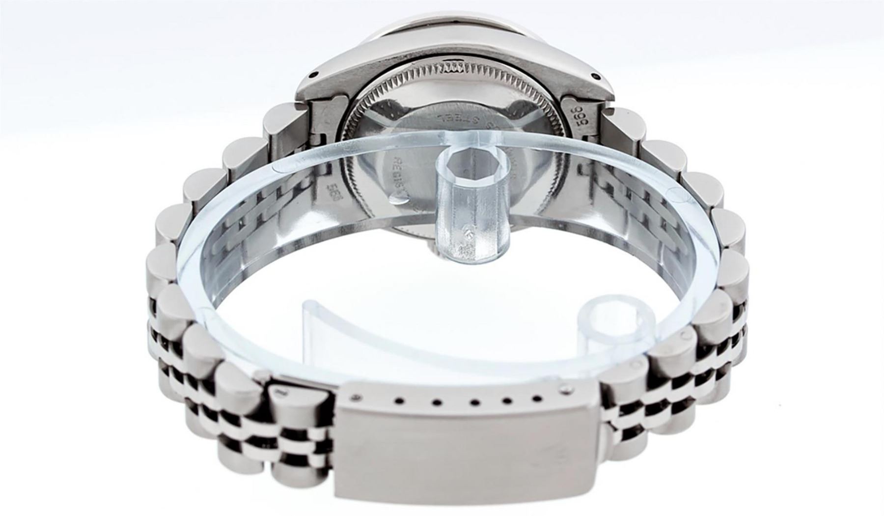 One Ladies Stainless Steel Rolex Datejust Polished Bright with Satin Finish, Serviced & Electronically Tested, Stainless Steel Case: 26mm, Stainless Steel Crown, Custom Bezel: New 18K White Emerald Beadset Diamond Bezel, Diamond + Gem Count: 28 Diamonds + 4 Emeralds. Total Weight .70 Carat, Clarity: SI-VS, Color: G to H. Custom Crystal: New Scratch Resistant Synthetic Sapphire Cyclops Lens. Custom Hands: New Luminescent Hands. Movement: Automatic Winding Movement. Custom Dial: Green Stamp With Single Cut Diamond Hour Markers, 10 Diamonds in Dial, G To H In Color, Clarity: SI-VS. Date Window: 3 O'Clock Position Date Display, Model: Datejust. Condition: G-6 Extra Fine. Bracelet: Stainless Steel Jubilee Band. Bright Polish & Satin Finish. 6.0 Inch Length, Adjustable. Standard Clasp, With Rolex Logo. This Watch Has Been Serviced Time Tested And Is In Excellent Condition It Is Free Of All Scratches And Dents.
