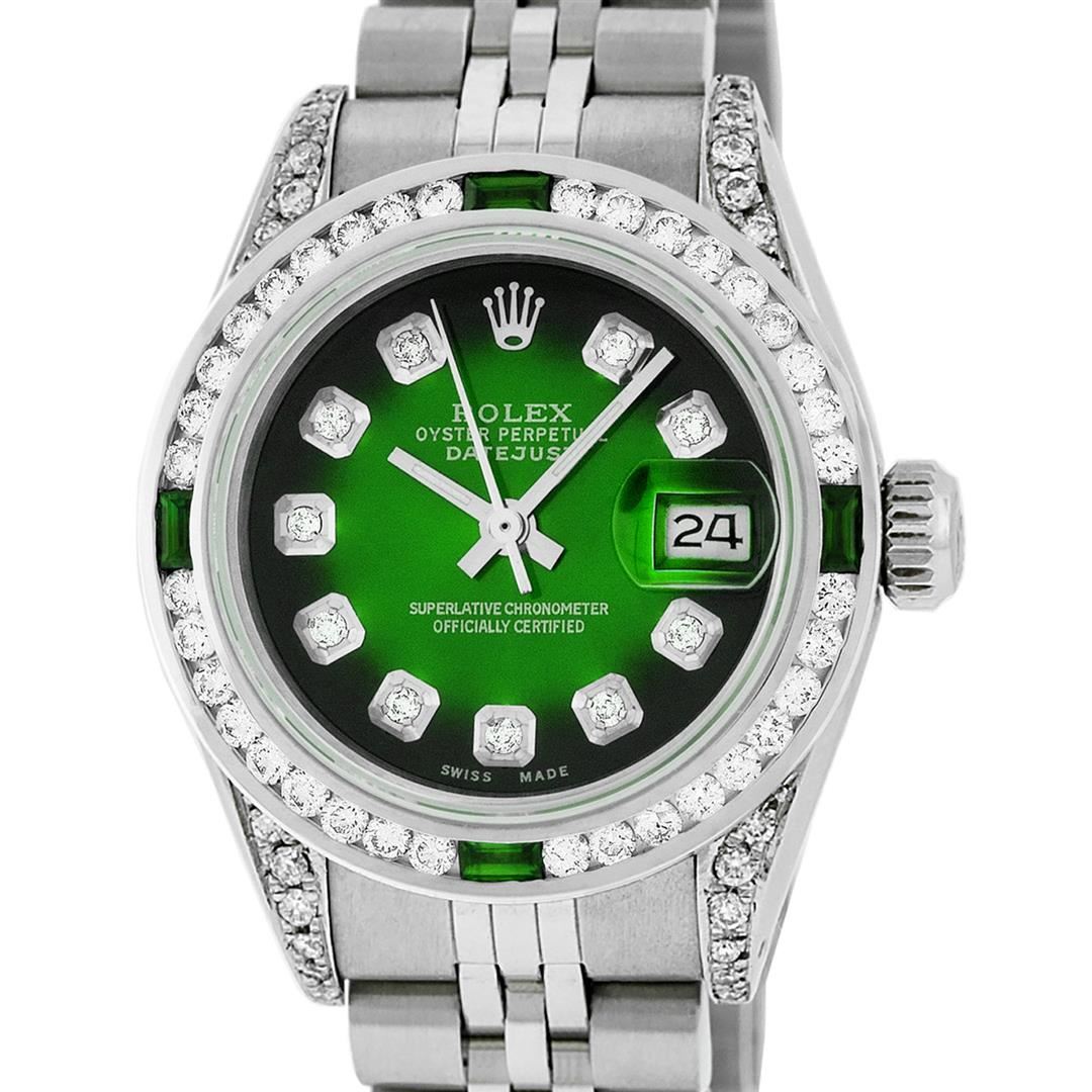 One Ladies Stainless Steel Pre Owned Rolex Datejust Polished Bright with Satin Finish, Serviced & Electronically Tested, Stainless Steel Case: 26mm, Stainless Steel Crown, Custom Diamond Lugs: 24 Diamonds On Lugs, Clarity: SI-VS, Color: G to H. Custom Bezel: New 18K White Gold Diamond & Emerald Channel Set Bezel, Diamond Count: 28 Diamonds + 4 Emeralds, Clarity: SI-VS, Color: G to H. Custom Crystal: New Sapphire With Date Window. Custom Hands: New Luminescent Hands. Rolex Movement: Automatic Winding Movement. Custom Dial: Refinished To Green Vignette With Custom Added Diamonds, 10 Diamonds in Dial, G To H In Color, Clarity: SI-VS. Date Window: 3 O'Clock Position Date Display, Model: Datejust Condition: G-6 Extra Fine. Rolex Bracelet: Stainless Steel Jubilee Band. Bright Polish & Satin Finish. 6.0 Inch Length, Adjustable. Standard Clasp, With Rolex Logo. This Watch Has Been Serviced Time Tested And Is In Excellent Condition It Is Free Of All Scratches And Dents.