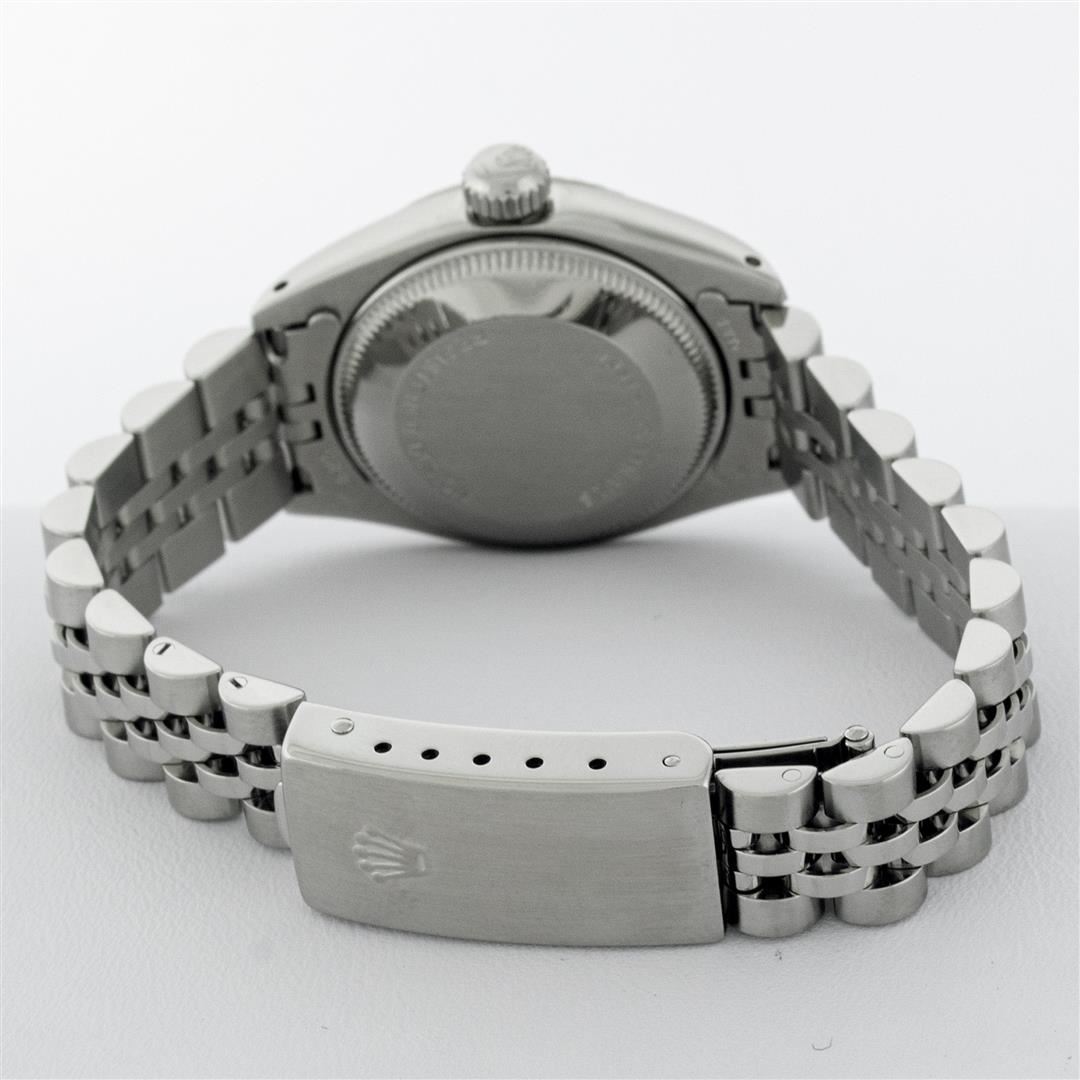 One Ladies Stainless Steel Rolex Datejust Polished Bright with Satin Finish, Serviced & Electronically Tested, Stainless Steel Case: 26mm, Stainless Steel Crown, Bezel: 14K White Gold Bezel. Custom Crystal: New Acrylic Cyclops Lens. Custom Hands: New Luminescent Hands. Movement: Automatic Winding Movement. Custom Dial: Ice Blue Diamond Dial, Diamond Count: 10 Diamonds In Dial, Color: G to H, Clarity: SI-VS. Date Window: 3 O'Clock Position Date Display, Model: Datejust. Condition: G-6 Extra Fine. Bracelet: Stainless Steel Jubilee Band. Bright Polish & Satin Finish. 6.0 Inch Length, Adjustable. Standard Clasp, With Rolex Logo. This Watch Has Been Serviced Time Tested And Is In Excellent Condition It Is Free Of All Scratches And Dents.