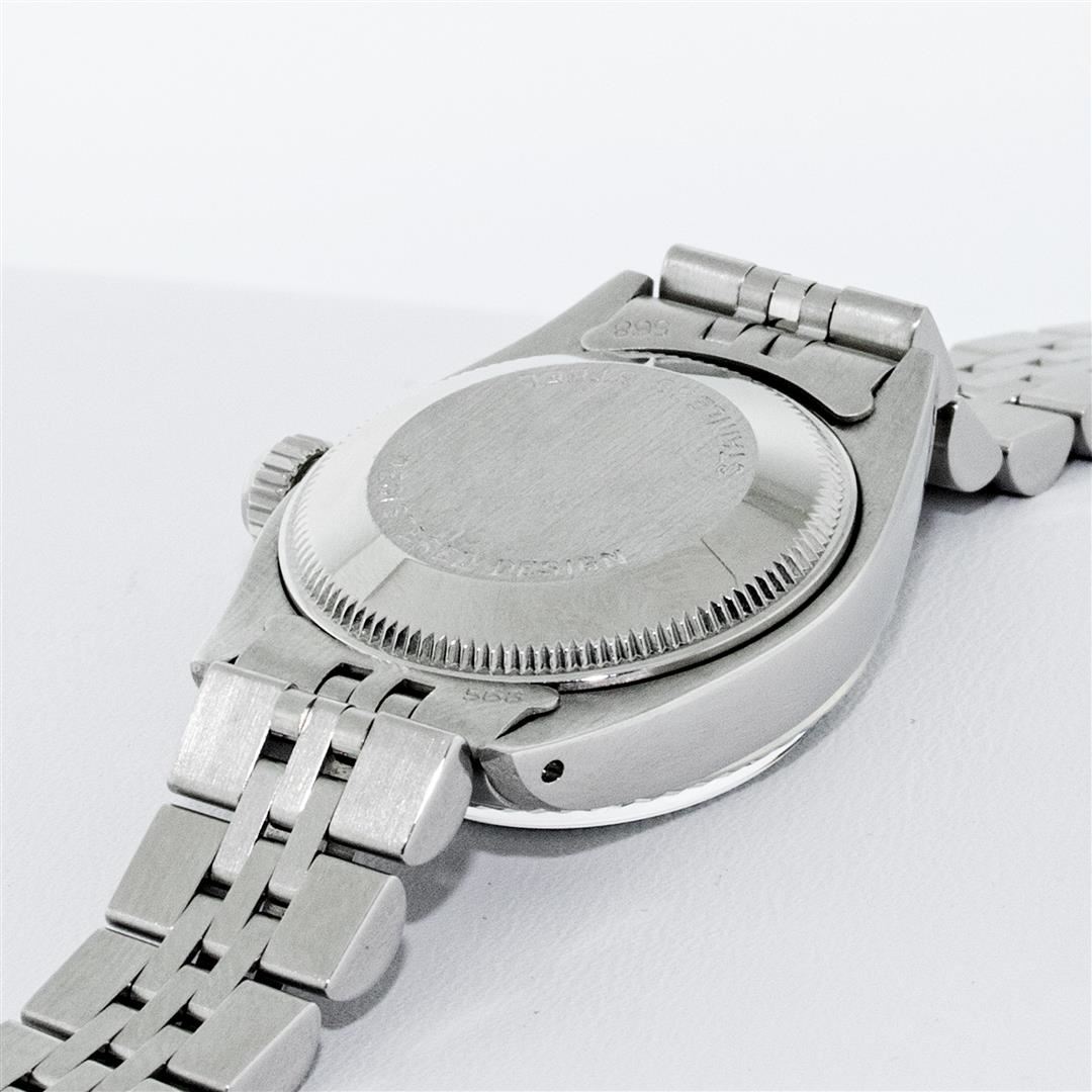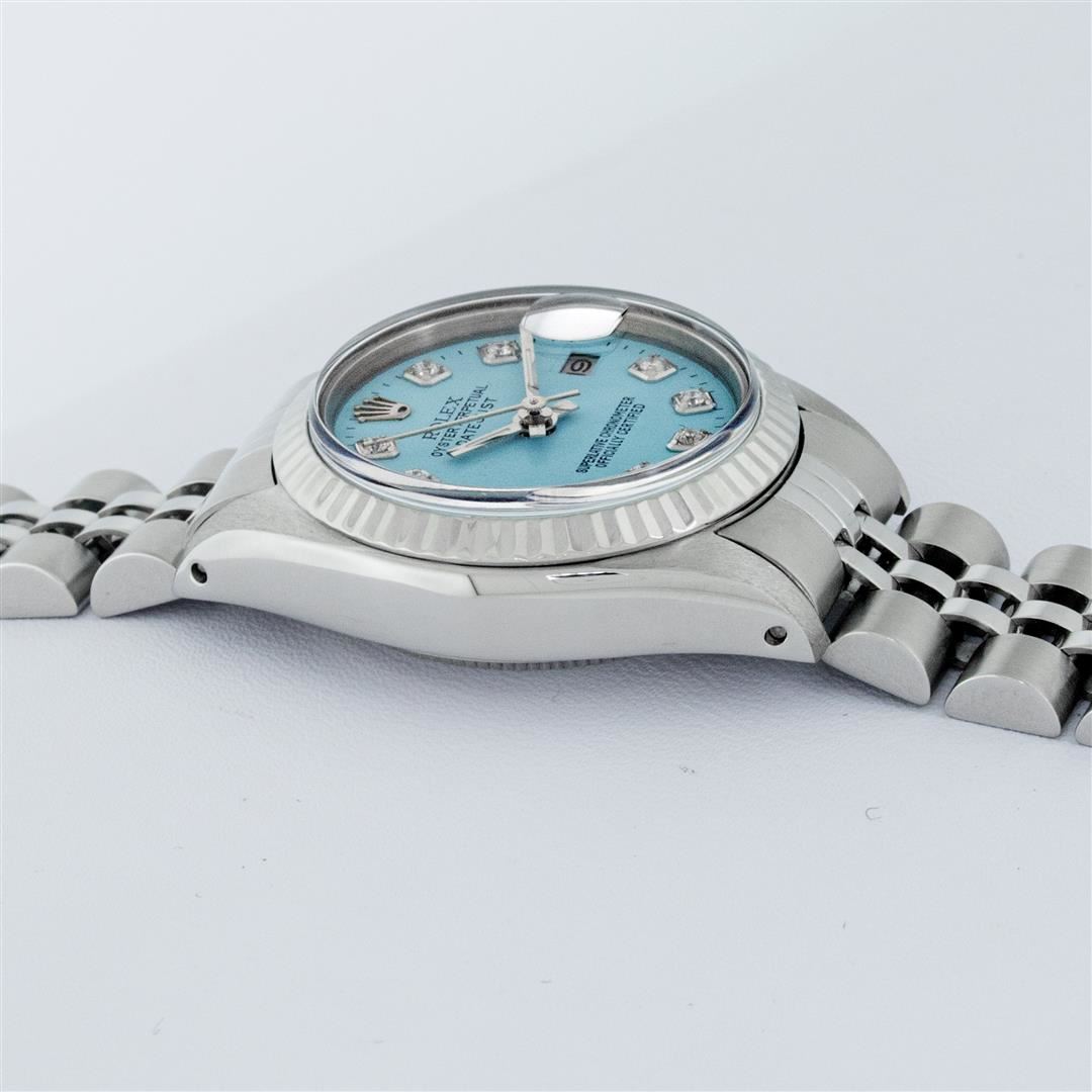 One Ladies Stainless Steel Rolex Datejust Polished Bright with Satin Finish, Serviced & Electronically Tested, Stainless Steel Case: 26mm, Stainless Steel Crown, Bezel: 14K White Gold Bezel. Custom Crystal: New Acrylic Cyclops Lens. Custom Hands: New Luminescent Hands. Movement: Automatic Winding Movement. Custom Dial: Ice Blue Diamond Dial, Diamond Count: 10 Diamonds In Dial, Color: G to H, Clarity: SI-VS. Date Window: 3 O'Clock Position Date Display, Model: Datejust. Condition: G-6 Extra Fine. Bracelet: Stainless Steel Jubilee Band. Bright Polish & Satin Finish. 6.0 Inch Length, Adjustable. Standard Clasp, With Rolex Logo. This Watch Has Been Serviced Time Tested And Is In Excellent Condition It Is Free Of All Scratches And Dents.
