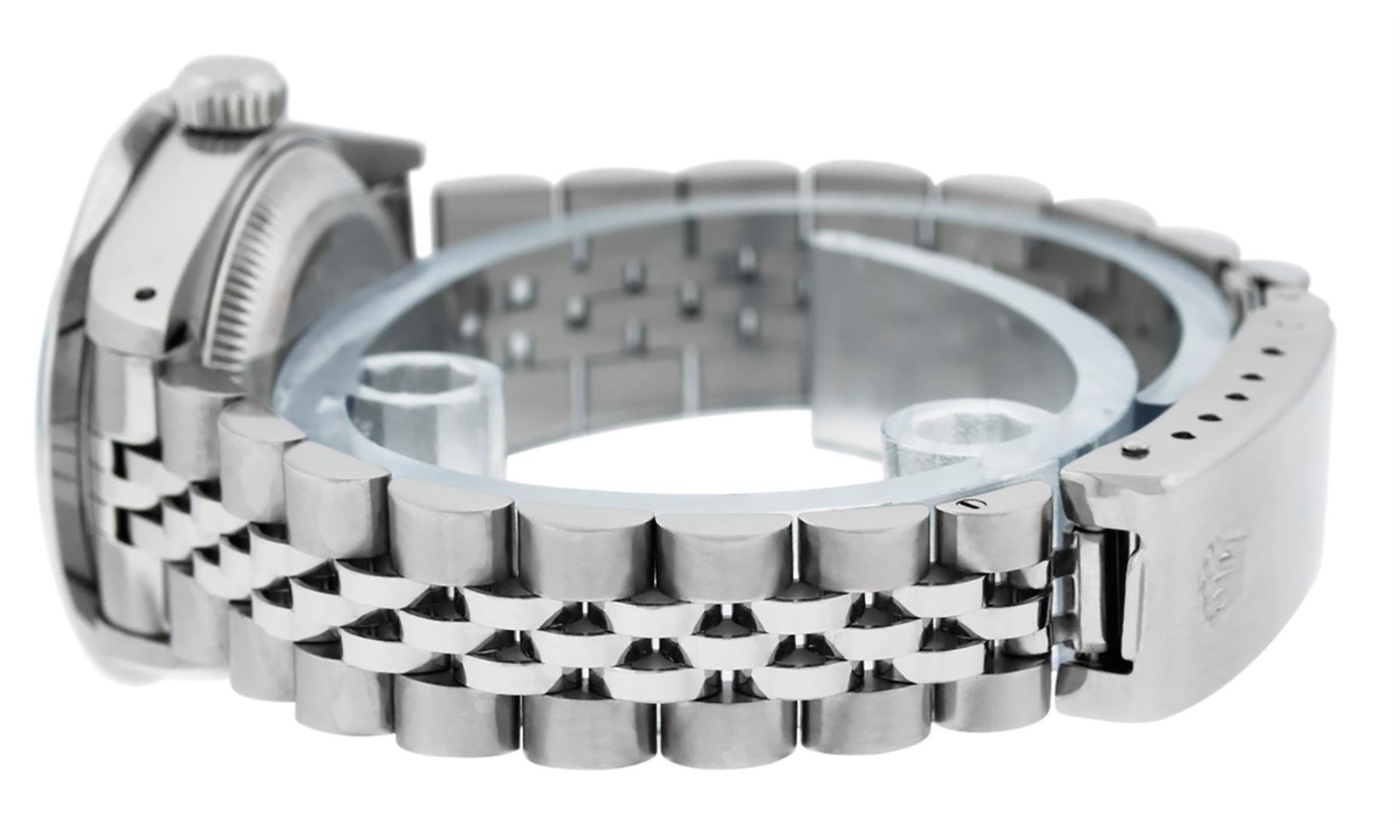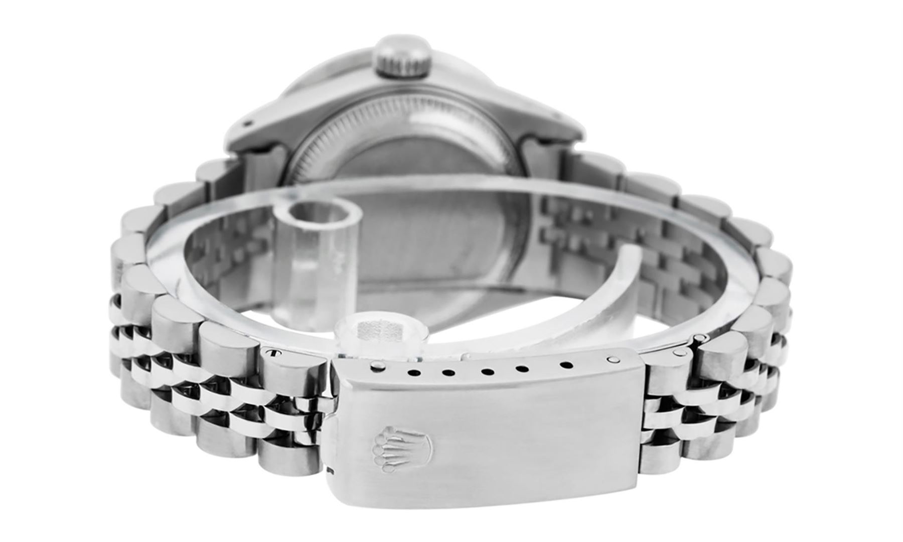 One Ladies Stainless Pre Owned Steel Rolex Datejust Polished Bright with Satin Finish, Serviced & Electronically Tested, Stainless Steel Case: 26mm, Stainless Steel Crown, Custom Bezel: New Stainless Steel Beadset Diamond Bezel, Diamond Count: 44 Diamonds, Clarity: SI-VS, Color: G to H. Custom Crystal: New Sapphire With Date Window. Custom Hands: New Luminescent Hands. Rolex Movement: Automatic Winding Movement. Custom Dial: Refinished To Ice Blue With Custom Added Diamond Hour Markers, Diamond Count: 10 Diamonds in Dial G To H In Color, Clarity: SI-VS. Date Window: 3 O'Clock Position Date Display, Model: Datejust. Condition: G-6 Extra Fine. Rolex Bracelet: Stainless Steel Jubilee Band. Bright Polish & Satin Finish. 6.0 Inch Length, Adjustable. Standard Clasp, With Rolex Logo. This Watch Has Been Serviced Time Tested And Is In Excellent Condition It Is Free Of All Scratches And Dents.