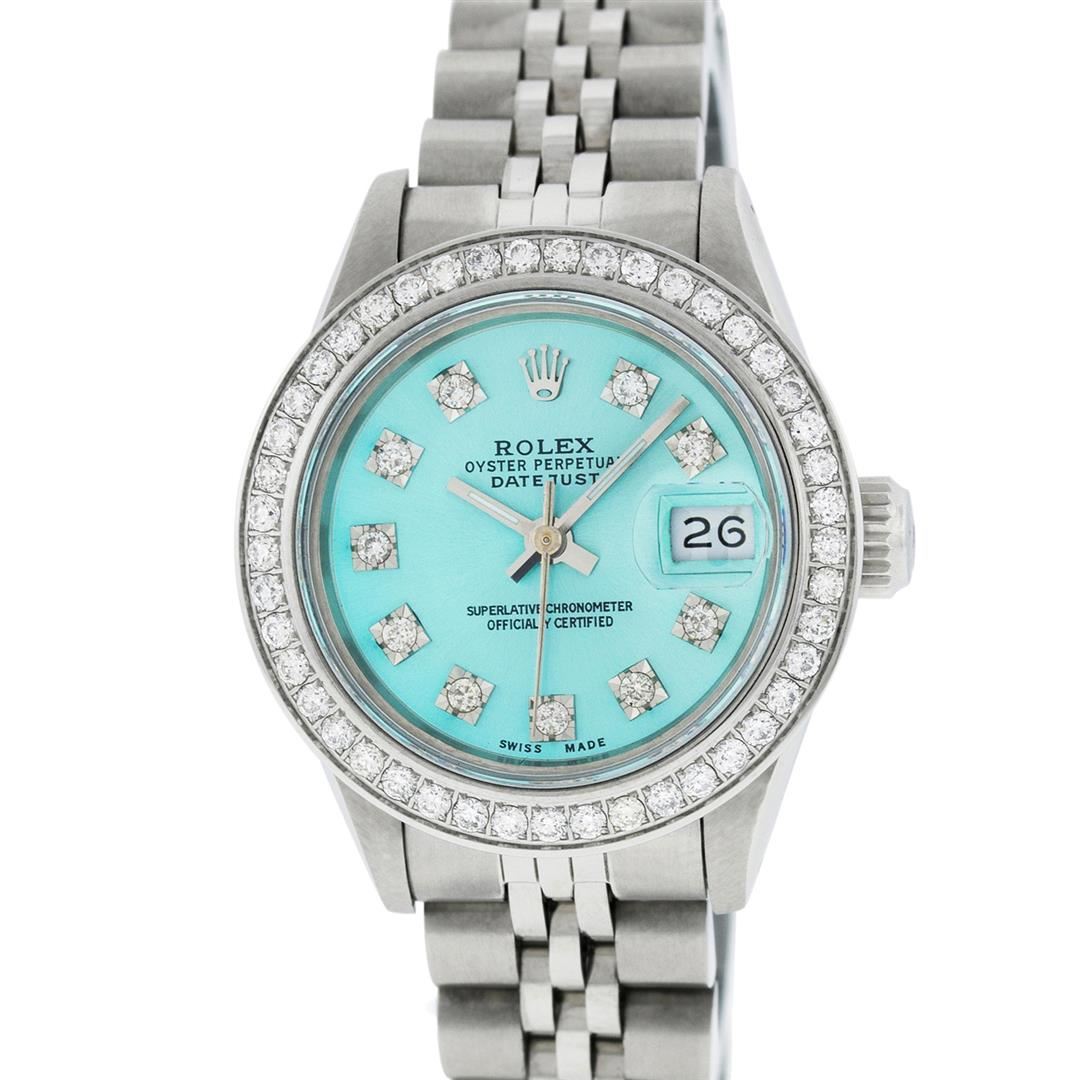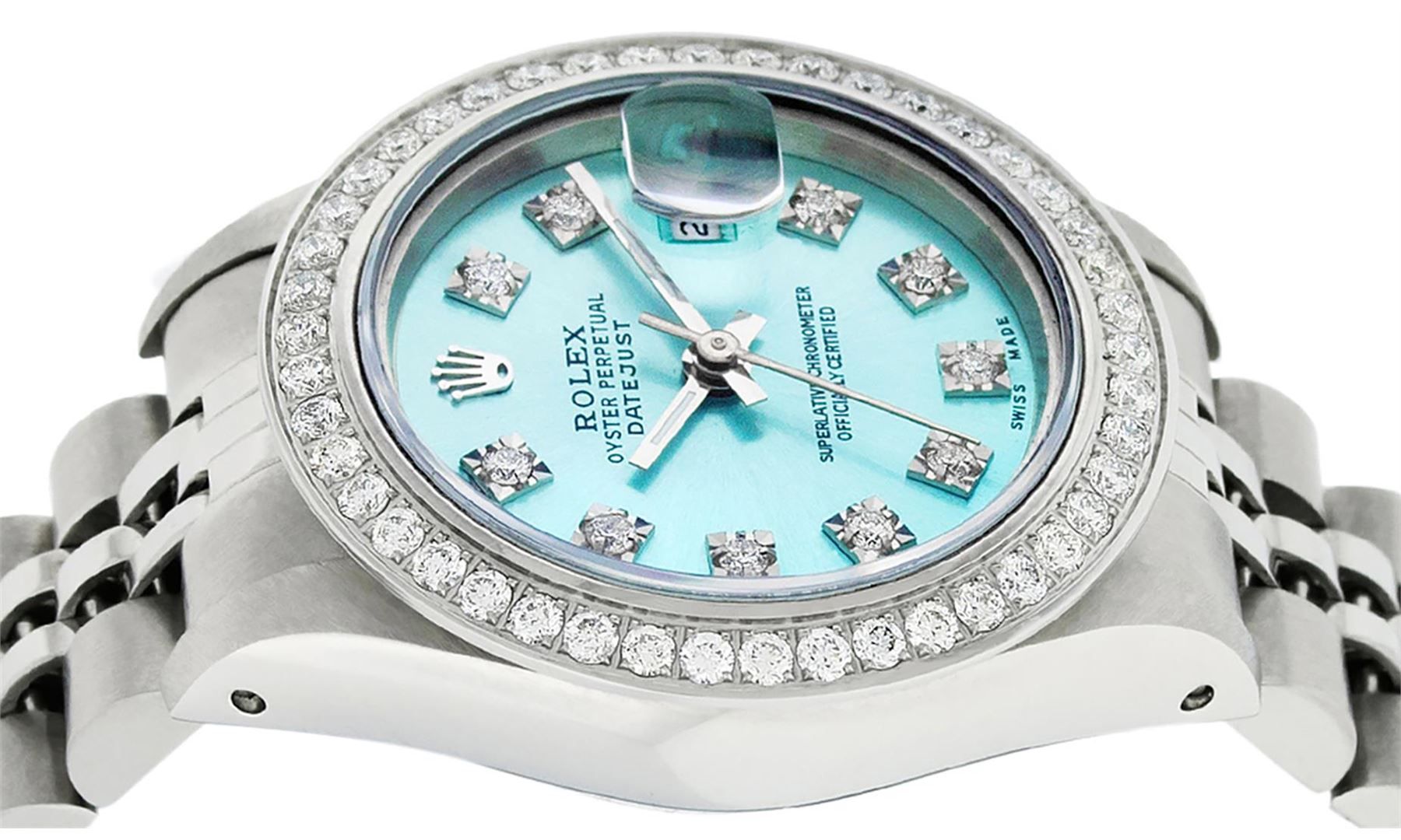One Ladies Stainless Pre Owned Steel Rolex Datejust Polished Bright with Satin Finish, Serviced & Electronically Tested, Stainless Steel Case: 26mm, Stainless Steel Crown, Custom Bezel: New Stainless Steel Beadset Diamond Bezel, Diamond Count: 44 Diamonds, Clarity: SI-VS, Color: G to H. Custom Crystal: New Sapphire With Date Window. Custom Hands: New Luminescent Hands. Rolex Movement: Automatic Winding Movement. Custom Dial: Refinished To Ice Blue With Custom Added Diamond Hour Markers, Diamond Count: 10 Diamonds in Dial G To H In Color, Clarity: SI-VS. Date Window: 3 O'Clock Position Date Display, Model: Datejust. Condition: G-6 Extra Fine. Rolex Bracelet: Stainless Steel Jubilee Band. Bright Polish & Satin Finish. 6.0 Inch Length, Adjustable. Standard Clasp, With Rolex Logo. This Watch Has Been Serviced Time Tested And Is In Excellent Condition It Is Free Of All Scratches And Dents.