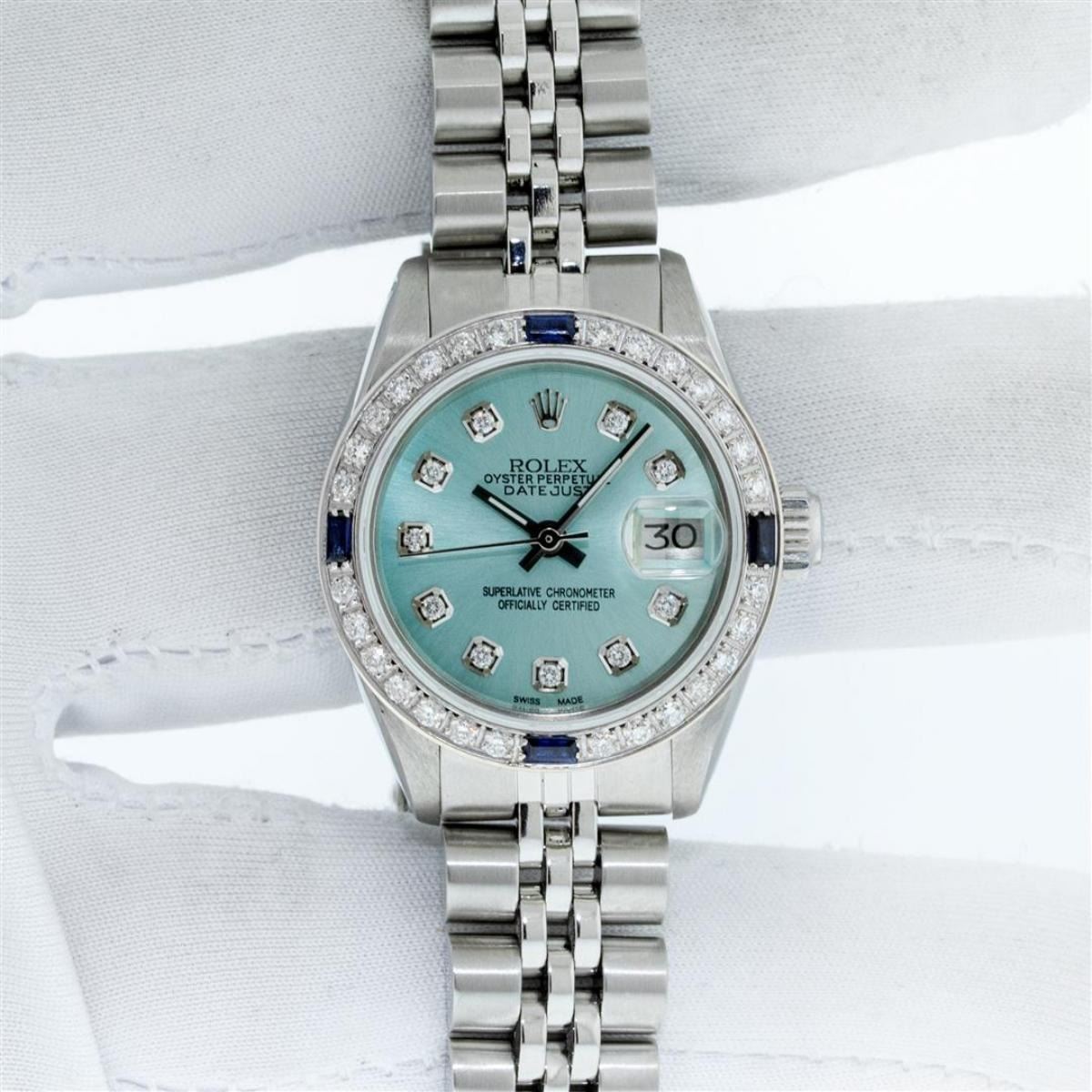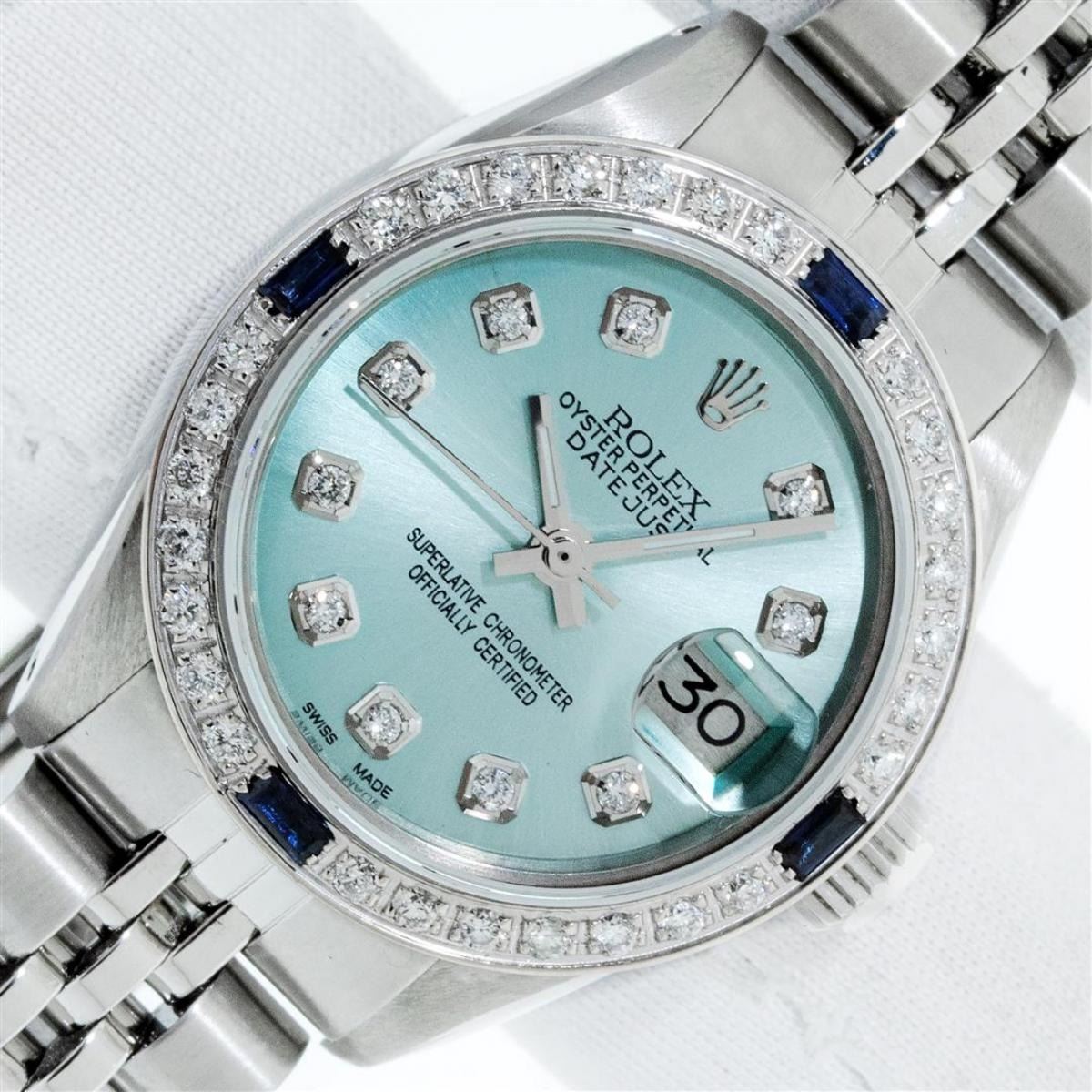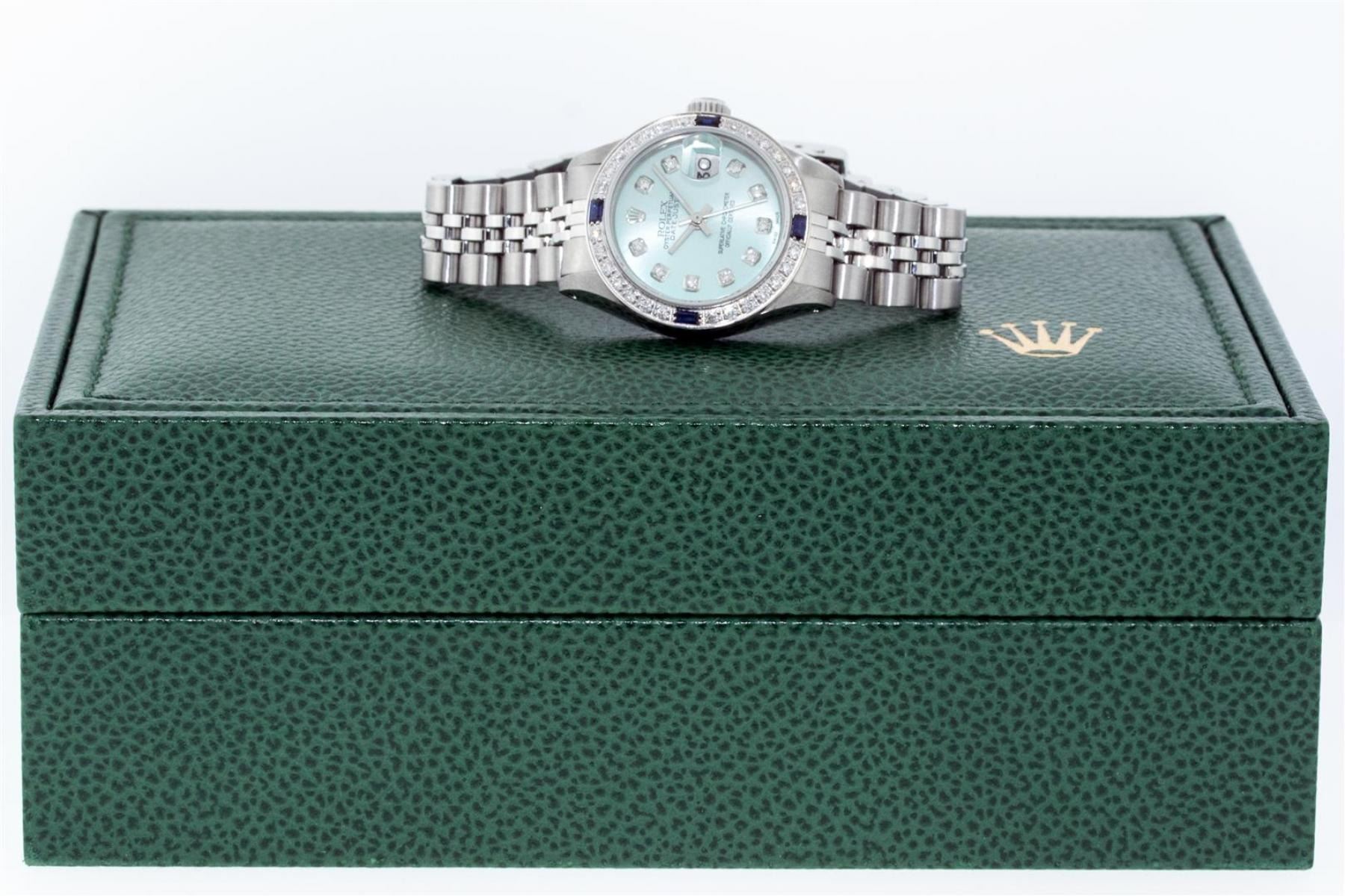 One Ladies Stainless Steel Rolex Datejust Polished Bright with Satin Finish, Serviced & Electronically Tested, Stainless Steel Case: 26mm, Stainless Steel Crown, Bezel: 14K White Gold Bezel. Custom Crystal: New Acrylic Cyclops Lens. Custom Hands: New Luminescent Hands. Movement: Automatic Winding Movement. Dial: Ice Blue Diamond Dial, Diamond Count: 10 Diamonds In Dial, Color: G to H, Clarity: SI-VS. Date Window: 3 O'Clock Position Date Display, Model: Datejust. Condition: G-6 Extra Fine. Bracelet: Stainless Steel Jubilee Band. Bright Polish & Satin Finish. 6.0 Inch Length, Adjustable. Standard Clasp, With Rolex Logo. This Watch Has Been Serviced Time Tested And Is In Excellent Condition It Is Free Of All Scratches And Dents. This Watch Comes With A Rolex Box.