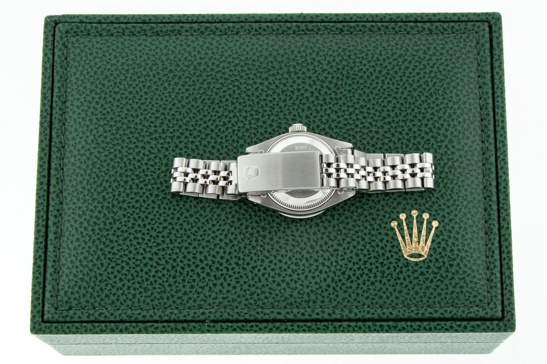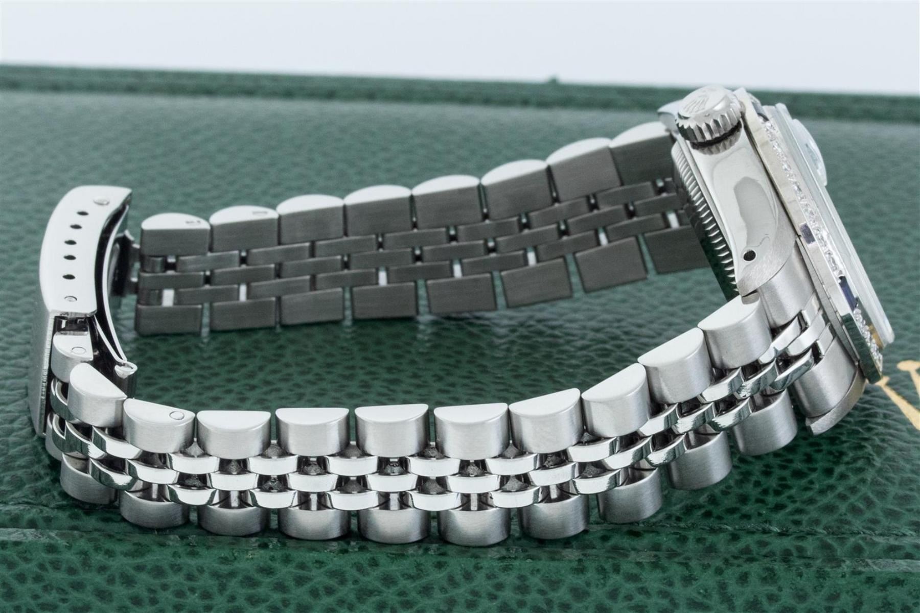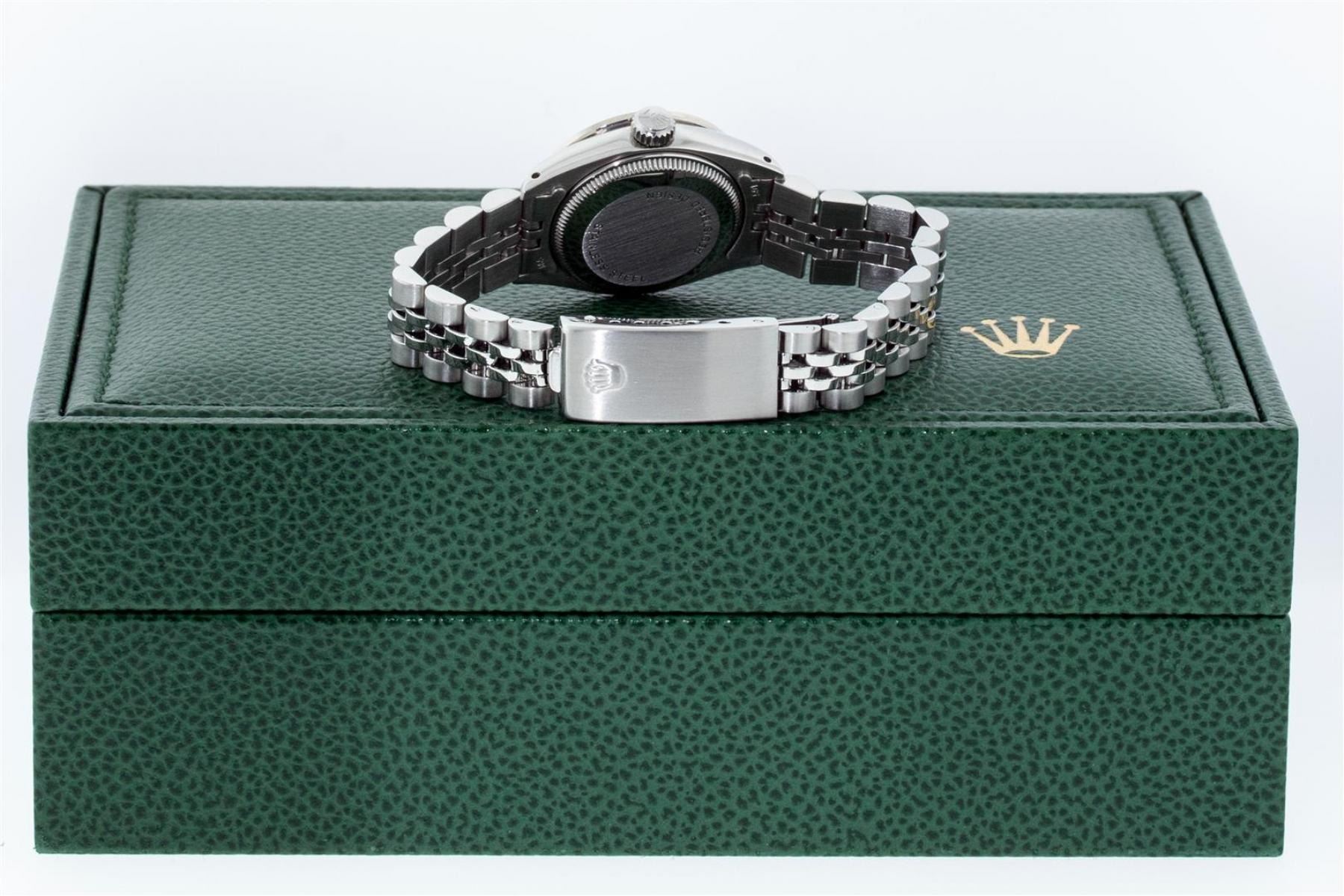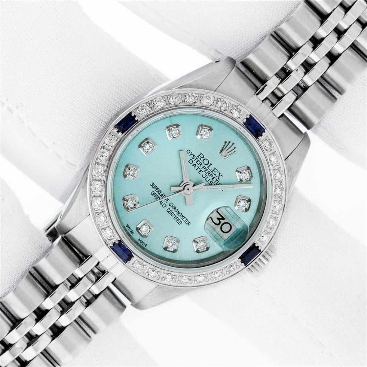 One Ladies Stainless Steel Rolex Datejust Polished Bright with Satin Finish, Serviced & Electronically Tested, Stainless Steel Case: 26mm, Stainless Steel Crown, Bezel: 14K White Gold Bezel. Custom Crystal: New Acrylic Cyclops Lens. Custom Hands: New Luminescent Hands. Movement: Automatic Winding Movement. Dial: Ice Blue Diamond Dial, Diamond Count: 10 Diamonds In Dial, Color: G to H, Clarity: SI-VS. Date Window: 3 O'Clock Position Date Display, Model: Datejust. Condition: G-6 Extra Fine. Bracelet: Stainless Steel Jubilee Band. Bright Polish & Satin Finish. 6.0 Inch Length, Adjustable. Standard Clasp, With Rolex Logo. This Watch Has Been Serviced Time Tested And Is In Excellent Condition It Is Free Of All Scratches And Dents. This Watch Comes With A Rolex Box.