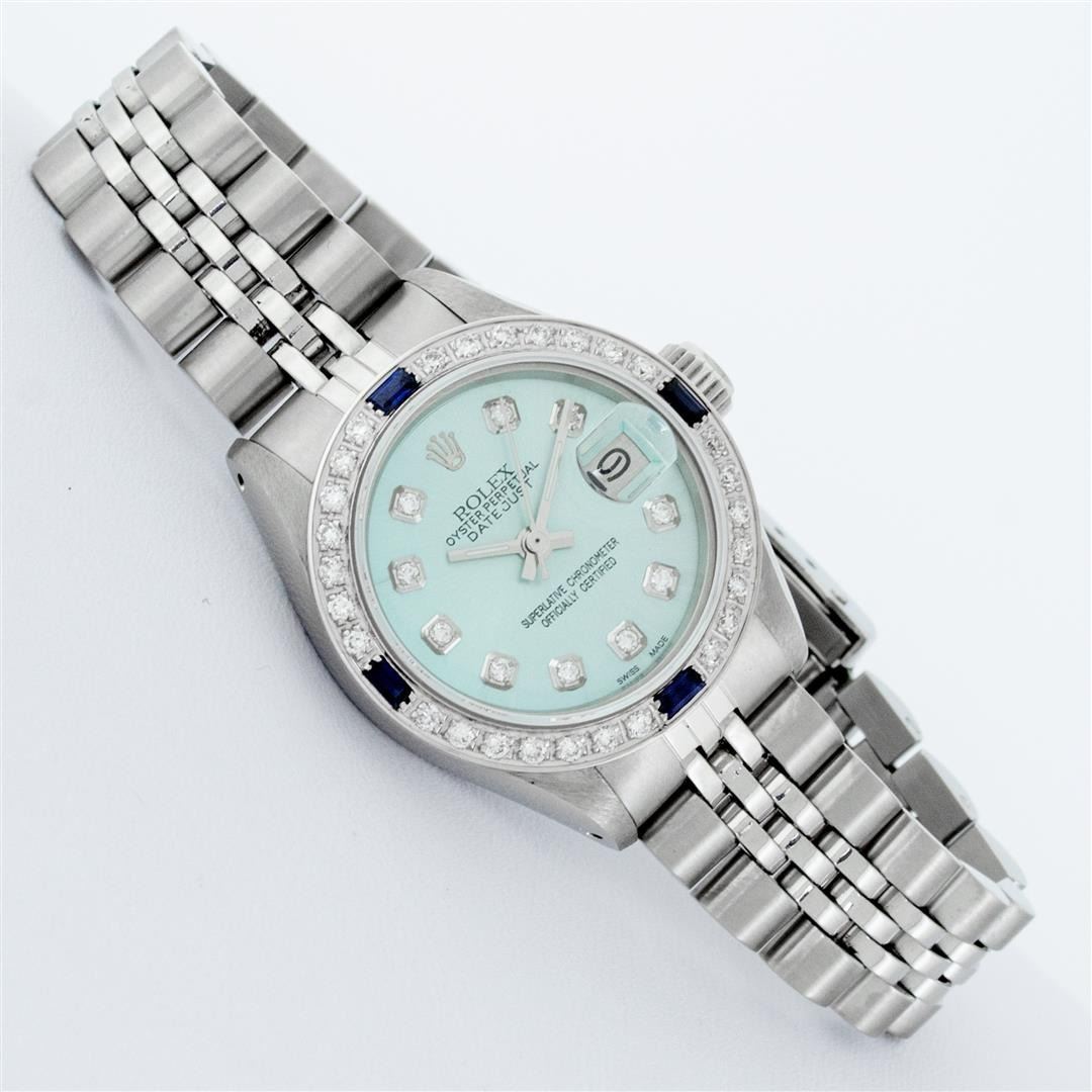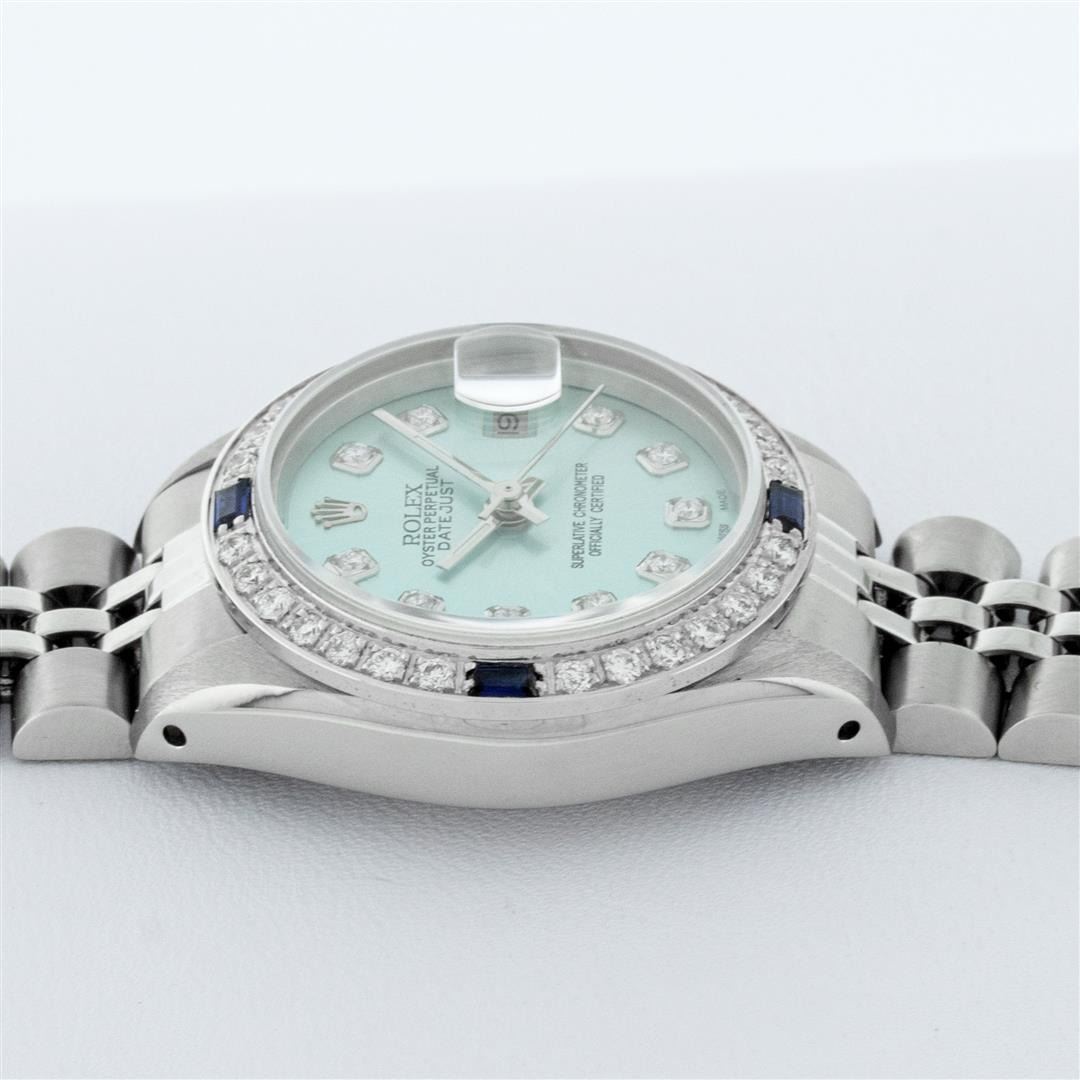 One Ladies Stainless Steel Rolex Datejust Polished Bright with Satin Finish, Serviced & Electronically Tested, Stainless Steel Case: 26mm, Stainless Steel Crown, Bezel: 14K White Gold Bezel. Custom Crystal: New Acrylic Cyclops Lens. Custom Hands: New Luminescent Hands. Movement: Automatic Winding Movement. Dial: Ice Blue Diamond Dial, Diamond Count: 10 Diamonds In Dial, Color: G to H, Clarity: SI-VS. Date Window: 3 O'Clock Position Date Display, Model: Datejust. Condition: G-6 Extra Fine. Bracelet: Stainless Steel Jubilee Band. Bright Polish & Satin Finish. 6.0 Inch Length, Adjustable. Standard Clasp, With Rolex Logo. This Watch Has Been Serviced Time Tested And Is In Excellent Condition It Is Free Of All Scratches And Dents.