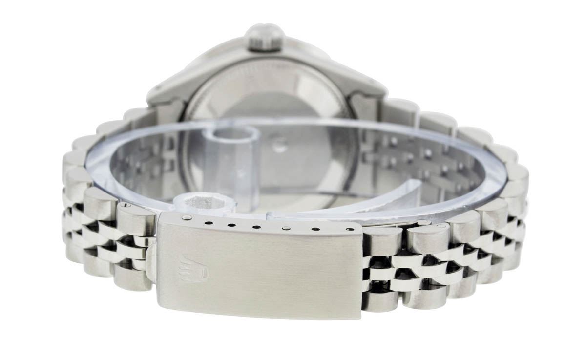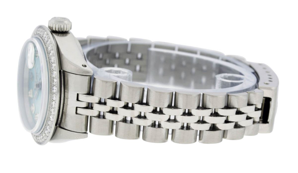 One Ladies Rolex Datejust Polished Bright with Satin Finish, Serviced & Electronically Tested, Stainless Steel Case:26mm, Stainless Steel Crown, Custom Bezel: Stainless Steel Beadset Diamond Bezel, Diamond Count: 44 Diamonds, Total Weight .90 Carat, Clarity: SI-VS, Color: G to H. Custom Crystal: Synthetic Sapphire Cyclops Lens. Movement: Automatic Winding Movement Caliber 2030. Custom Dial: Refinished Ice Blue Diamond With Dash Track, Diamond Count: 10 Diamonds in Dial G To H In Color, Clarity: SI-VS. Date Window: 3 O'Clock Position Date Display, Model: Datejust. Condition: G-6 Extra Fine. Bracelet: Stainless Steel Jubilee Band. Bright Polish & Satin Finish. 6.0 Inch Length, Adjustable. Standard Clasp, With Rolex Logo.