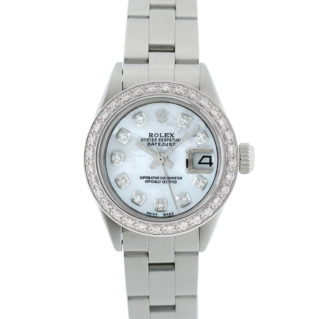 One Ladies Stainless Steel Rolex Datejust Polished Bright with Satin Finish, Serviced & Electronically Tested, Stainless Steel Case: 26mm, Stainless Steel Crown, Custom Bezel: New 18K White Gold Beadset Diamond Bezel, Diamond Count: 32 Diamonds, Total Weight .70 Carat, Clarity: SI-VS, Color: G to H. Custom Crystal: New Scratch Resistant Synthetic Sapphire Cyclops Lens. Custom Hands: New Luminescent Hands. Movement: Automatic Winding Movement. Custom Dial: Mother Of Pearl Diamond Dial, Diamond Count: 10 Diamonds In Dial, Color: G To H, Clarity: SI-VS. Date Window: 3 O'Clock Position Date Display, Model: Datejust. Condition: G-6 Extra Fine. Bracelet: Stainless Steel Oyster Band. Bright Polish & Satin Finish. 6.0 Inch Length, Adjustable. Standard Clasp, With Rolex Logo. This Watch Has Been Serviced Time Tested And Is In Excellent Condition It Is Free Of All Scratches And Dents.
