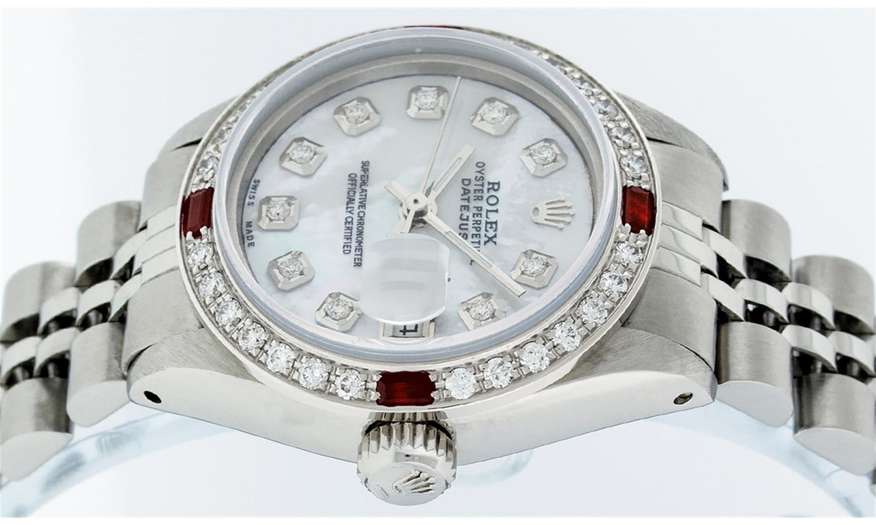 One Ladies Stainless Steel Rolex Datejust Polished Bright with Satin Finish, Serviced & Electronically Tested, Stainless Steel Case: 26mm, Stainless Steel Crown, Custom Bezel: New 18K White Gold Ruby Beadset Diamond Bezel, Diamond + Gem Count: 28 Diamonds + 4 Rubies. Total Weight .70 Carat, Clarity: SI-VS, Color: G to H. Custom Crystal: New Synthetic Sapphire Cyclops Lens. Custom Hands: New Luminescent Hands. Movement: Automatic Winding Movement Caliber 2030. Custom Dial: Refinished Mother Of Pearl With Diamond Hour Markers, Diamond Count: 10 Diamond in Dial, G To H In Color, Clarity: SI-VS. Date Window: 3 O'Clock Position Date Display, Model: Datejust. Condition: G-6 Extra Fine. Bracelet: Stainless Steel Jubilee. Bright Polish & Satin Finish. 6.0 Inch Length, Adjustable. Standard Clasp, With Rolex Logo. This Watch Has Been Serviced Time Tested And Is In Excellent Condition It Is Free Of All Scratches And Dents.