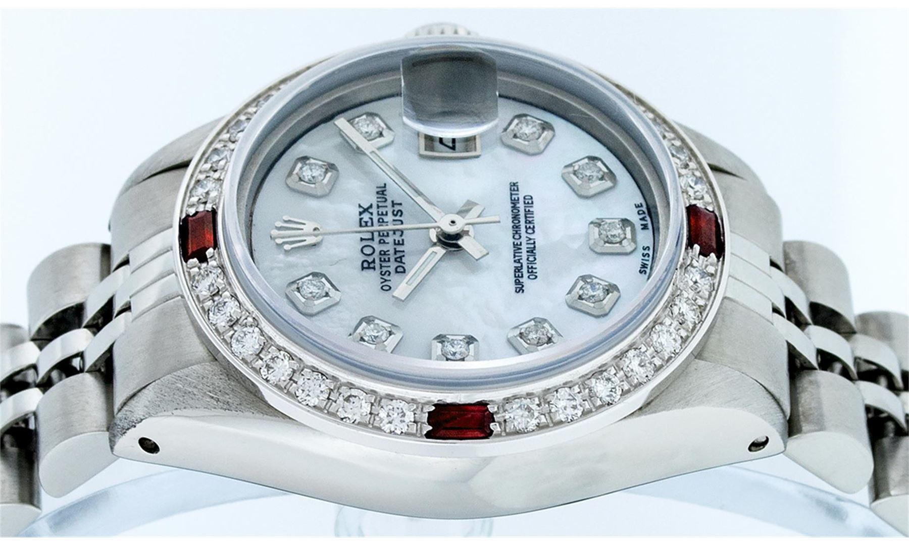 One Ladies Stainless Steel Rolex Datejust Polished Bright with Satin Finish, Serviced & Electronically Tested, Stainless Steel Case: 26mm, Stainless Steel Crown, Custom Bezel: New 18K White Gold Ruby Beadset Diamond Bezel, Diamond + Gem Count: 28 Diamonds + 4 Rubies. Total Weight .70 Carat, Clarity: SI-VS, Color: G to H. Custom Crystal: New Synthetic Sapphire Cyclops Lens. Custom Hands: New Luminescent Hands. Movement: Automatic Winding Movement Caliber 2030. Custom Dial: Refinished Mother Of Pearl With Diamond Hour Markers, Diamond Count: 10 Diamond in Dial, G To H In Color, Clarity: SI-VS. Date Window: 3 O'Clock Position Date Display, Model: Datejust. Condition: G-6 Extra Fine. Bracelet: Stainless Steel Jubilee. Bright Polish & Satin Finish. 6.0 Inch Length, Adjustable. Standard Clasp, With Rolex Logo. This Watch Has Been Serviced Time Tested And Is In Excellent Condition It Is Free Of All Scratches And Dents.