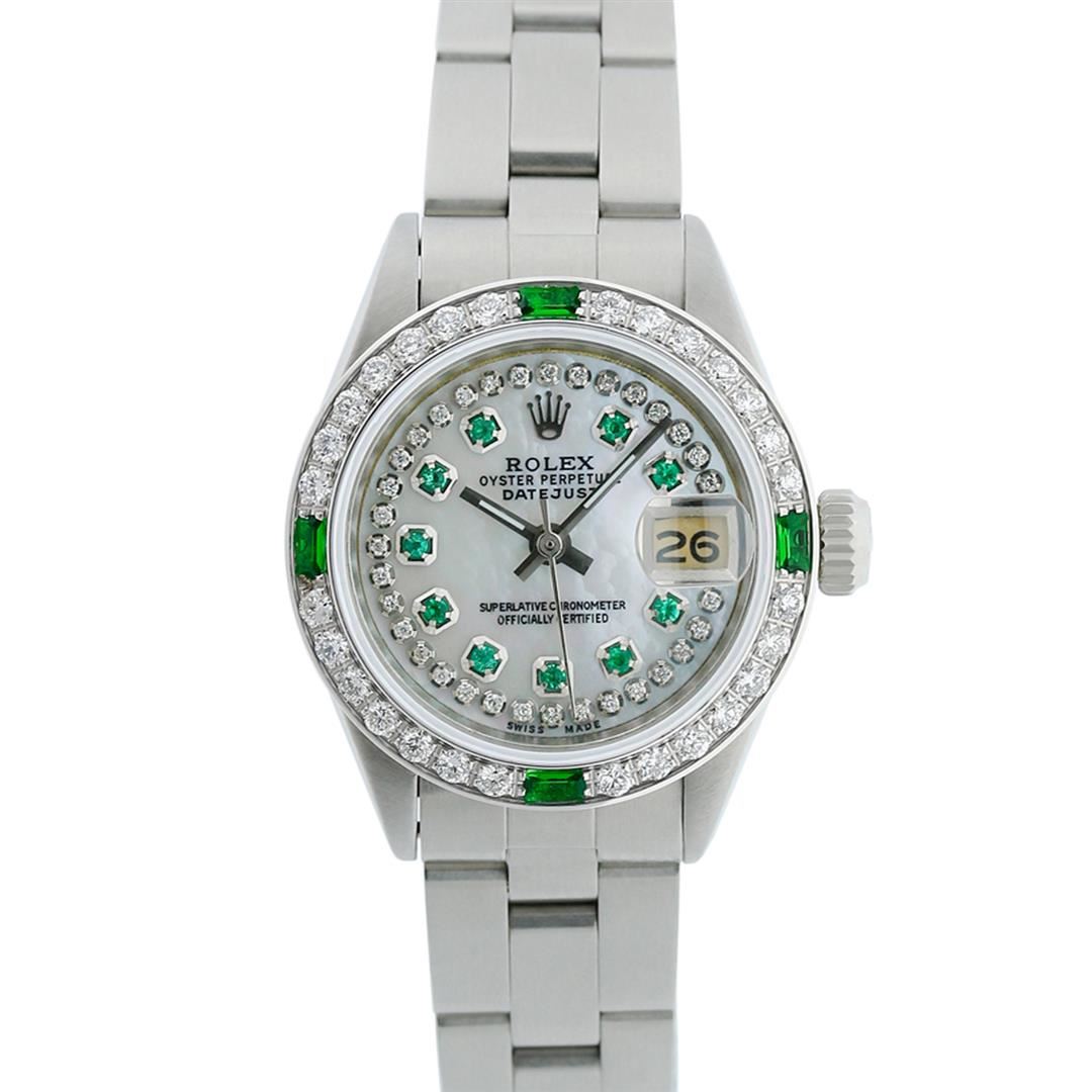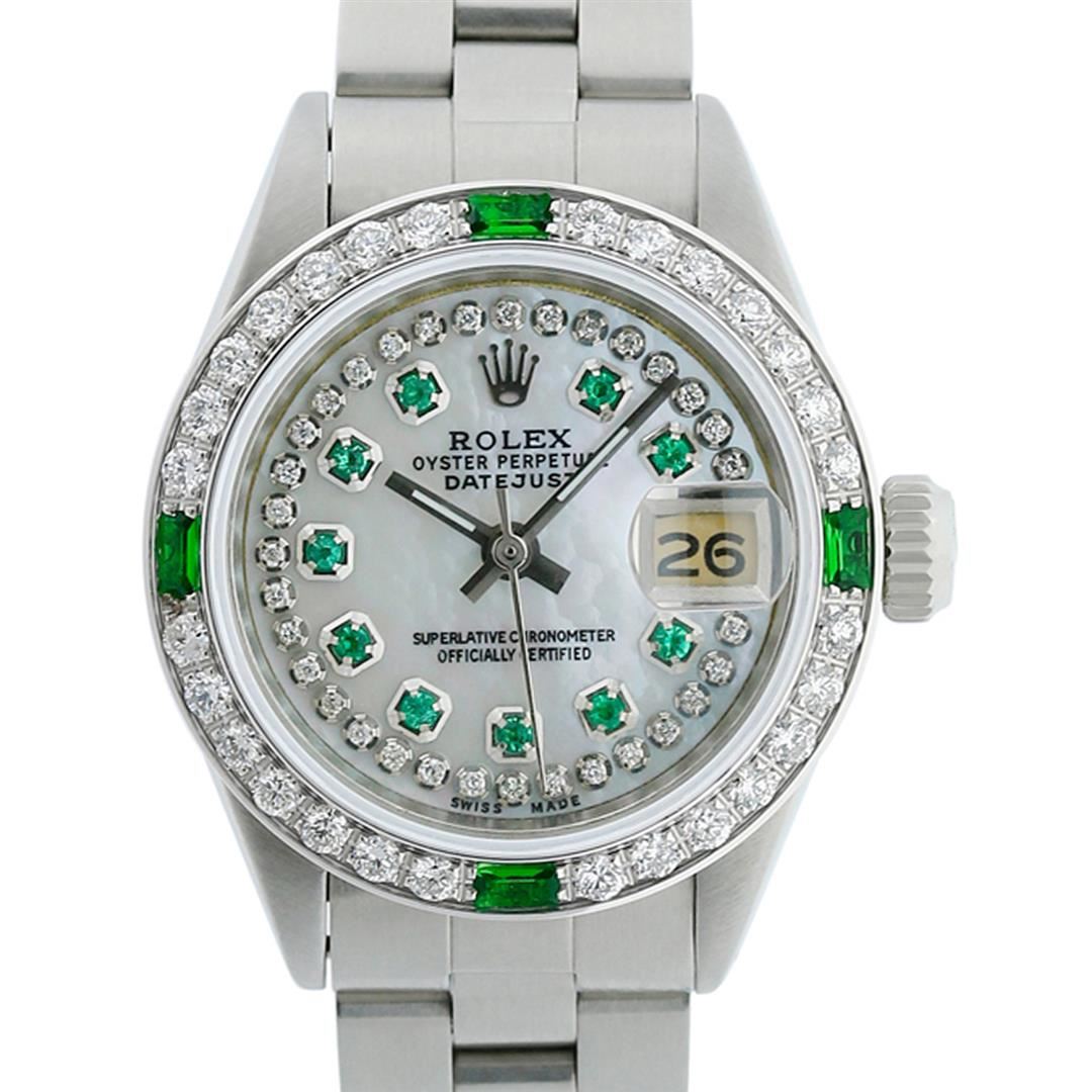 One Ladies Stainless Steel Rolex Oyster Perpetual Datejust Polished Bright with Satin Finish, Serviced & Electronically Tested, Stainless Steel Case: 26mm, Stainless Steel Crown. Custom Bezel: New 18K White Gold Beadset Emerald Diamond Bezel, Diamond Count: 28 Diamonds + 4 Emeralds. Total Weight .70 Carat, Clarity: SI-VS, Color: G to H. Custom Crystal: New Scratch Resistant Synthetic Sapphire Cyclops Lens. Custom Hands: New Luminescent Hands. Movement: Automatic Winding Movement. Custom Dial: Refinished Mother Of Pearl Emerald String Diamond Dial, Stone Count: 10 Diamonds + 33Emerlads In Dial, G To H In Color, Clarity: SI-VS. Date Window: 3 O'Clock Position Date Display, Model: Datejust. Condition: G-6 Extra Fine. Bracelet: Stainless Steel Oyster Band. Bright Polish & Satin Finish. 6.0 Inch Length, Adjustable. Standard Clasp, With Rolex Logo. This Watch Has Been Serviced Time Tested And Is In Excellent Condition It Is Free Of All Scratches And Dents.
