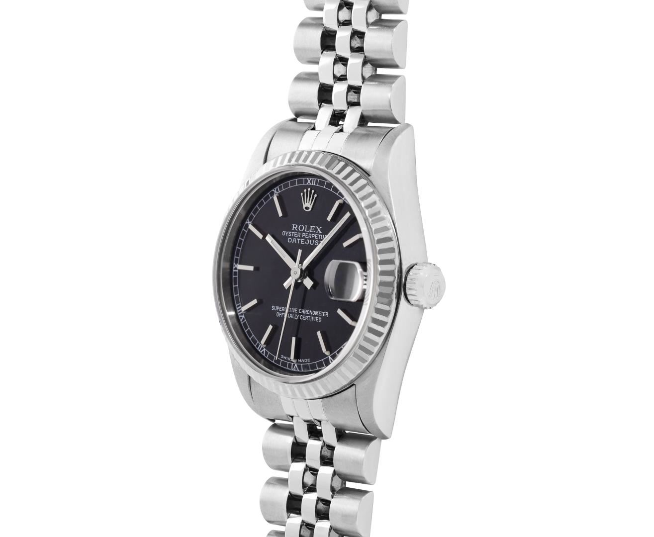 One Rolex Ladies Midsize Pre Owned Stainless Steel Datejust Wristwatch Polished with Satin Finish, Serviced And Electronically Tested, Stainless Steel Case: 31mm, Stainless Steel Crown, Bezel: 18K White Gold Fluted Bezel. Crystal: Sapphire With Magnifying Date Window. Hands: Luminescent Hands. Rolex Movement: Automatic Winding Movement 2235. Rolex Factory Dial: Black With Index Hour Markers. Date Window: 3 O'Clock Position Date Display, Model: Quickset Datejust. Condition: G-6 Extra Fine. Rolex Bracelet: Stainless Steel Jubilee Band. Bright Polish And Satin Finish. 6.0 Inch Length, Adjustable. Standard Clasp, With Rolex Logo. This Watch Has Been Serviced Time Tested And Is In Excellent Condition It Is Free Of All Scratches And Dents. This Watch Comes With A Rolex Box.