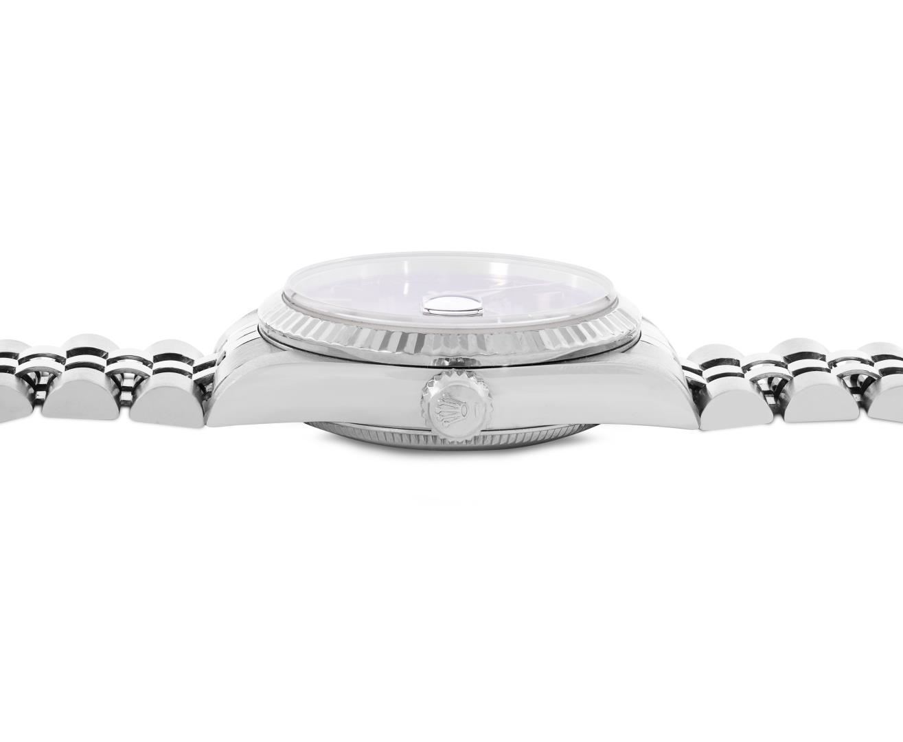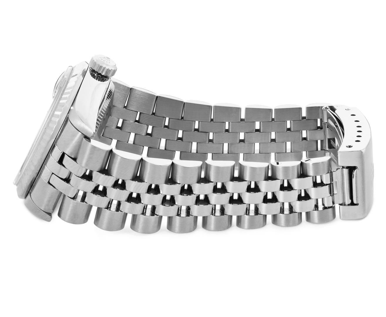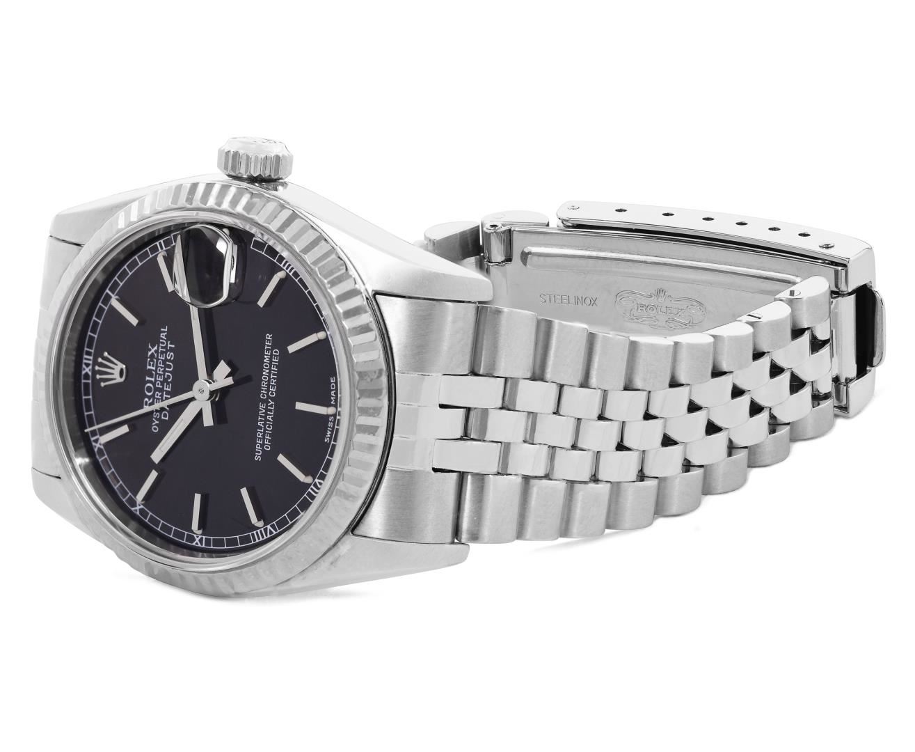 One Rolex Ladies Midsize Pre Owned Stainless Steel Datejust Wristwatch Polished with Satin Finish, Serviced And Electronically Tested, Stainless Steel Case: 31mm, Stainless Steel Crown, Bezel: 18K White Gold Fluted Bezel. Crystal: Sapphire With Magnifying Date Window. Hands: Luminescent Hands. Rolex Movement: Automatic Winding Movement 2235. Rolex Factory Dial: Black With Index Hour Markers. Date Window: 3 O'Clock Position Date Display, Model: Quickset Datejust. Condition: G-6 Extra Fine. Rolex Bracelet: Stainless Steel Jubilee Band. Bright Polish And Satin Finish. 6.0 Inch Length, Adjustable. Standard Clasp, With Rolex Logo. This Watch Has Been Serviced Time Tested And Is In Excellent Condition It Is Free Of All Scratches And Dents. This Watch Comes With A Rolex Box.