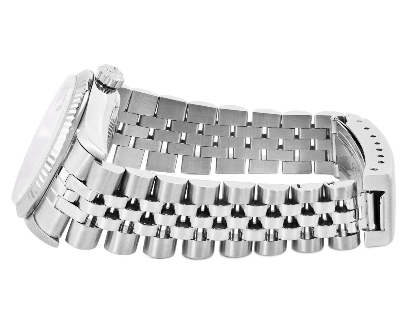 One Rolex Ladies Midsize Pre Owned Stainless Steel Datejust Wristwatch Polished with Satin Finish, Serviced And Electronically Tested, Stainless Steel Case: 31mm, Stainless Steel Crown, Bezel: 18K White Gold Fluted Bezel. Crystal: Sapphire With Magnifying Date Window. Hands: Solid Hands. Rolex Movement: Automatic Winding Movement 2235. Rolex Factory Dial: Cream Dial With Arabic Hour Markers. Date Window: 3 O'Clock Position Date Display, Model: Quickset Datejust. Condition: G-6 Extra Fine. Rolex Bracelet: Stainless Steel Jubilee Band. Bright Polish And Satin Finish. 6.0 Inch Length, Adjustable. Standard Clasp, With Rolex Logo. This Watch Has Been Serviced Time Tested And Is In Excellent Condition It Is Free Of All Scratches And Dents. This Watch Comes With A Rolex Box.