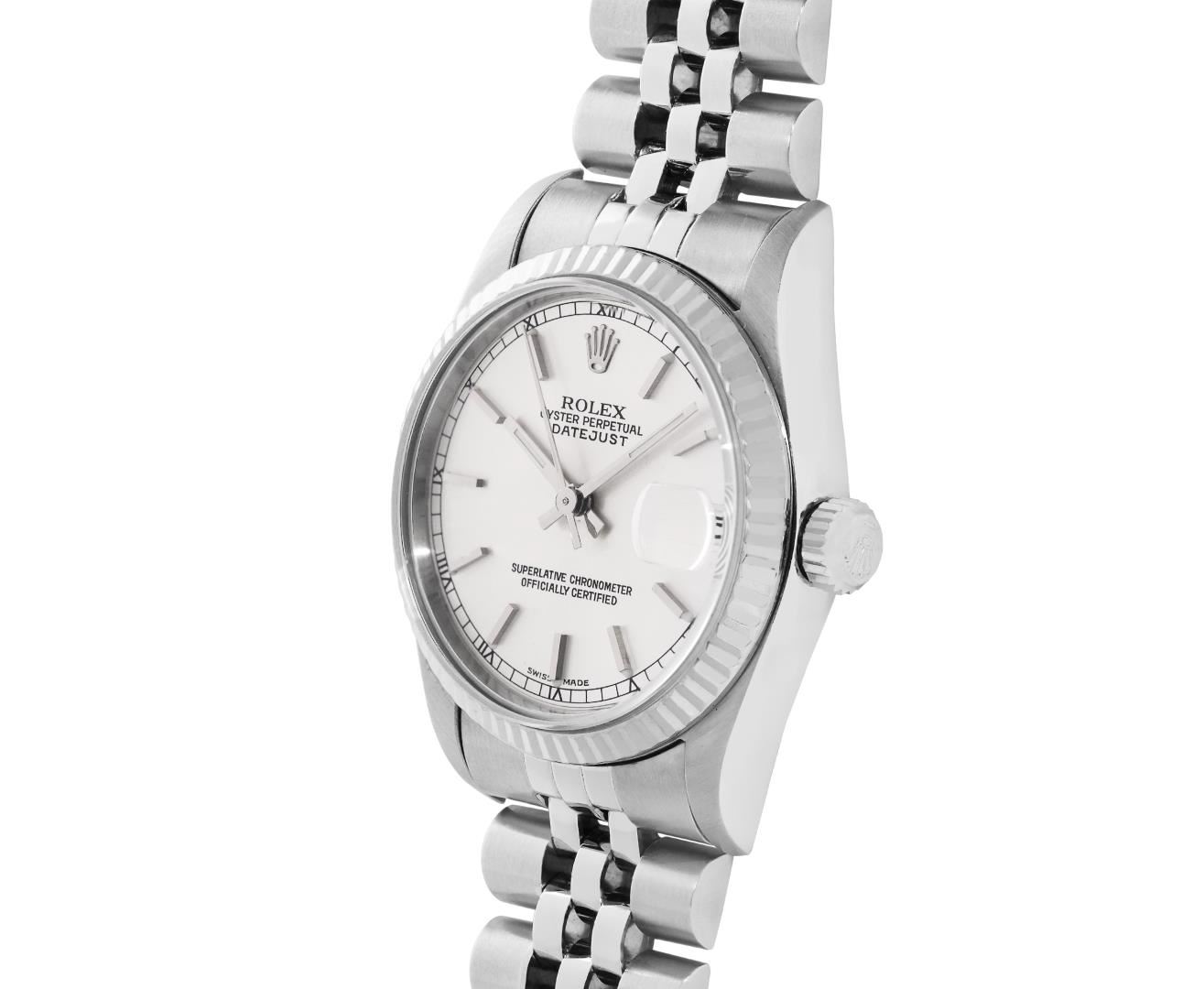 One Rolex Ladies Sapphire Pre Owned Stainless Steel Datejust Wristwatch Polished with Satin Finish, Serviced And Electronically Tested, Stainless Steel Case: 31mm, Stainless Steel Crown, Bezel: 18K White Gold Fluted Bezel. Crystal: Sapphire With Magnifying Date Window. Hands: Luminescent Hands. Rolex Movement: Automatic Winding Movement 2235. Rolex Factory Dial: Silver With Index Hour Markers. Date Window: 3 O'Clock Position Date Display, Model: Quickset Datejust. Condition: G-6 Extra Fine. Rolex Bracelet: Stainless Steel Jubilee Band. Bright Polish And Satin Finish. 6.0 Inch Length, Adjustable. Standard Clasp, With Rolex Logo. This Watch Has Been Serviced Time Tested And Is In Excellent Condition It Is Free Of All Scratches And Dents.
