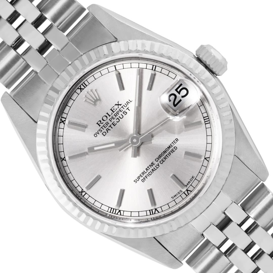 One Rolex Ladies Sapphire Pre Owned Stainless Steel Datejust Wristwatch Polished with Satin Finish, Serviced And Electronically Tested, Stainless Steel Case: 31mm, Stainless Steel Crown, Bezel: 18K White Gold Fluted Bezel. Crystal: Sapphire With Magnifying Date Window. Hands: Luminescent Hands. Rolex Movement: Automatic Winding Movement 2235. Rolex Factory Dial: Silver With Index Hour Markers. Date Window: 3 O'Clock Position Date Display, Model: Quickset Datejust. Condition: G-6 Extra Fine. Rolex Bracelet: Stainless Steel Jubilee Band. Bright Polish And Satin Finish. 6.0 Inch Length, Adjustable. Standard Clasp, With Rolex Logo. This Watch Has Been Serviced Time Tested And Is In Excellent Condition It Is Free Of All Scratches And Dents.