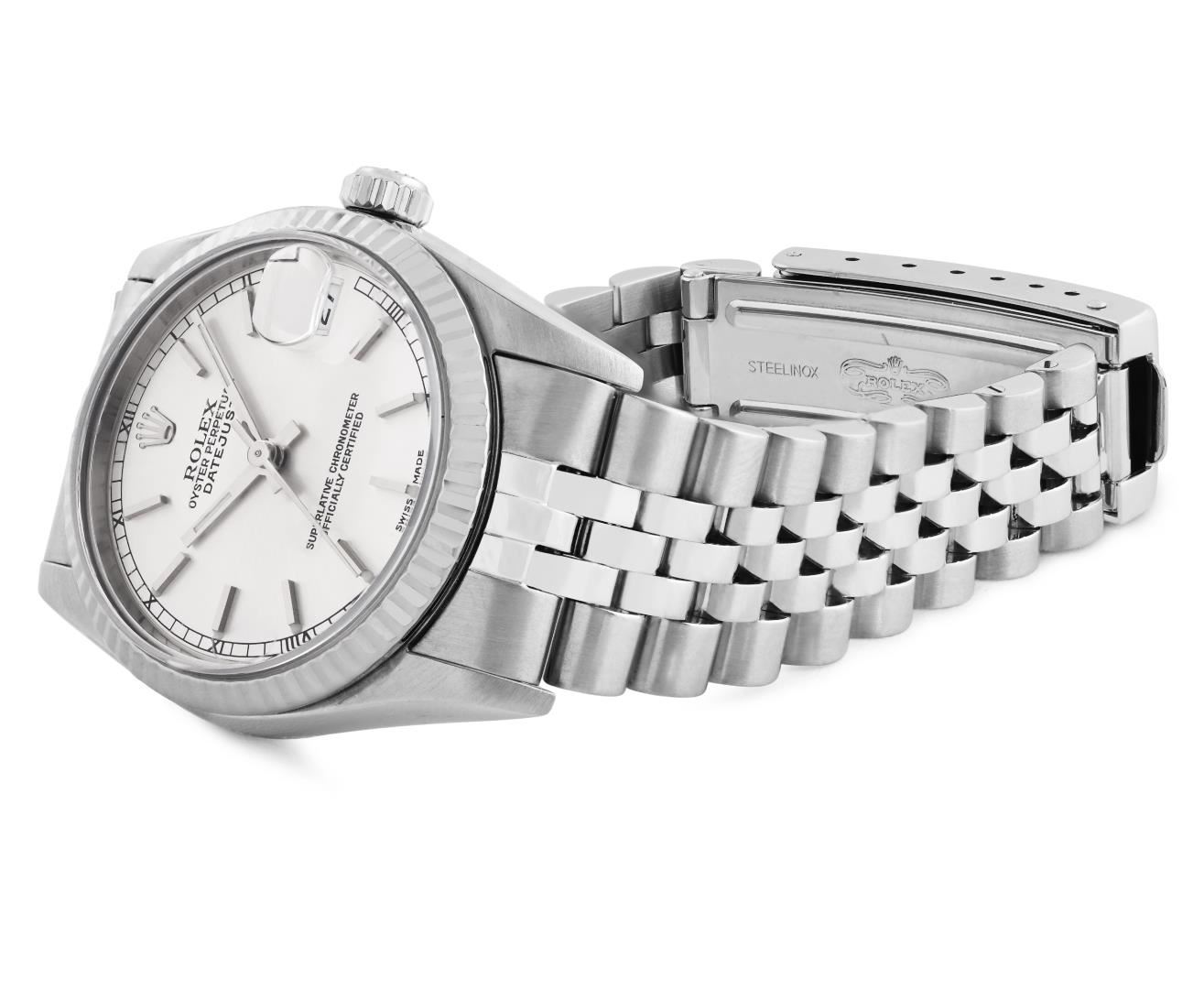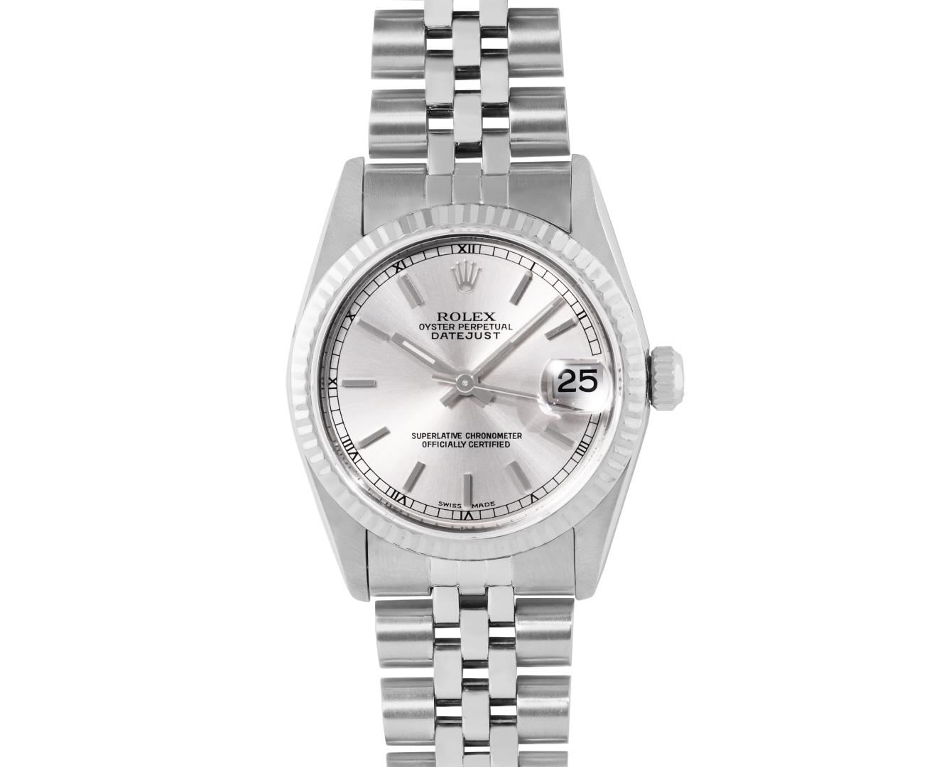 One Rolex Ladies Sapphire Pre Owned Stainless Steel Datejust Wristwatch Polished with Satin Finish, Serviced And Electronically Tested, Stainless Steel Case: 31mm, Stainless Steel Crown, Bezel: 18K White Gold Fluted Bezel. Crystal: Sapphire With Magnifying Date Window. Hands: Luminescent Hands. Rolex Movement: Automatic Winding Movement 2235. Rolex Factory Dial: Silver With Index Hour Markers. Date Window: 3 O'Clock Position Date Display, Model: Quickset Datejust. Condition: G-6 Extra Fine. Rolex Bracelet: Stainless Steel Jubilee Band. Bright Polish And Satin Finish. 6.0 Inch Length, Adjustable. Standard Clasp, With Rolex Logo. This Watch Has Been Serviced Time Tested And Is In Excellent Condition It Is Free Of All Scratches And Dents.