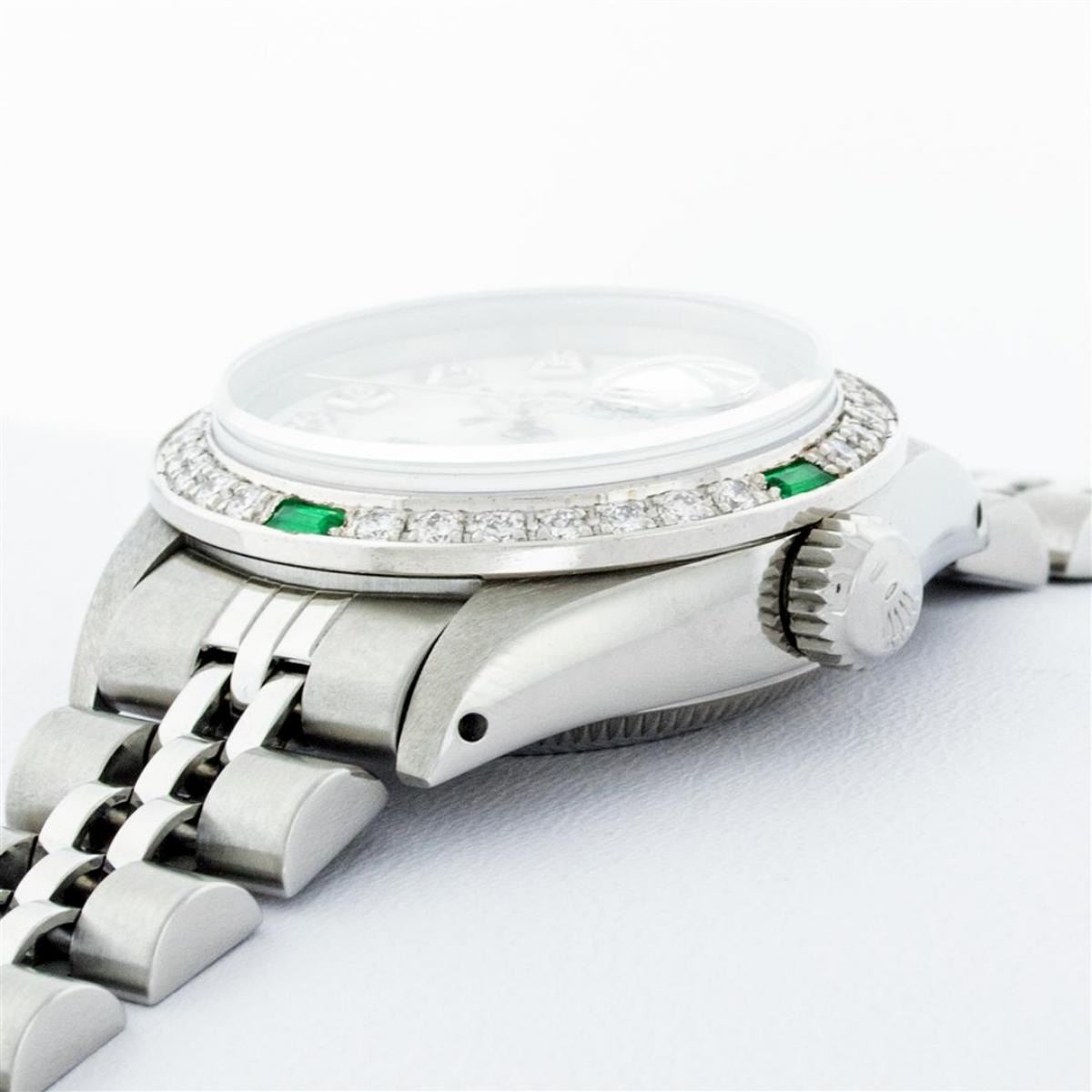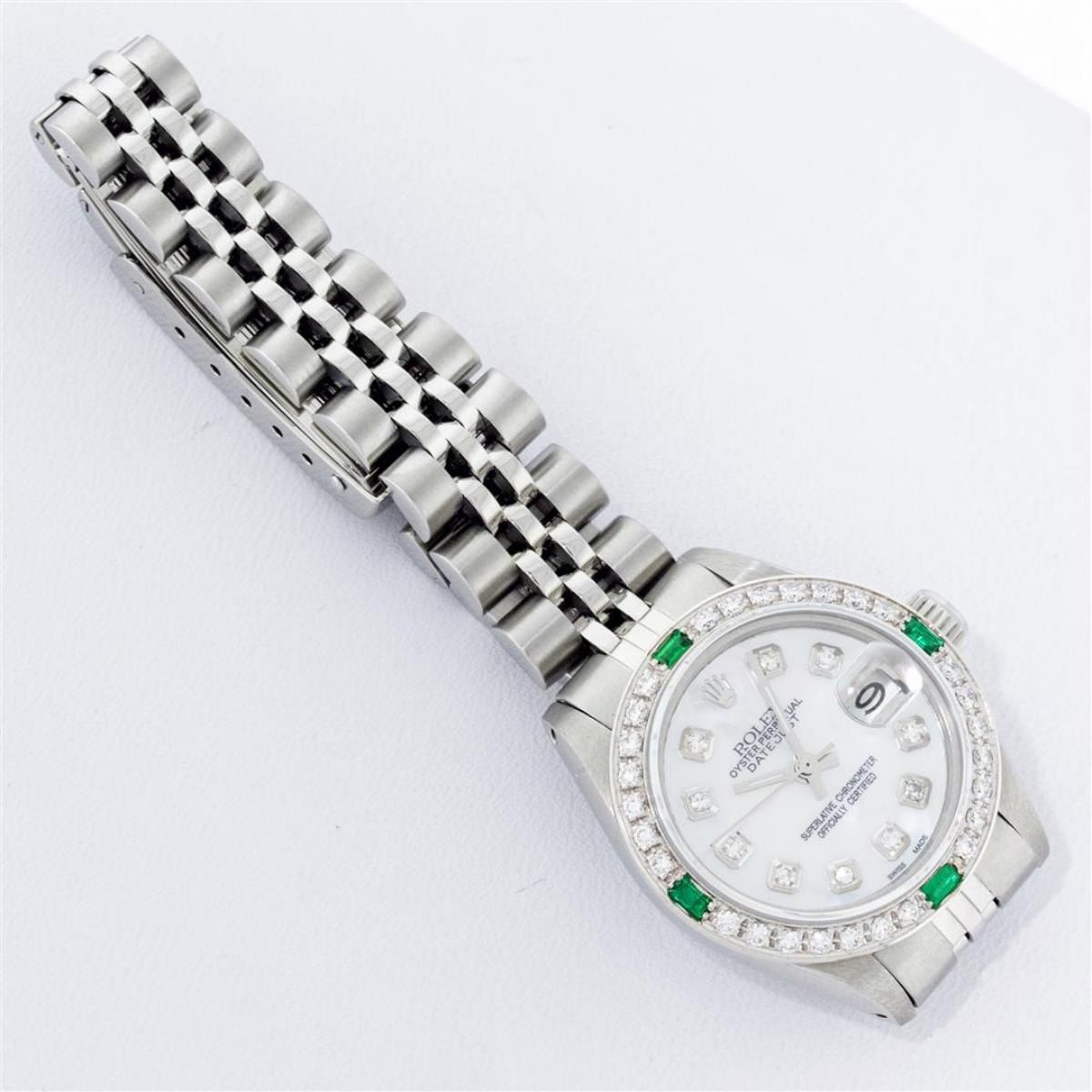One Ladies Stainless Steel Rolex Datejust Polished Bright with Satin Finish, Serviced & Electronically Tested, Stainless Steel Case: 26mm, Stainless Steel Crown, Custom Bezel: New 18K White Gold Synthetic Emerald Beadset Diamond Bezel, Diamond + Gem Count: 28 Diamonds + 4 Synthetic Emeralds. Total Weight .70 Carat, Clarity: SI-VS, Color: G to H. Custom Crystal: New Synthetic Sapphire Cyclops Lens. Custom Hands: New Luminescent Hands. Movement: Automatic Winding Movement . Custom Dial: Refinished Mother Of Pearl With Diamond Hour Markers, 10 Diamond in Dial G To H In Color, Clarity: SI-VS. Date Window: 3 O'Clock Position Date Display, Model: Datejust. Condition: G-6 Extra Fine. Bracelet: Stainless Steel Jubilee. Bright Polish & Satin Finish. 6.0 Inch Length, Adjustable. Standard Clasp, With Rolex Logo. This Watch Has Been Serviced Time Tested And Is In Excellent Condition It Is Free Of All Scratches And Dents.