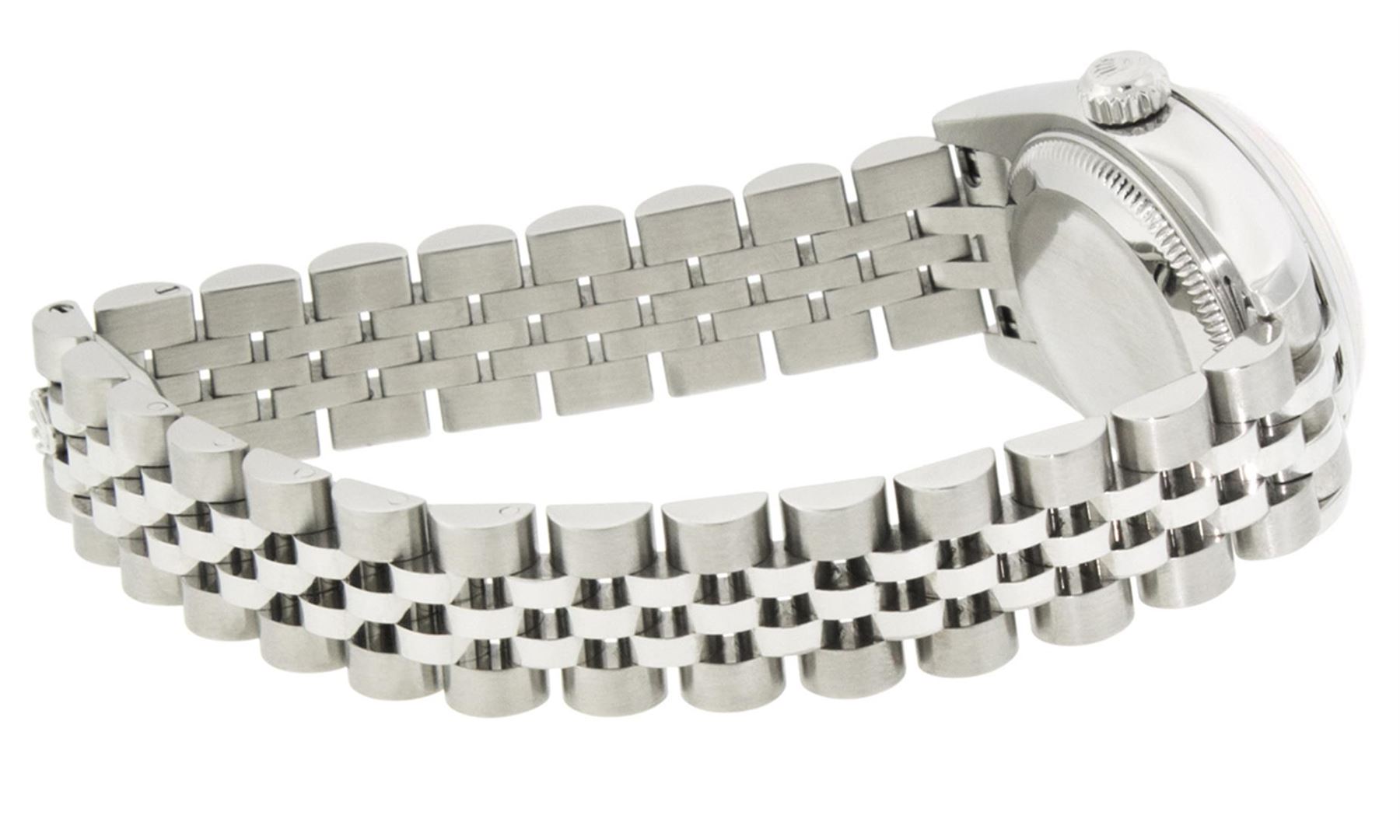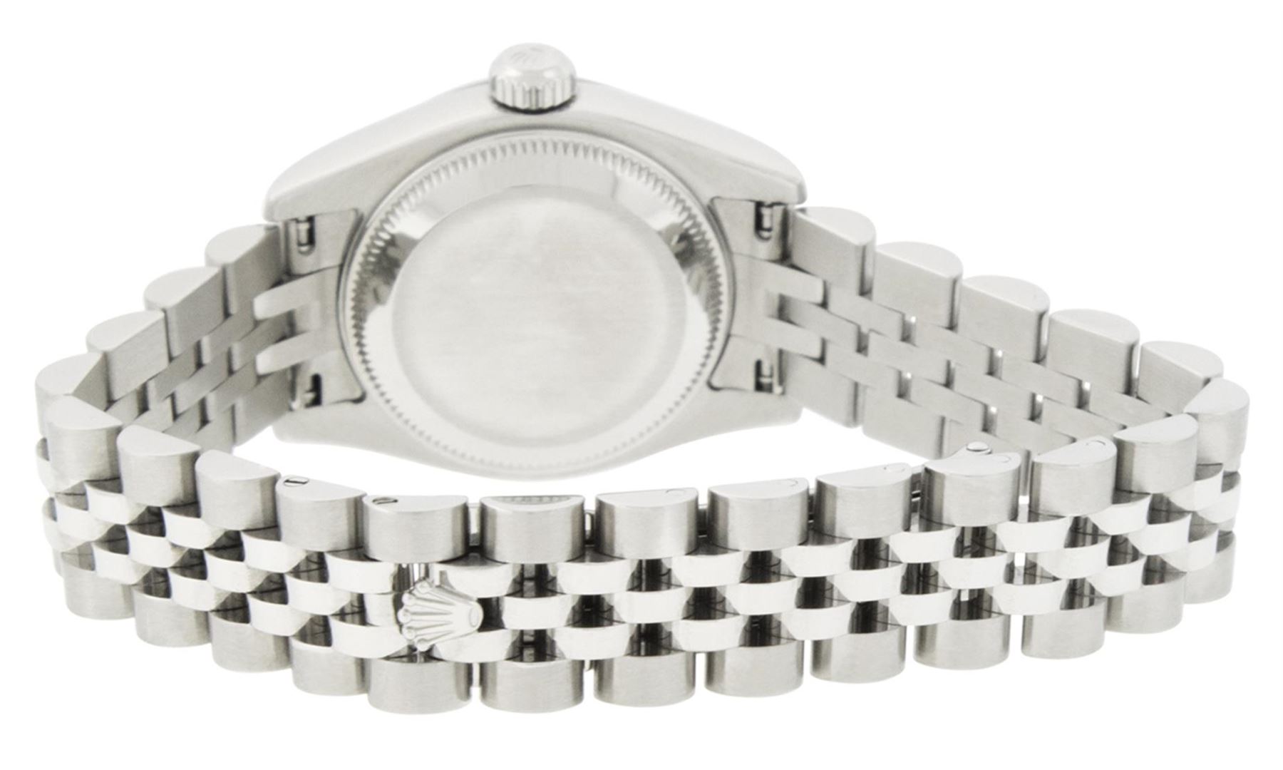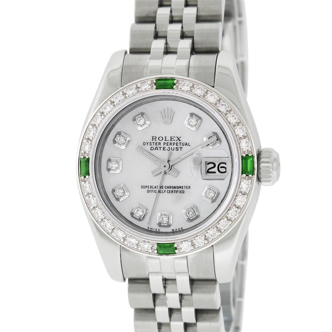 One Ladies Pre Owned Quickset Ladies Stainless Steel Rolex Datejust Polished Bright with Satin Finish, Serviced & Electronically Tested, Stainless Steel Case: 26mm, Stainless Steel Crown, Custom Bezel: New 18K White Gold Beadset + Emerald Diamond Bezel, S