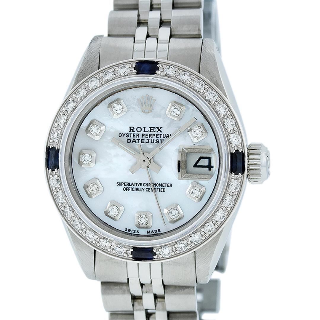 One Ladies Stainless Steel Rolex Datejust Polished Bright with Satin Finish, Serviced & Electronically Tested, Stainless Steel Case: 26mm, Stainless Steel Crown, Custom Bezel: New 18K White Gold Sapphire Beadset Diamond Bezel, Diamond + Gem Count: 28 Diamonds + 4 Sapphires Total Weight .70 Carat, Clarity: SI-VS, Color: G to H. Custom Crystal: New Synthetic Sapphire Cyclops Lens. Custom Hands: New Luminescent Hands. Movement: Automatic Winding Movement. Custom Dial: Refinished Mother Of Pearl With Diamond Hour Markers, 10 Diamond in Dial, G To H In Color, Clarity: SI-VS. Date Window: 3 O'Clock Position Date Display, Model: Datejust. Condition: G-6 Extra Fine. Bracelet: Stainless Steel Jubilee. Bright Polish & Satin Finish. 6.0 Inch Length, Adjustable. Standard Clasp, With Rolex Logo. This Watch Has Been Serviced Time Tested And Is In Excellent Condition It Is Free Of All Scratches And Dents.