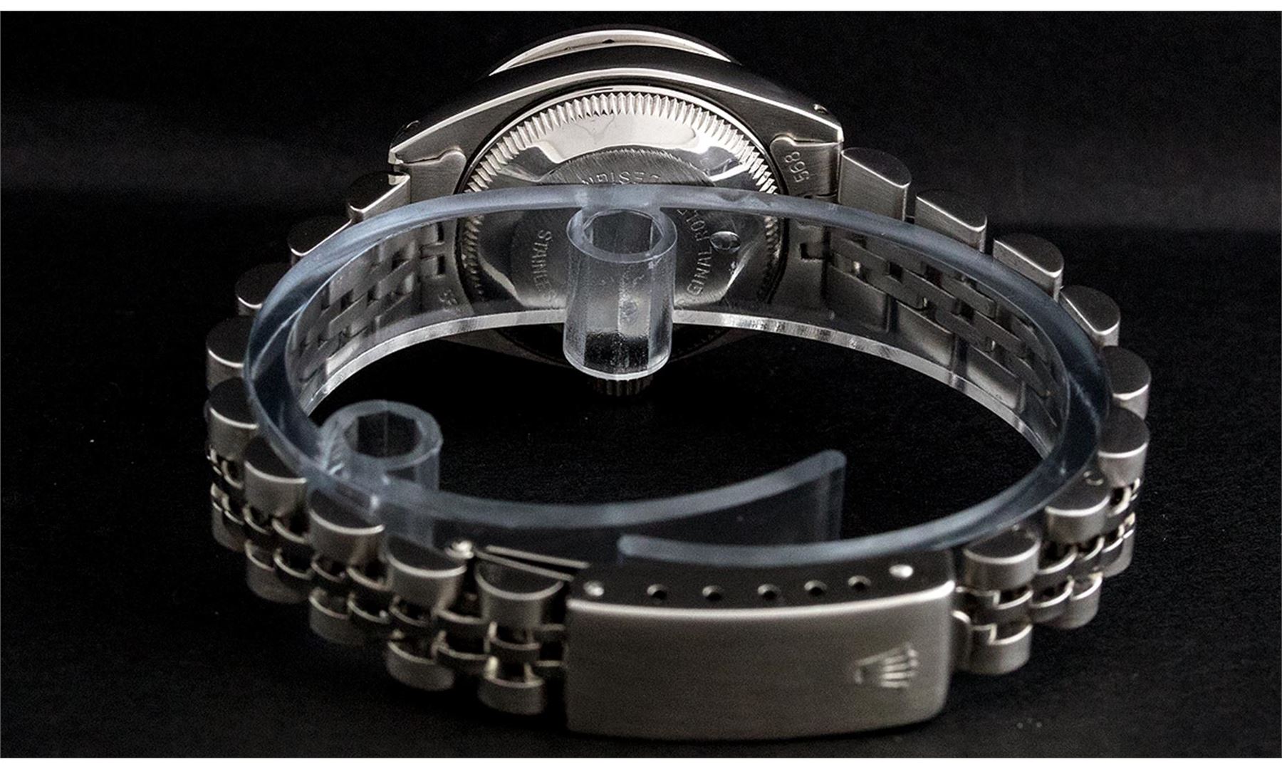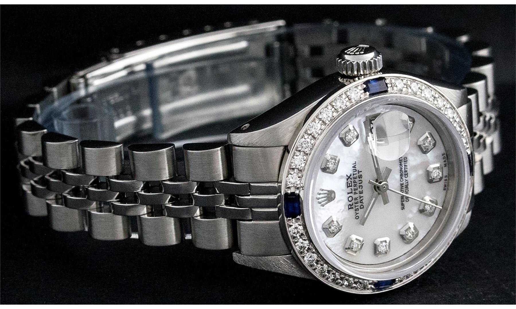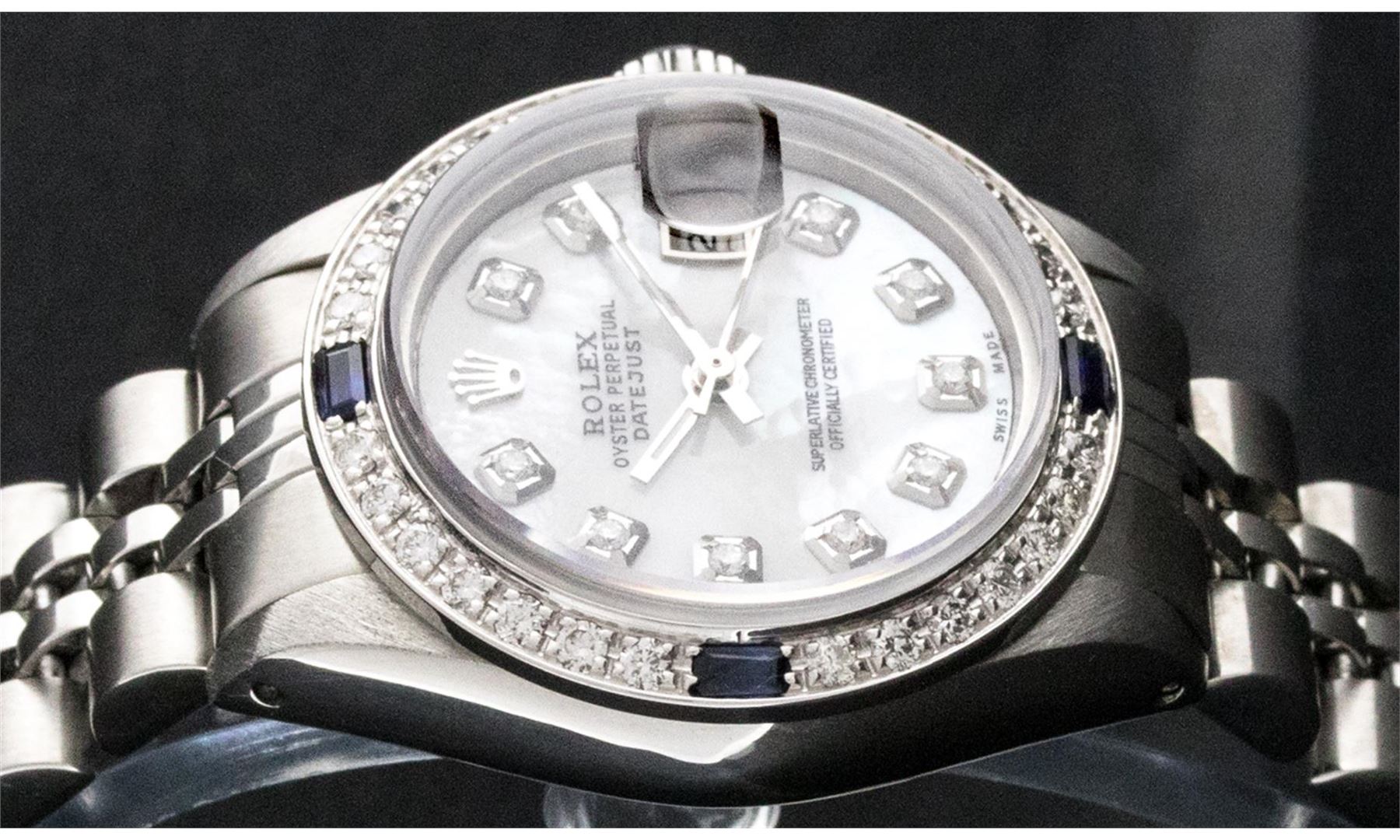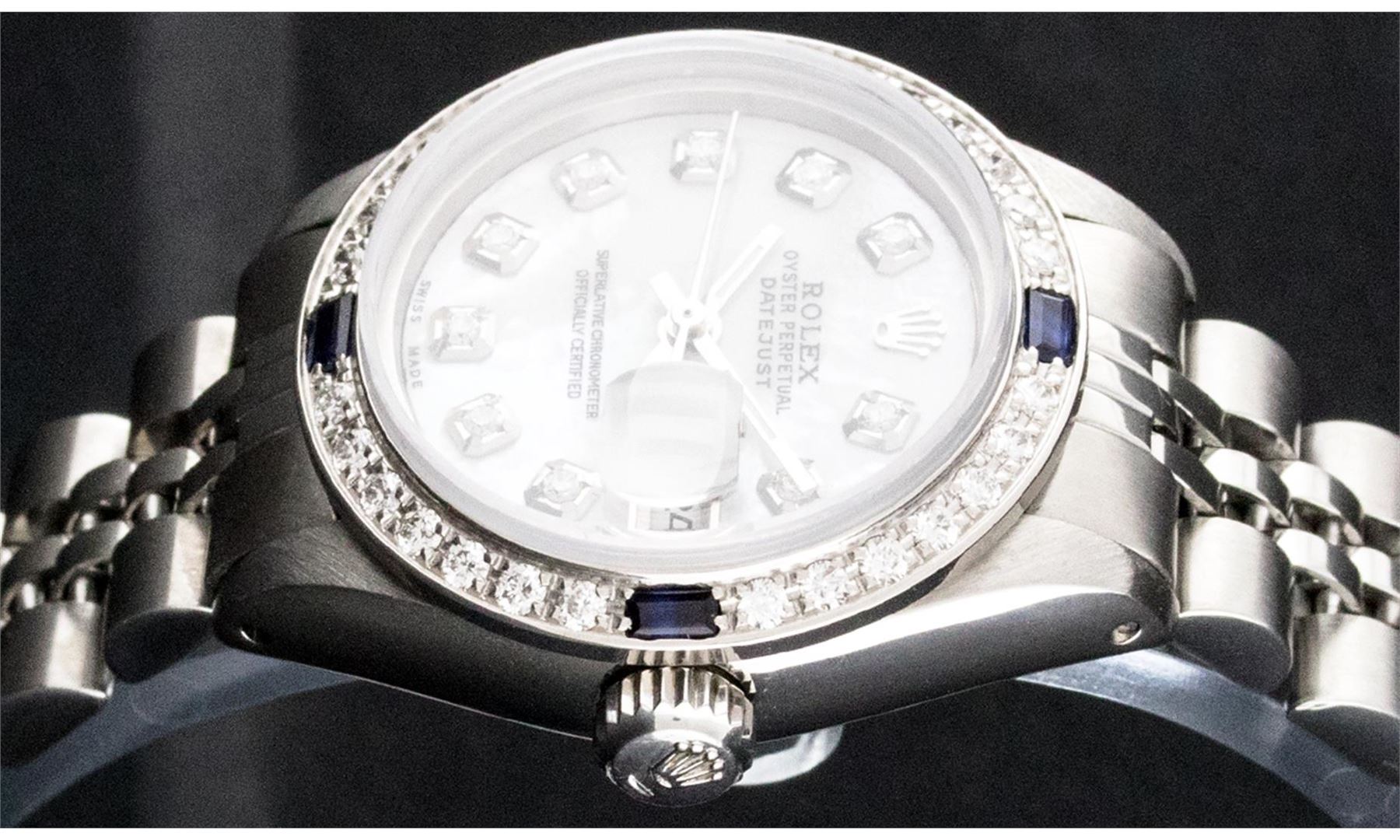 One Ladies Stainless Steel Rolex Datejust Polished Bright with Satin Finish, Serviced & Electronically Tested, Stainless Steel Case: 26mm, Stainless Steel Crown, Custom Bezel: New 18K White Gold Sapphire Beadset Diamond Bezel, Diamond + Gem Count: 28 Diamonds + 4 Sapphires Total Weight .70 Carat, Clarity: SI-VS, Color: G to H. Custom Crystal: New Synthetic Sapphire Cyclops Lens. Custom Hands: New Luminescent Hands. Movement: Automatic Winding Movement. Custom Dial: Refinished Mother Of Pearl With Diamond Hour Markers, 10 Diamond in Dial, G To H In Color, Clarity: SI-VS. Date Window: 3 O'Clock Position Date Display, Model: Datejust. Condition: G-6 Extra Fine. Bracelet: Stainless Steel Jubilee. Bright Polish & Satin Finish. 6.0 Inch Length, Adjustable. Standard Clasp, With Rolex Logo. This Watch Has Been Serviced Time Tested And Is In Excellent Condition It Is Free Of All Scratches And Dents.