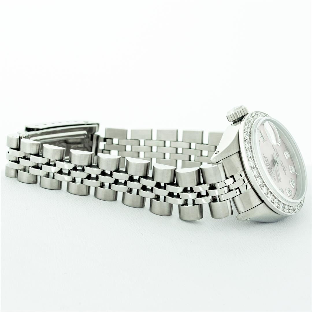 One Ladies Stainless Steel Rolex Datejust Polished Bright with Satin Finish, Serviced & Electronically Tested, Stainless Steel Case: 26mm, Stainless Steel Crown, Custom Bezel: New 18K White Gold Beadset Diamond Bezel, Diamond Count: 32 Diamonds, Total Weight .70 Carat, Clarity: SI-VS, Color: G to H. Custom Crystal: New Scratch Resistant Synthetic Sapphire Cyclops Lens. Custom Hands: New Luminescent Hands. Movement: Automatic Winding Movement. Custom Dial: Pink Diamond Dial, Diamond Count: 10 Diamonds In Dial, Color: G To H, Clarity: SI-VS. Date Window: 3 O'Clock Position Date Display, Model: Datejust. Condition: G-6 Extra Fine. Bracelet: Stainless Steel Jubilee Band. Bright Polish & Satin Finish. 6.0 Inch Length, Adjustable. Standard Clasp, With Rolex Logo. This Watch Has Been Serviced Time Tested And Is In Excellent Condition It Is Free Of All Scratches And Dents.