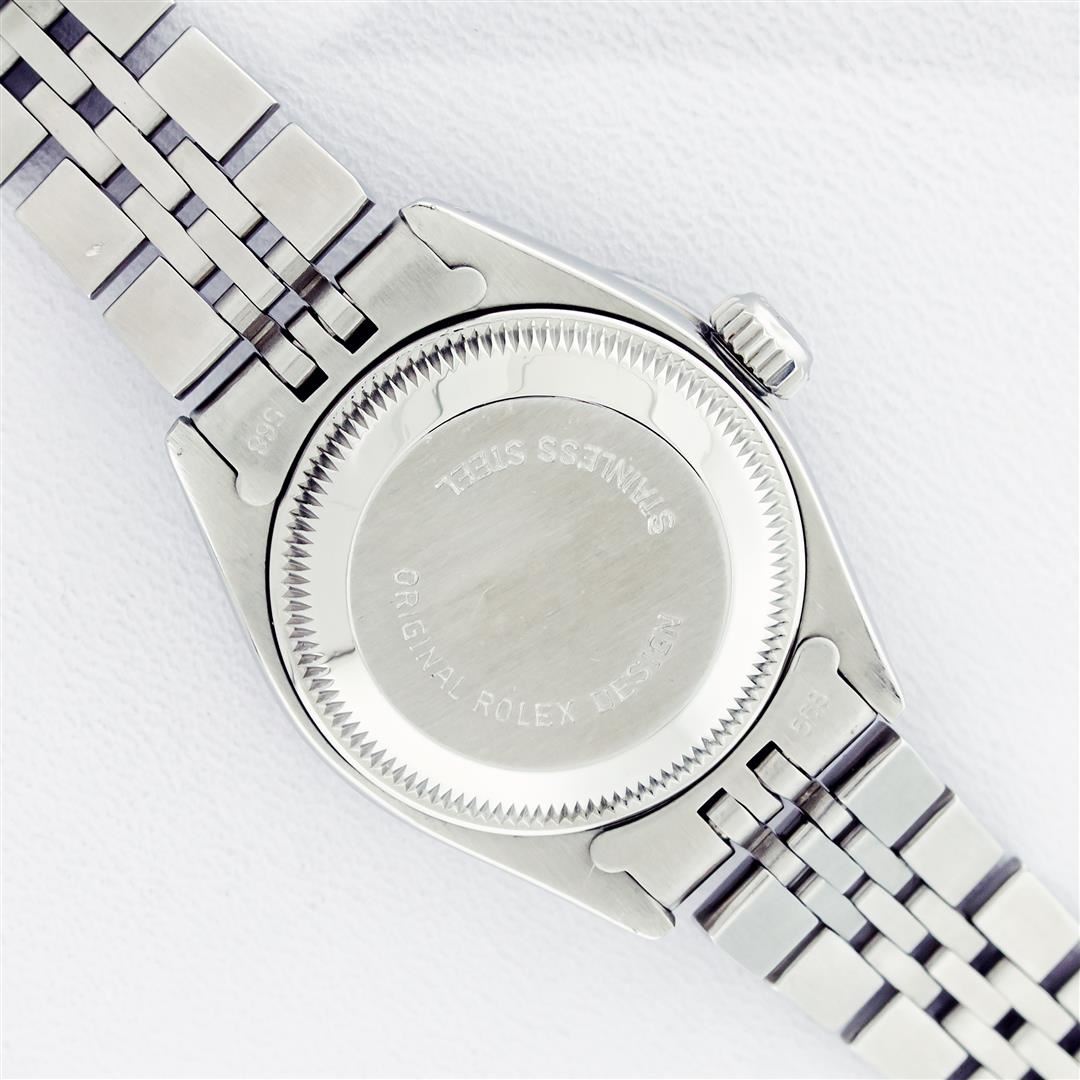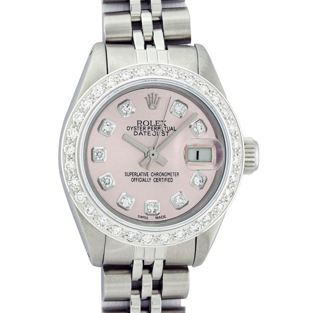 One Ladies Stainless Steel Rolex Datejust Polished Bright with Satin Finish, Serviced & Electronically Tested, Stainless Steel Case: 26mm, Stainless Steel Crown, Custom Bezel: New 18K White Gold Beadset Diamond Bezel, Diamond Count: 32 Diamonds, Total Weight .70 Carat, Clarity: SI-VS, Color: G to H. Custom Crystal: New Scratch Resistant Synthetic Sapphire Cyclops Lens. Custom Hands: New Luminescent Hands. Movement: Automatic Winding Movement. Custom Dial: Pink Diamond Dial, Diamond Count: 10 Diamonds In Dial, Color: G To H, Clarity: SI-VS. Date Window: 3 O'Clock Position Date Display, Model: Datejust. Condition: G-6 Extra Fine. Bracelet: Stainless Steel Jubilee Band. Bright Polish & Satin Finish. 6.0 Inch Length, Adjustable. Standard Clasp, With Rolex Logo. This Watch Has Been Serviced Time Tested And Is In Excellent Condition It Is Free Of All Scratches And Dents.