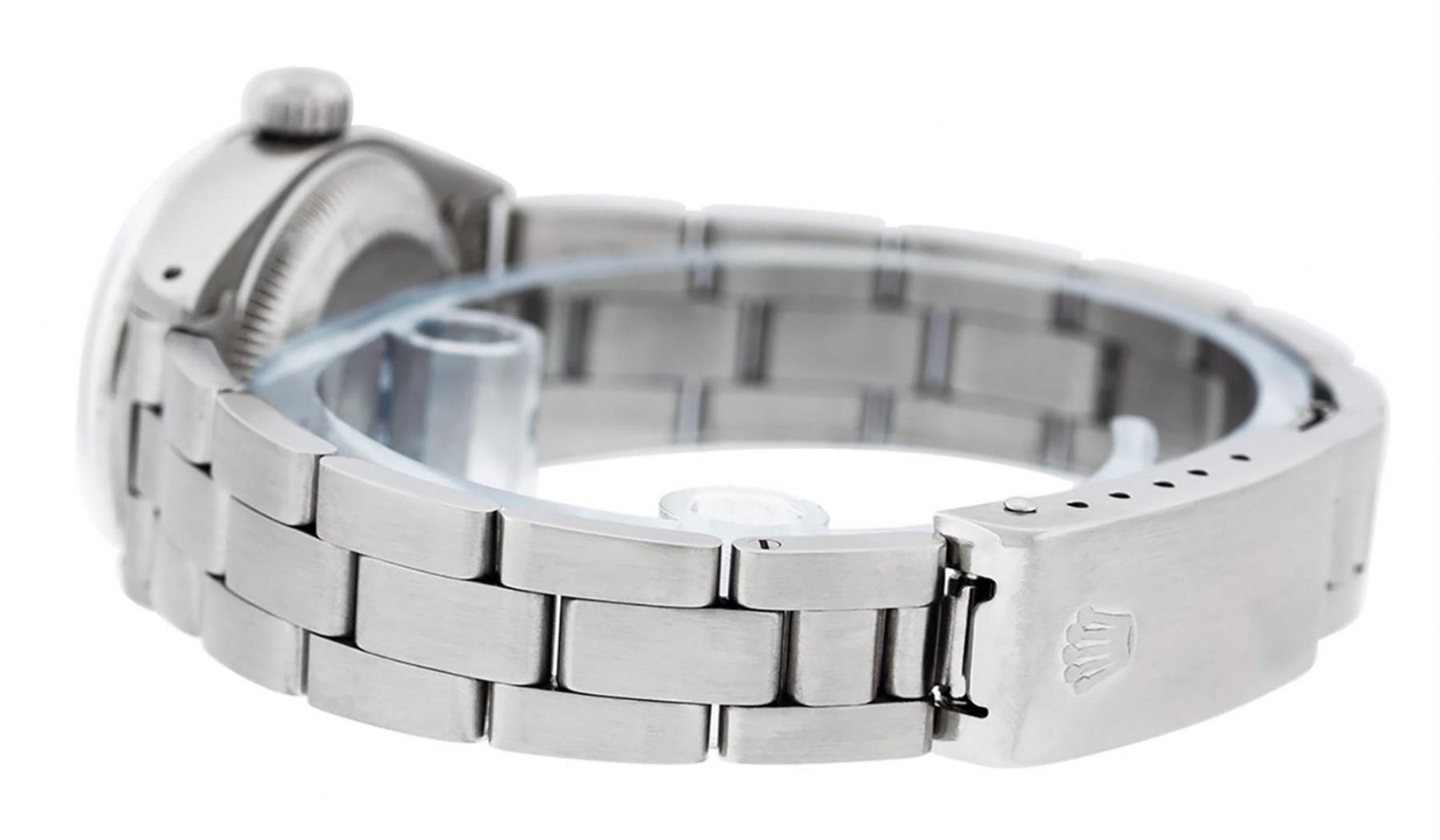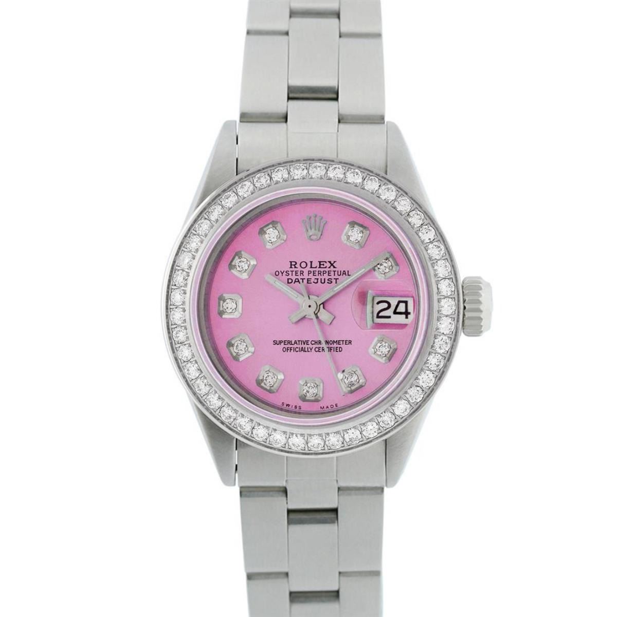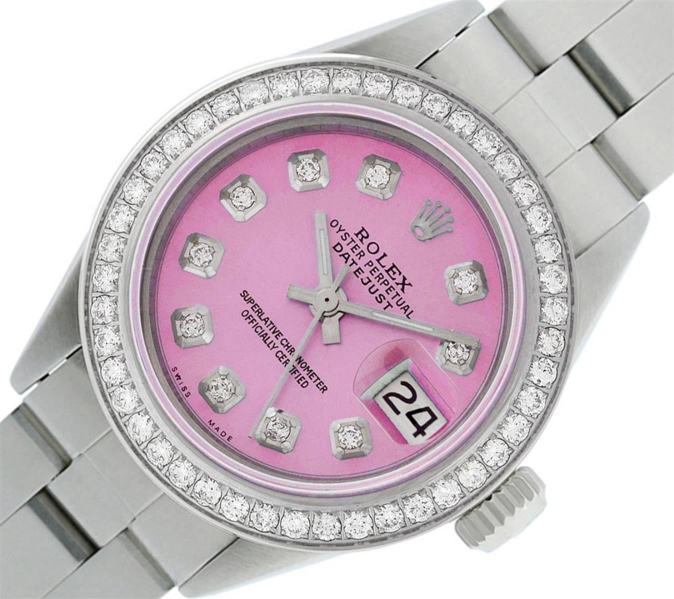 One Ladies Stainless Steel Rolex Datejust Polished Bright with Satin Finish, Serviced & Electronically Tested, Stainless Steel Case: 26mm, Stainless Steel Crown, Custom Bezel: New Stainless Steel Beadset Diamond Bezel, Diamond Count: 44 Diamonds, Total Bezel Weight .80 Carat, Clarity: SI-VS, Color: G to H. Custom Crystal: New Scratch Resistant Synthetic Sapphire Cyclops Lens. Custom Hands: New Luminescent Hands. Movement: Automatic Winding Movement. Custom Dial: Refinished Pink Diamond, Diamond Count: 10 Diamonds On Dial, G To H In Color, Clarity: SI-VS. Date Window: 3 O'Clock Position Date Display, Model: Datejust. Condition: G-6 Extra Fine. Bracelet: Stainless Steel Oyster Band. Bright Polish & Satin Finish. 6.0 Inch Length, Adjustable. Standard Clasp, With Rolex Logo.