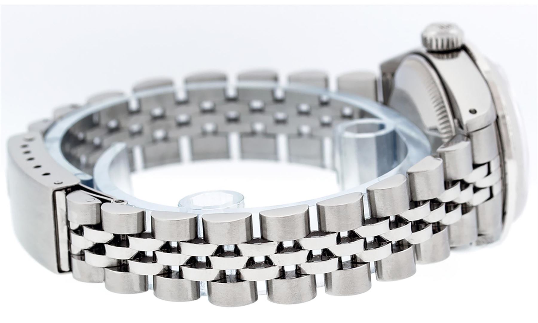 One Ladies Pre Owned Stainless Steel Rolex Datejust Polished Bright with Satin Finish, Serviced & Electronically Tested, Stainless Steel Case: 26mm, Stainless Steel Crown, Custom Bezel: New 18K White Gold Emerald Beadset Diamond Bezel, Diamond + Gem Count