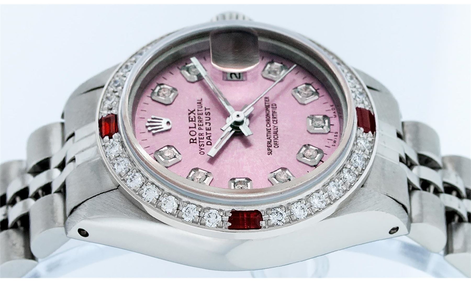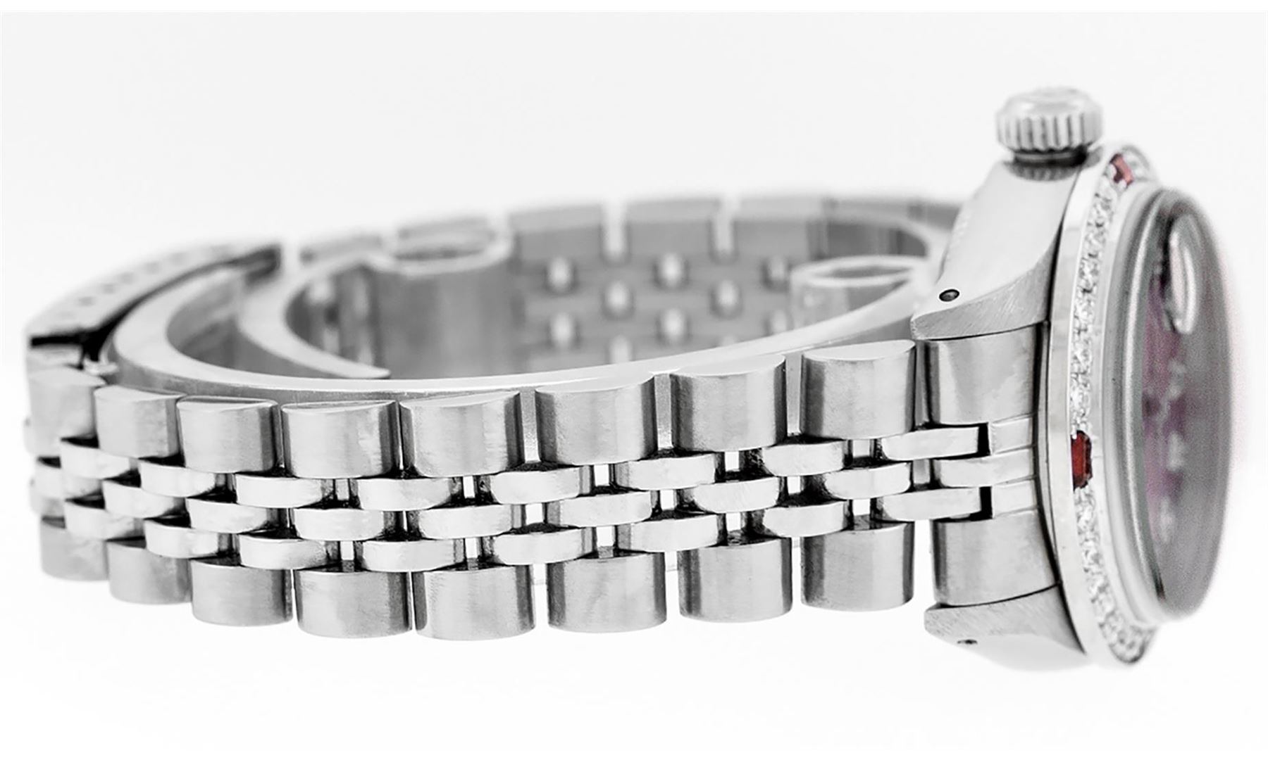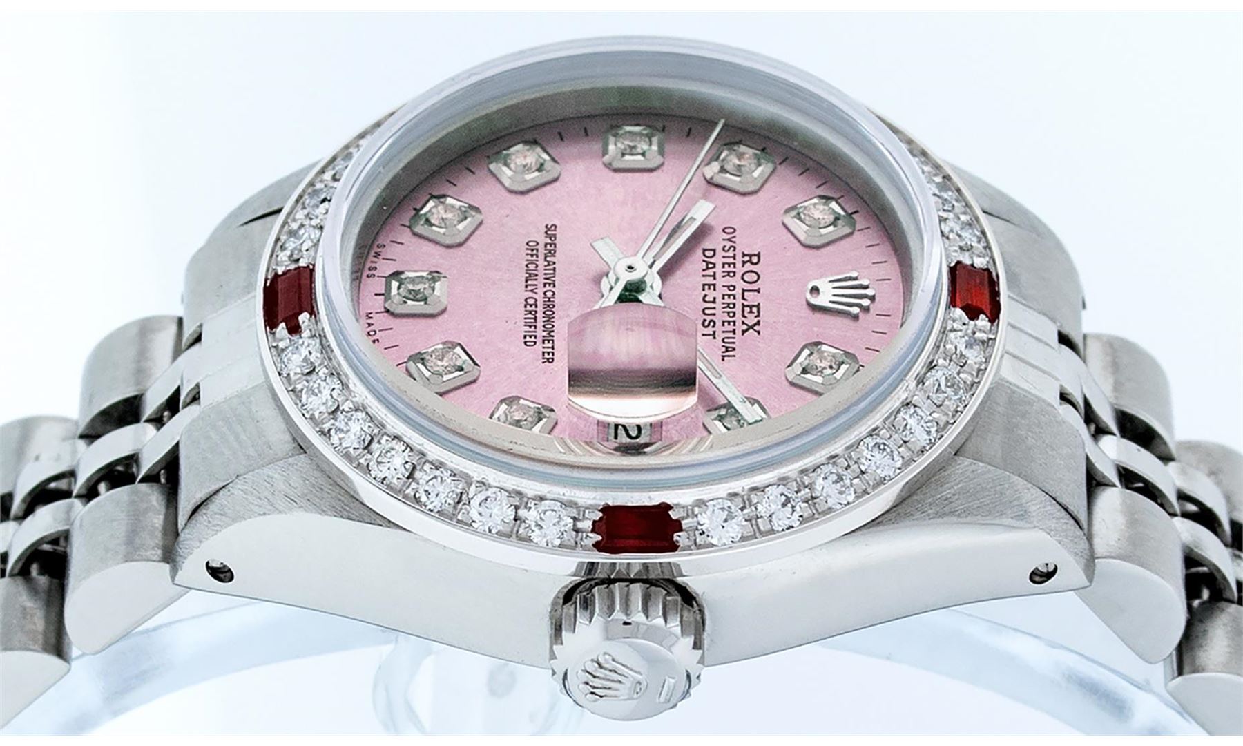 One Ladies Pre Owned Stainless Steel Rolex Datejust Polished Bright with Satin Finish, Serviced & Electronically Tested, Stainless Steel Case: 26mm, Stainless Steel Crown, Custom Bezel: New 18K White Gold Ruby Beadset Diamond Bezel, Diamond + Gem Count: 2