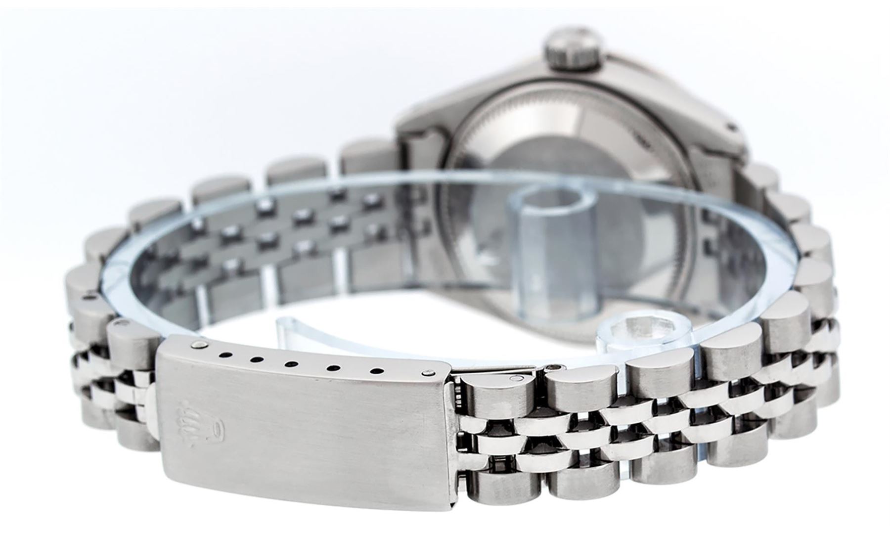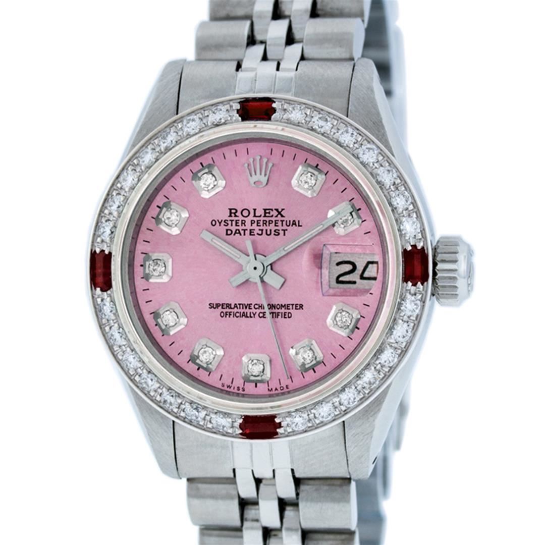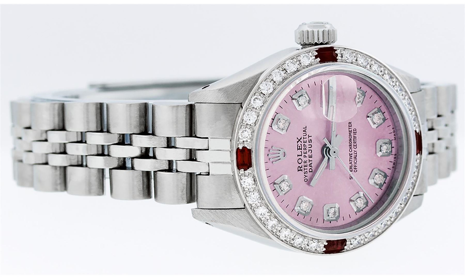 One Ladies Pre Owned Stainless Steel Rolex Datejust Polished Bright with Satin Finish, Serviced & Electronically Tested, Stainless Steel Case: 26mm, Stainless Steel Crown, Custom Bezel: New 18K White Gold Ruby Beadset Diamond Bezel, Diamond + Gem Count: 2