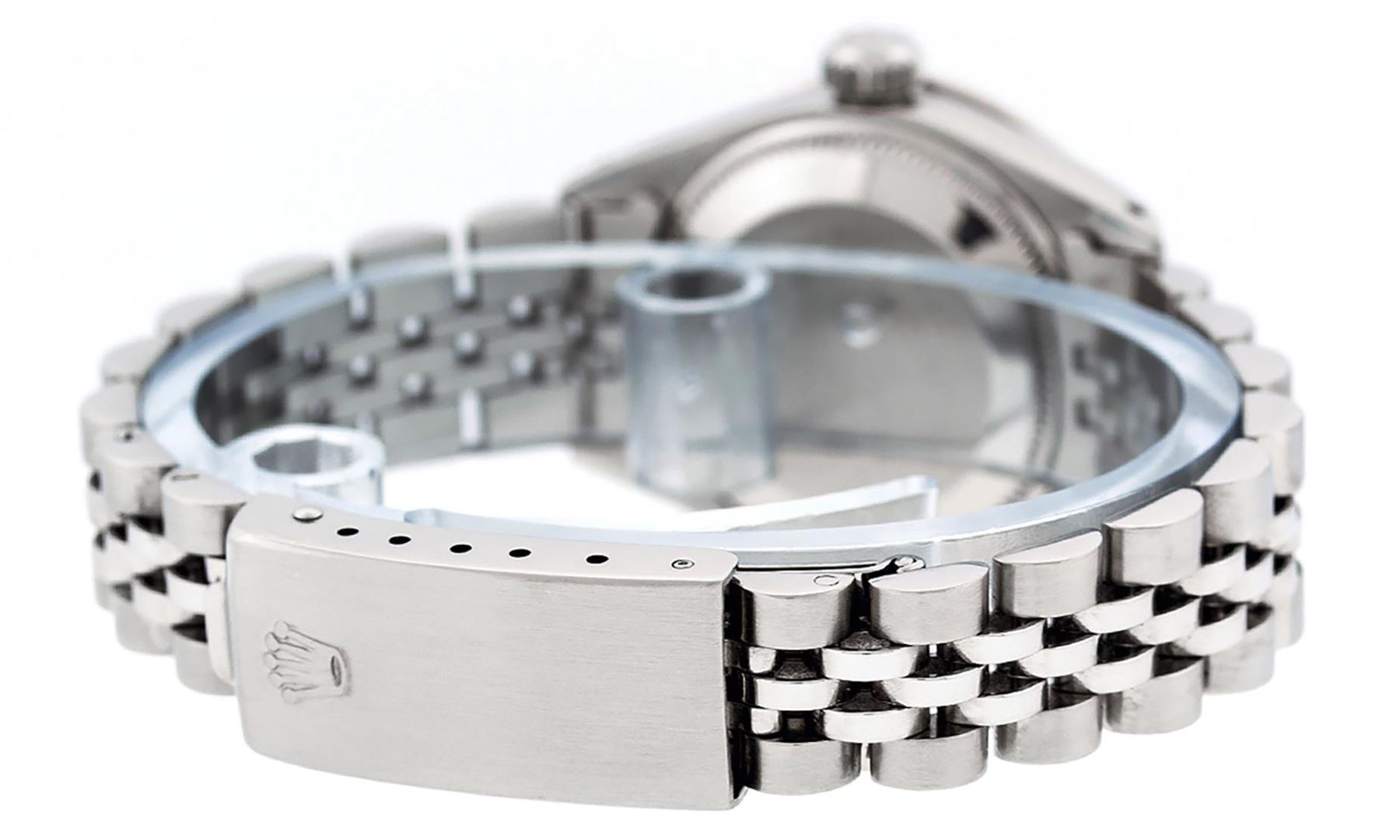 One Ladies Pre Owned Stainless Steel Rolex Datejust Polished Bright with Satin Finish, Serviced & Electronically Tested, Stainless Steel Case: 26mm, Stainless Steel Crown, Custom Bezel: New 18K White Gold Ruby Beadset Diamond Bezel, Diamond + Gem Count: 2