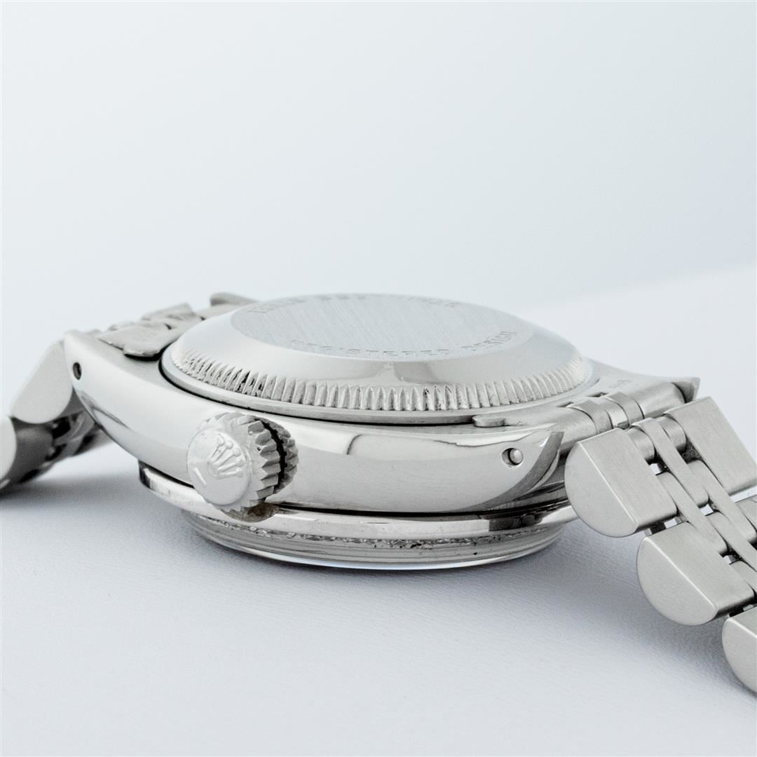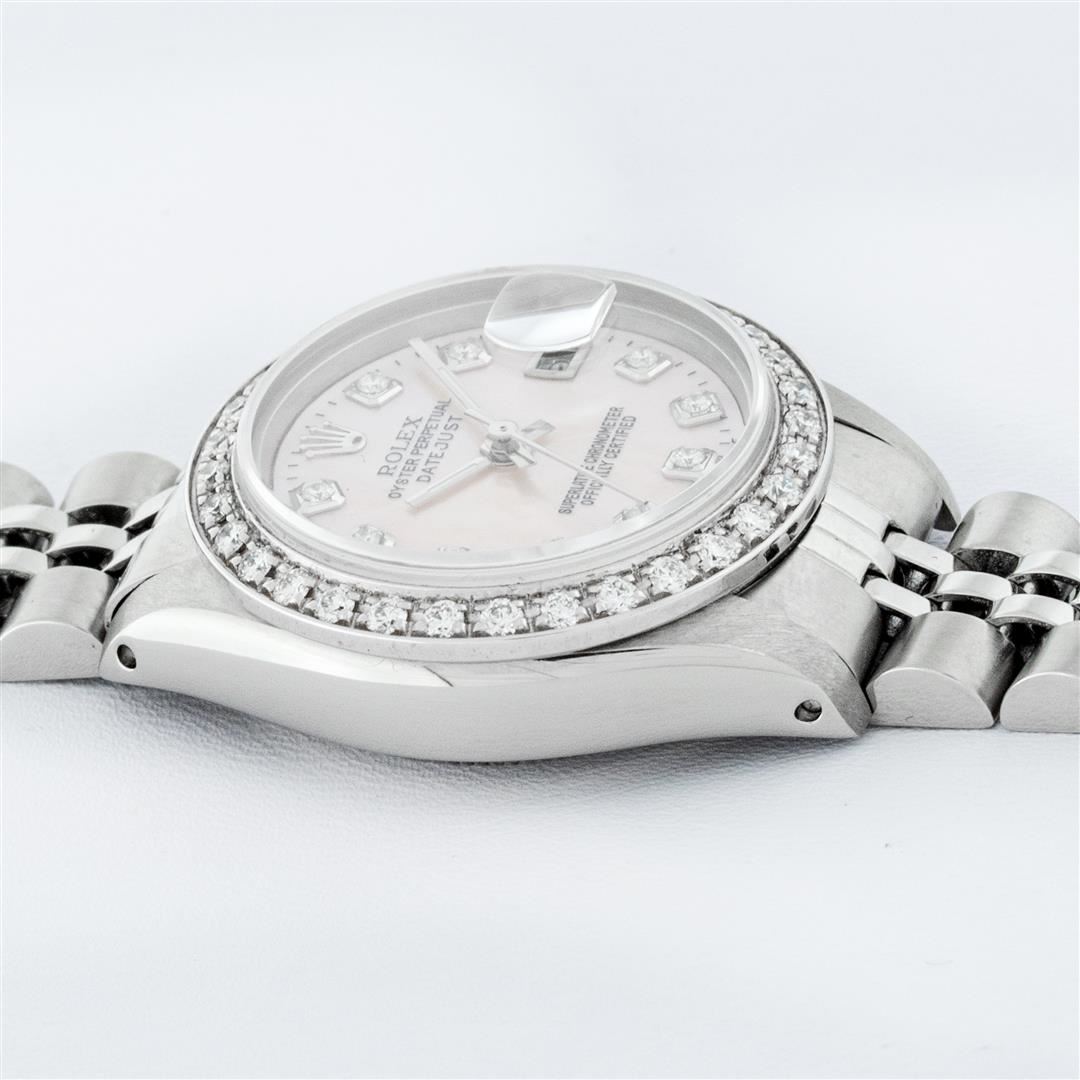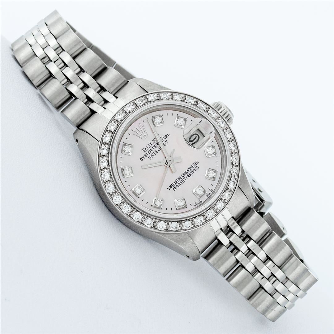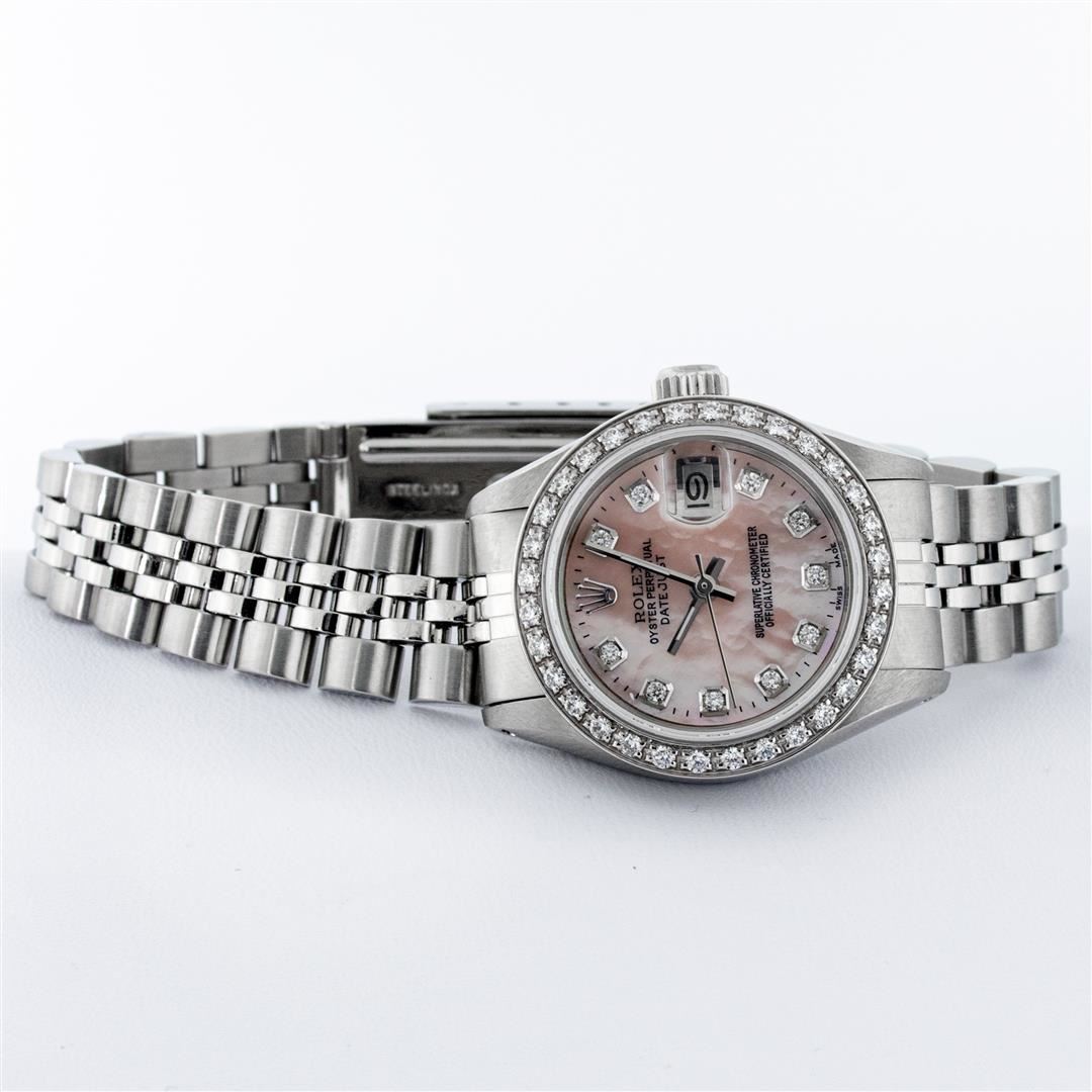 One Ladies Pre Owned Stainless Steel Rolex Datejust Polished Bright with Satin Finish, Serviced & Electronically Tested, Stainless Steel Case: 26mm, Stainless Steel Crown, Custom Bezel: New 18K White Gold Beadset Diamond Bezel, Diamond Count: 32 Diamonds, Clarity: SI-VS, Color: G to H. Custom Crystal: New Sapphire With Date Window. Custom Hands: New Luminescent Hands. Rolex Movement: Automatic Winding Movement. Custom Dial: Pink Mother Of Pearl With Custom Added Diamonds, Diamond Count: 10 Diamonds In Dial, Color: G To H, Clarity: SI-VS. Date Window: 3 O'Clock Position Date Display, Model: Datejust. Condition: G-6 Extra Fine. Rolex Bracelet: Stainless Steel Jubilee Band. Bright Polish & Satin Finish. 6.0 Inch Length, Adjustable. Standard Clasp, With Rolex Logo. This Watch Has Been Serviced Time Tested And Is In Excellent Condition It Is Free Of All Scratches And Dents.
