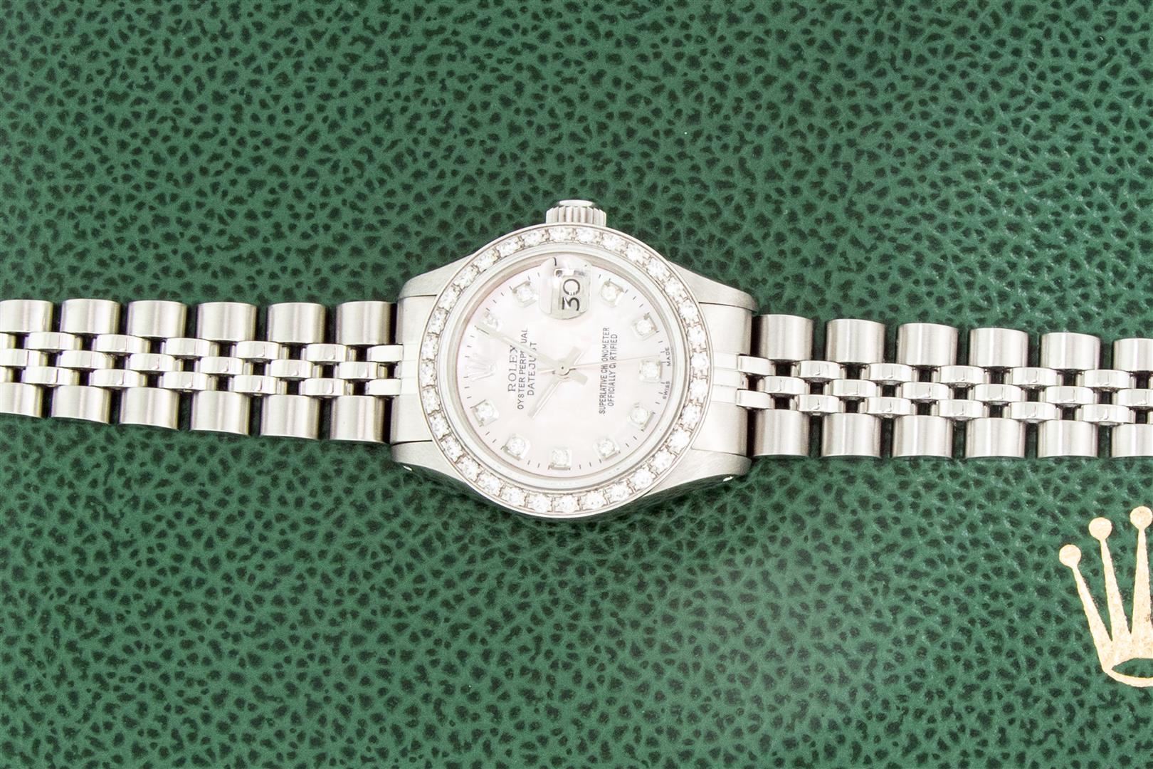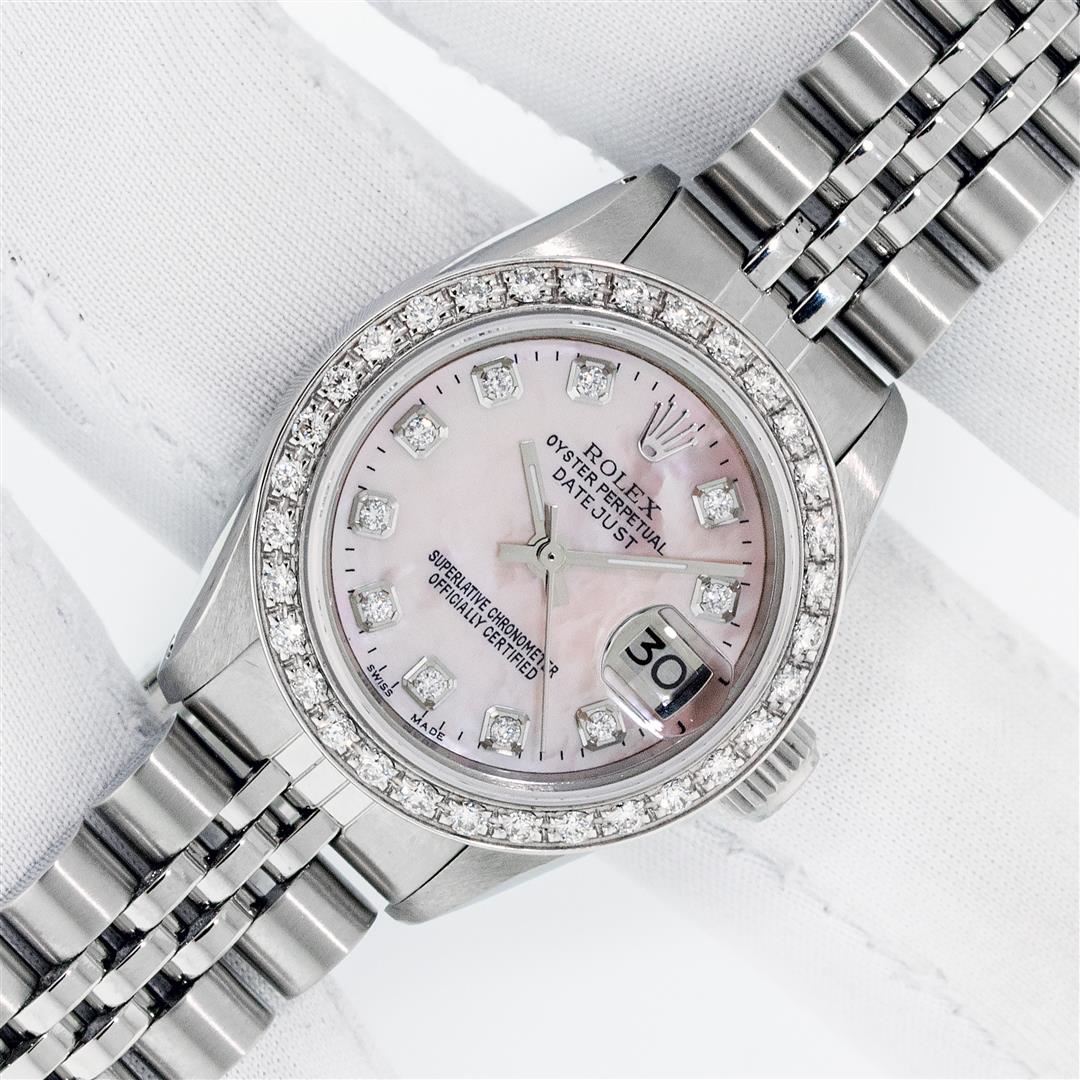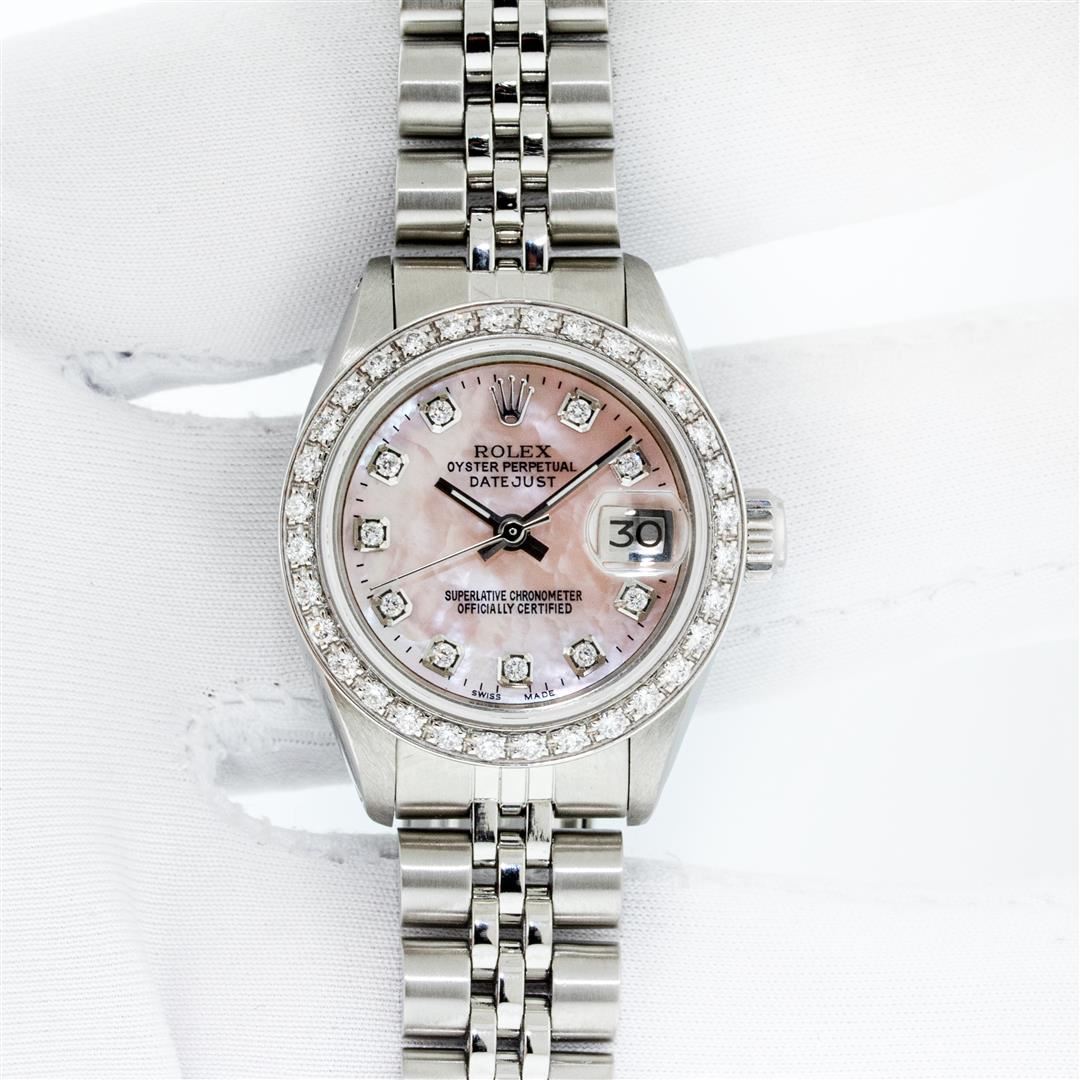 One Ladies Stainless Steel Rolex Oyster Perpetual Datejust Polished Bright with Satin Finish, Serviced & Electronically Tested, Stainless Steel Case: 26mm, Stainless Steel Crown, Custom Bezel: New 18K White Gold Beadset Diamond Bezel, Diamond Count: 32 Diamonds, Total Weight .70 Carat, Clarity: SI-VS, Color: G to H. Custom Crystal: New Scratch Resistant Synthetic Sapphire Cyclops Lens. Custom Hands: New Luminescent Hands. Movement: Automatic Winding Movement. Custom Dial: Pink Mother Of Pearl Diamond Dial, Diamond Count: 10 Diamonds In Dial, Color: G To H, Clarity: SI-VS. Date Window: 3 O'Clock Position Date Display, Model: Datejust. Condition: G-6 Extra Fine. Bracelet: Stainless Steel Jubilee Band. Bright Polish & Satin Finish. 6.0 Inch Length, Adjustable. Standard Clasp, With Rolex Logo. This Watch Has Been Serviced Time Tested And Is In Excellent Condition It Is Free Of All Scratches And Dents. This Watch Comes With A Rolex Box.