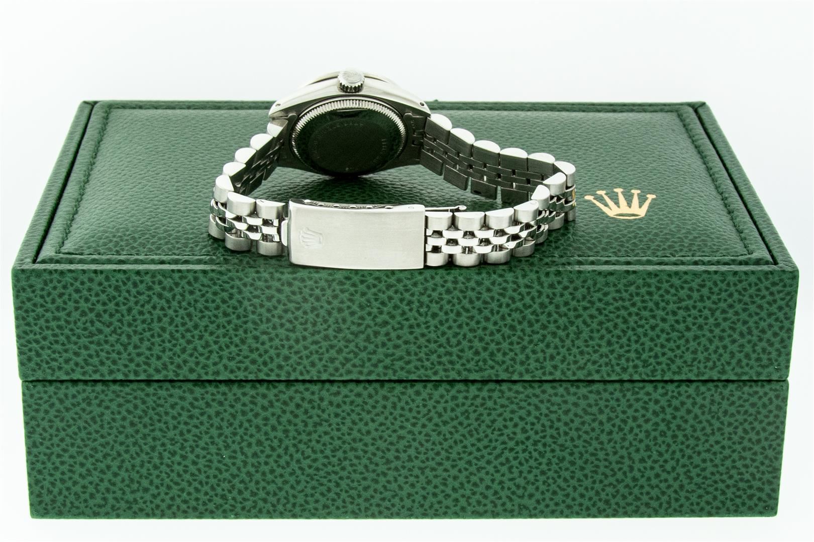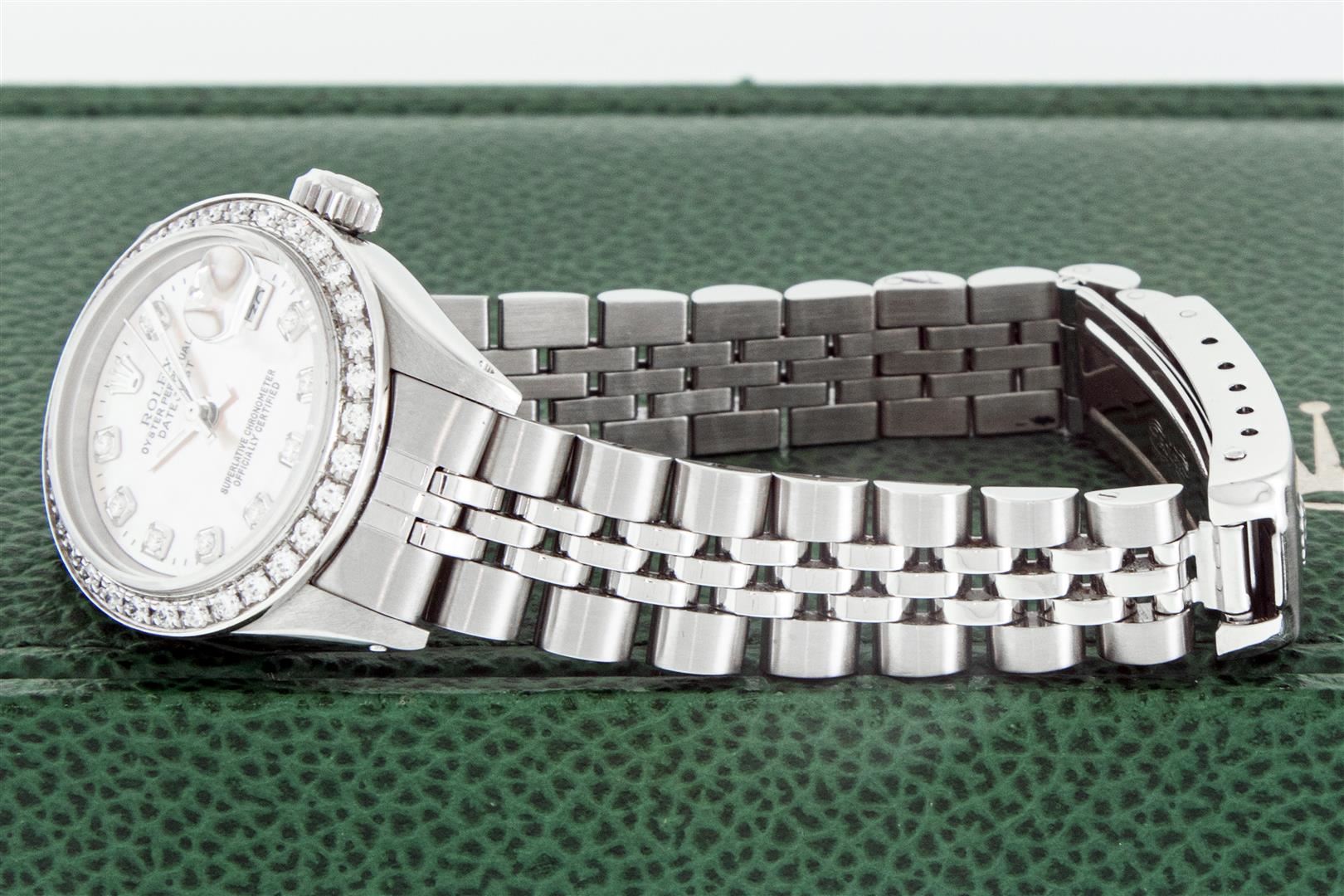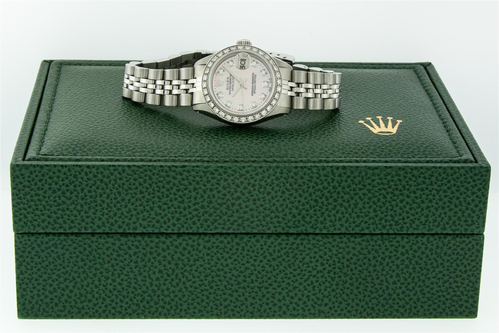 One Ladies Stainless Steel Rolex Oyster Perpetual Datejust Polished Bright with Satin Finish, Serviced & Electronically Tested, Stainless Steel Case: 26mm, Stainless Steel Crown, Custom Bezel: New 18K White Gold Beadset Diamond Bezel, Diamond Count: 32 Diamonds, Total Weight .70 Carat, Clarity: SI-VS, Color: G to H. Custom Crystal: New Scratch Resistant Synthetic Sapphire Cyclops Lens. Custom Hands: New Luminescent Hands. Movement: Automatic Winding Movement. Custom Dial: Pink Mother Of Pearl Diamond Dial, Diamond Count: 10 Diamonds In Dial, Color: G To H, Clarity: SI-VS. Date Window: 3 O'Clock Position Date Display, Model: Datejust. Condition: G-6 Extra Fine. Bracelet: Stainless Steel Jubilee Band. Bright Polish & Satin Finish. 6.0 Inch Length, Adjustable. Standard Clasp, With Rolex Logo. This Watch Has Been Serviced Time Tested And Is In Excellent Condition It Is Free Of All Scratches And Dents. This Watch Comes With A Rolex Box.
