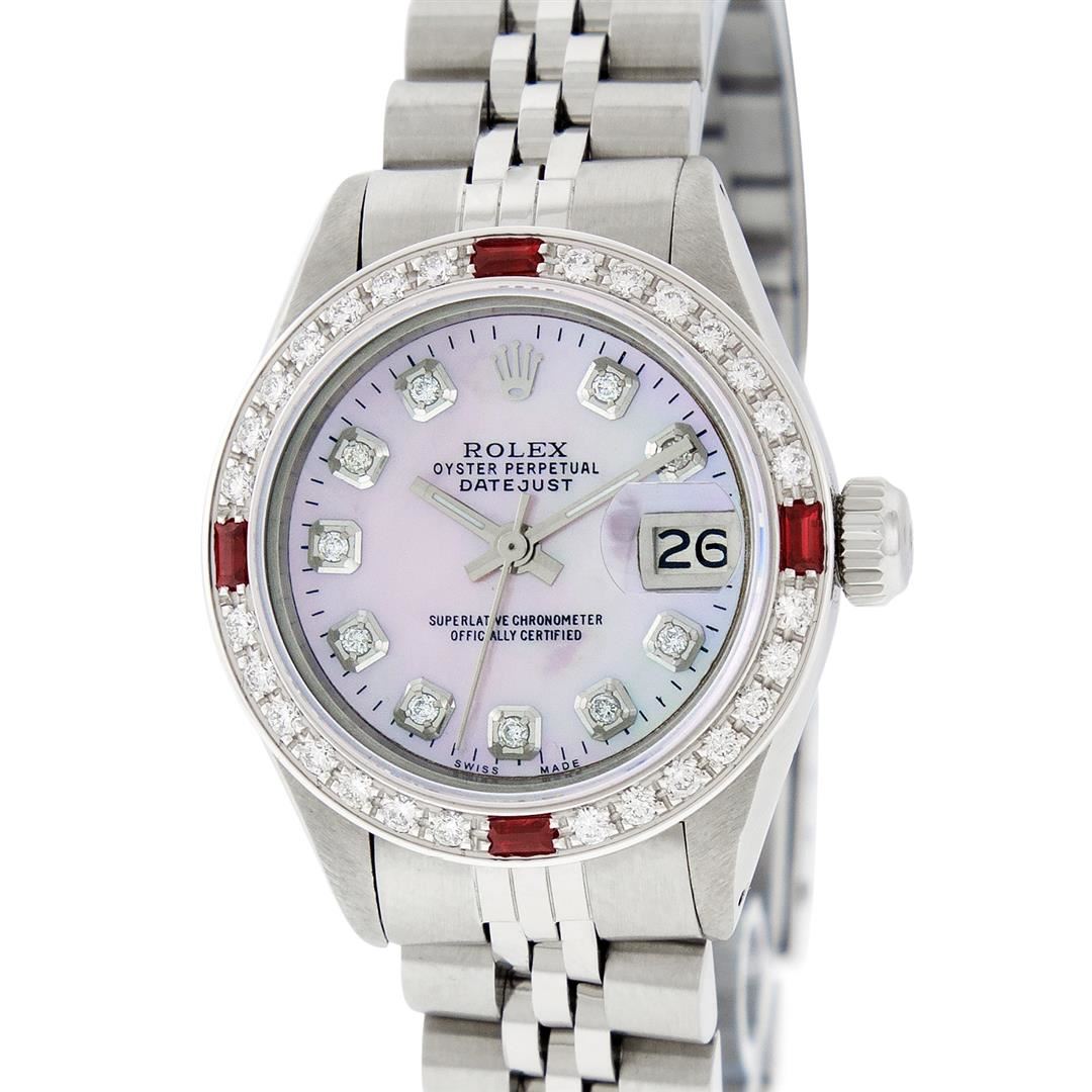 One Ladies Pre Owned Stainless Steel Rolex Datejust Polished Bright with Satin Finish, Serviced & Electronically Tested, Stainless Steel Case: 26mm, Stainless Steel Crown, Custom Bezel: New 18K White Gold Ruby Beadset Diamond Bezel, Diamond + Gem Count: 28 Diamonds + 4 Rubies, Clarity: SI-VS, Color: G to H. Custom Crystal: New Sapphire With Date Window. Custom Hands: New Luminescent Hands. Rolex Movement: Automatic Winding Movement. Custom Dial: Pink Mother Of Pearl With Custom Added Diamond Hour Markers, 10 Diamond in Dial G To H In Color, Clarity: SI-VS. Date Window: 3 O'Clock Position Date Display, Model: Datejust. Condition: G-6 Extra Fine. Rolex Bracelet: Stainless Steel Jubilee Band. Bright Polish & Satin Finish. 6.0 Inch Length, Adjustable. Standard Clasp, With Rolex Logo. This Watch Has Been Serviced Time Tested And Is In Excellent Condition It Is Free Of All Scratches And Dents.