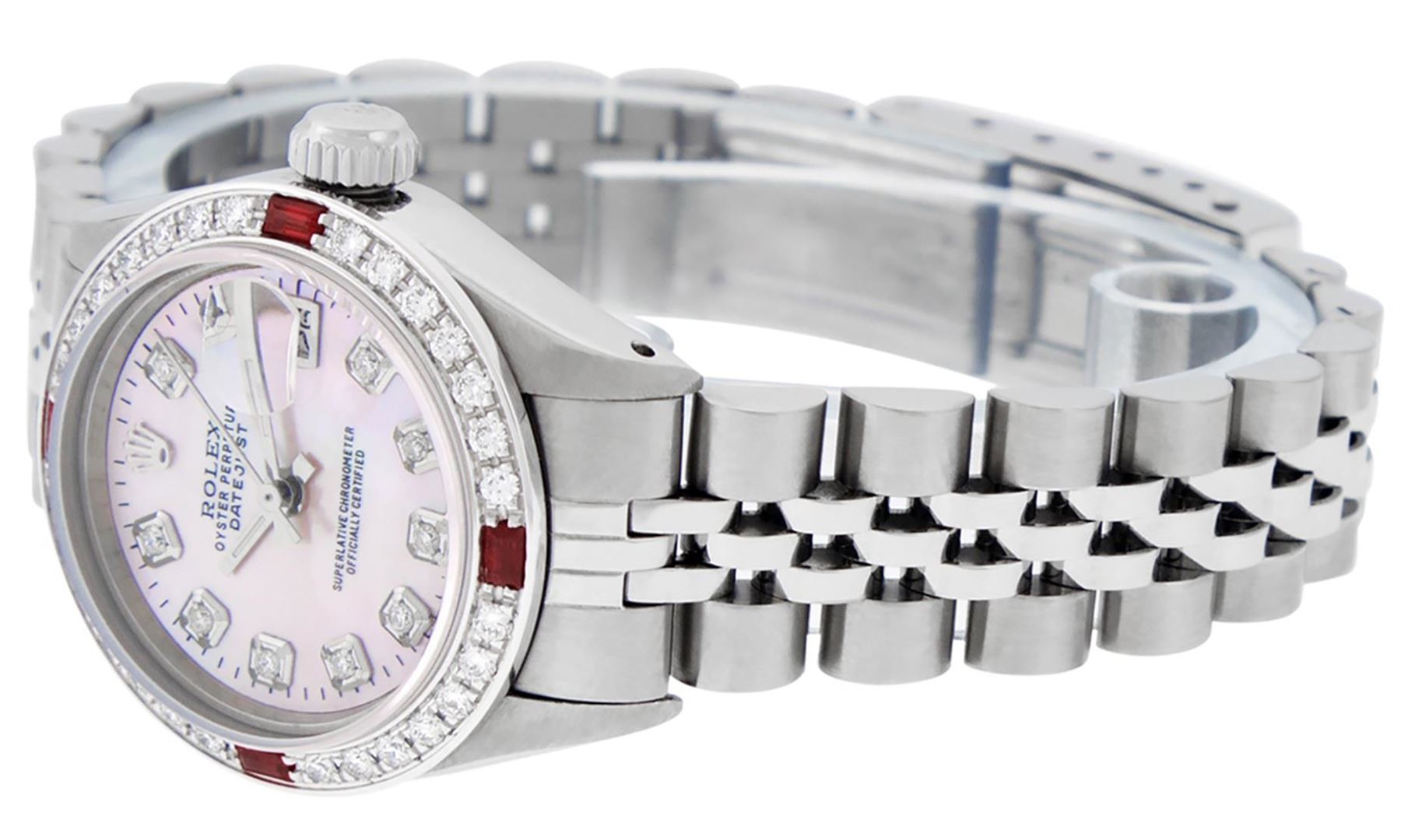 One Ladies Pre Owned Stainless Steel Rolex Datejust Polished Bright with Satin Finish, Serviced & Electronically Tested, Stainless Steel Case: 26mm, Stainless Steel Crown, Custom Bezel: New 18K White Gold Ruby Beadset Diamond Bezel, Diamond + Gem Count: 28 Diamonds + 4 Rubies, Clarity: SI-VS, Color: G to H. Custom Crystal: New Sapphire With Date Window. Custom Hands: New Luminescent Hands. Rolex Movement: Automatic Winding Movement. Custom Dial: Pink Mother Of Pearl With Custom Added Diamond Hour Markers, 10 Diamond in Dial G To H In Color, Clarity: SI-VS. Date Window: 3 O'Clock Position Date Display, Model: Datejust. Condition: G-6 Extra Fine. Rolex Bracelet: Stainless Steel Jubilee Band. Bright Polish & Satin Finish. 6.0 Inch Length, Adjustable. Standard Clasp, With Rolex Logo. This Watch Has Been Serviced Time Tested And Is In Excellent Condition It Is Free Of All Scratches And Dents.