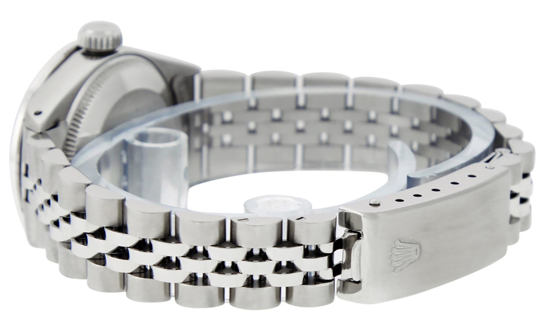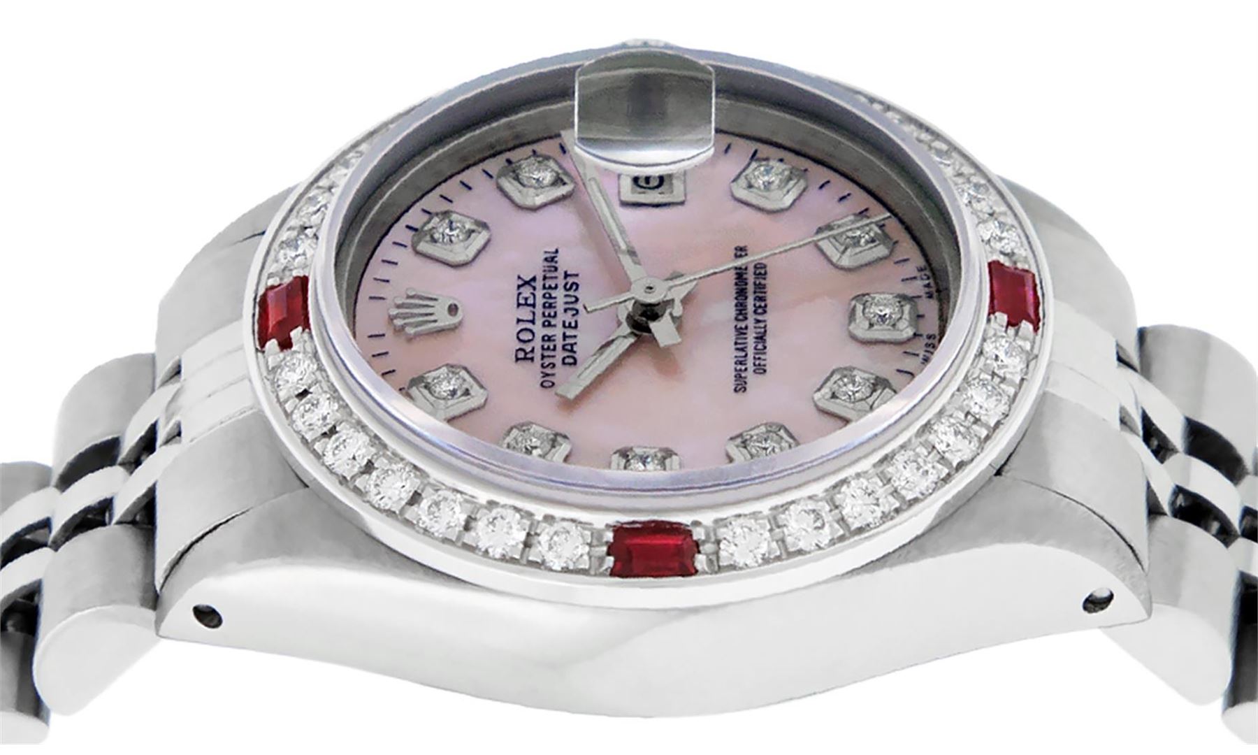 One Ladies Pre Owned Stainless Steel Rolex Datejust Polished Bright with Satin Finish, Serviced & Electronically Tested, Stainless Steel Case: 26mm, Stainless Steel Crown, Custom Bezel: New 18K White Gold Ruby Beadset Diamond Bezel, Diamond + Gem Count: 28 Diamonds + 4 Rubies, Clarity: SI-VS, Color: G to H. Custom Crystal: New Sapphire With Date Window. Custom Hands: New Luminescent Hands. Rolex Movement: Automatic Winding Movement. Custom Dial: Pink Mother Of Pearl With Custom Added Diamond Hour Markers, 10 Diamond in Dial G To H In Color, Clarity: SI-VS. Date Window: 3 O'Clock Position Date Display, Model: Datejust. Condition: G-6 Extra Fine. Rolex Bracelet: Stainless Steel Jubilee Band. Bright Polish & Satin Finish. 6.0 Inch Length, Adjustable. Standard Clasp, With Rolex Logo. This Watch Has Been Serviced Time Tested And Is In Excellent Condition It Is Free Of All Scratches And Dents.
