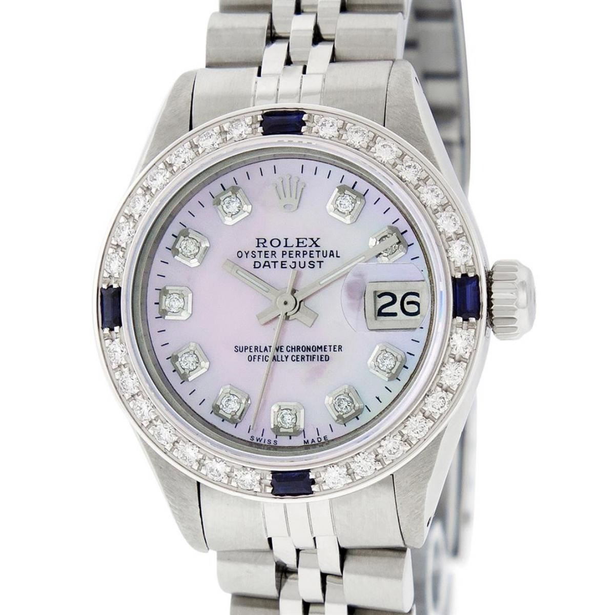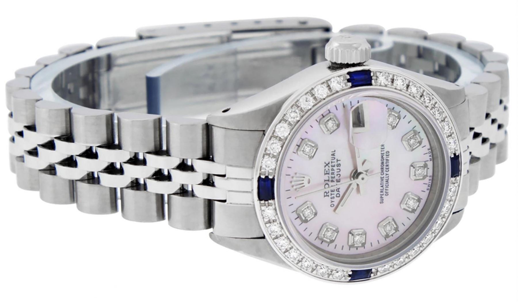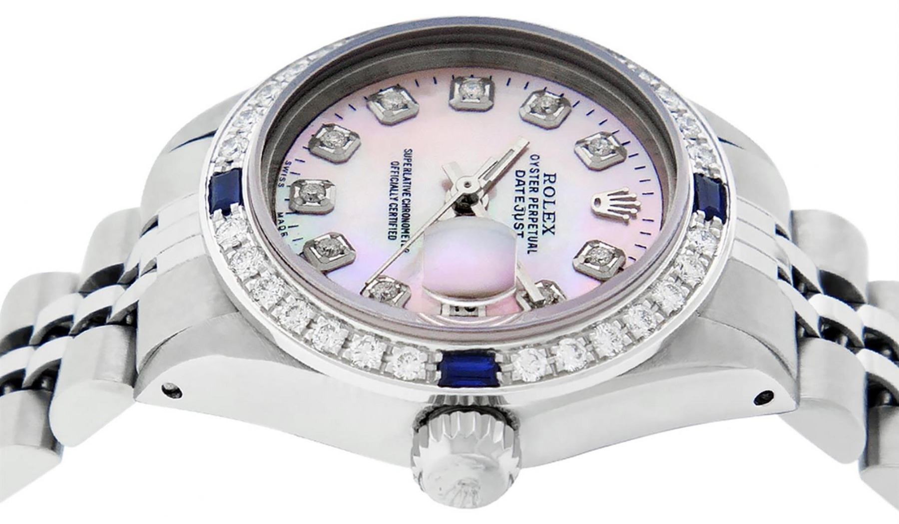 One Ladies Stainless Steel Rolex Datejust Polished Bright with Satin Finish, Serviced & Electronically Tested, Stainless Steel Case: 26mm, Stainless Steel Crown, Custom Bezel: New 18K White Gold Sapphire Beadset Diamond Bezel, Diamond + Gem Count: 28 Diamonds + 4 Sapphires. Total Weight .70 Carat, Clarity: SI-VS, Color: G to H. Custom Crystal: New Scratch Resistant Synthetic Sapphire Cyclops Lens. Custom Hands: New Luminescent Hands. Movement: Automatic Winding Movement. Custom Dial: Refinished Pink Mother Of Pearl With Diamond Hour Markers, Diamond Count: 10 Diamond in Dial, G To H In Color, Clarity: SI-VS. Date Window: 3 O'Clock Position Date Display, Model: Datejust. Condition: G-6 Extra Fine. Bracelet: Stainless Steel Jubilee Band. Bright Polish & Satin Finish. 6.0 Inch Length, Adjustable. Standard Clasp, With Rolex Logo. This Watch Has Been Serviced Time Tested And Is In Excellent Condition It Is Free Of All Scratches And Dents.