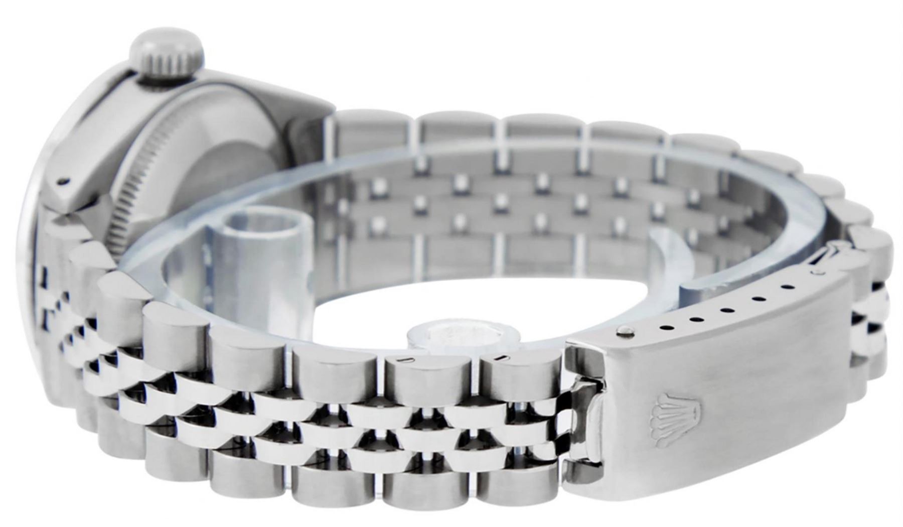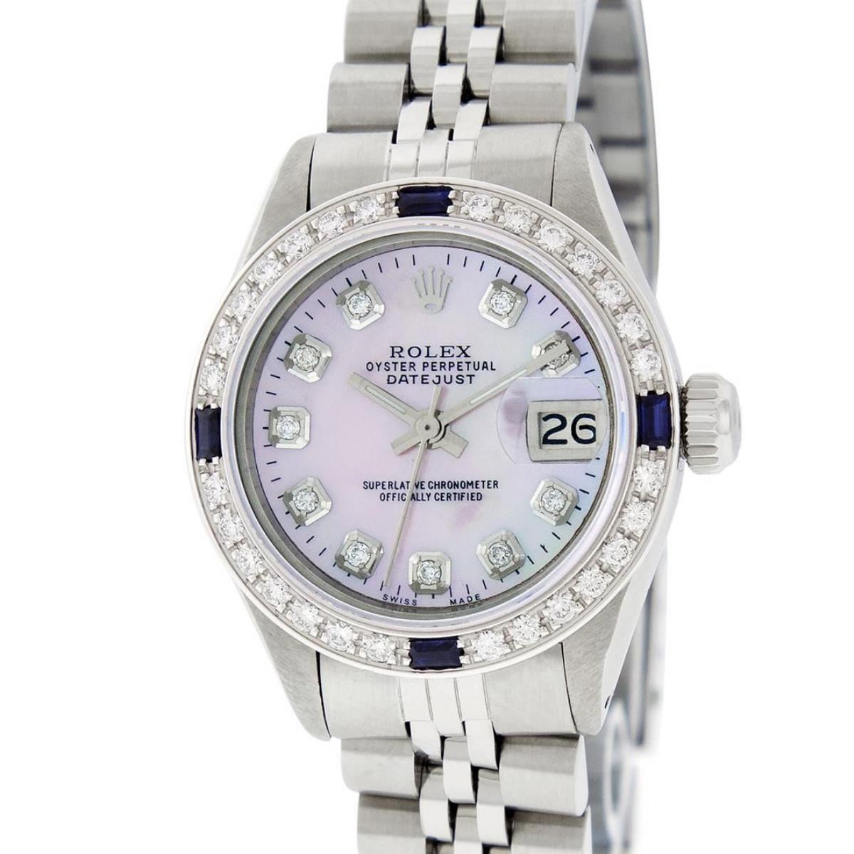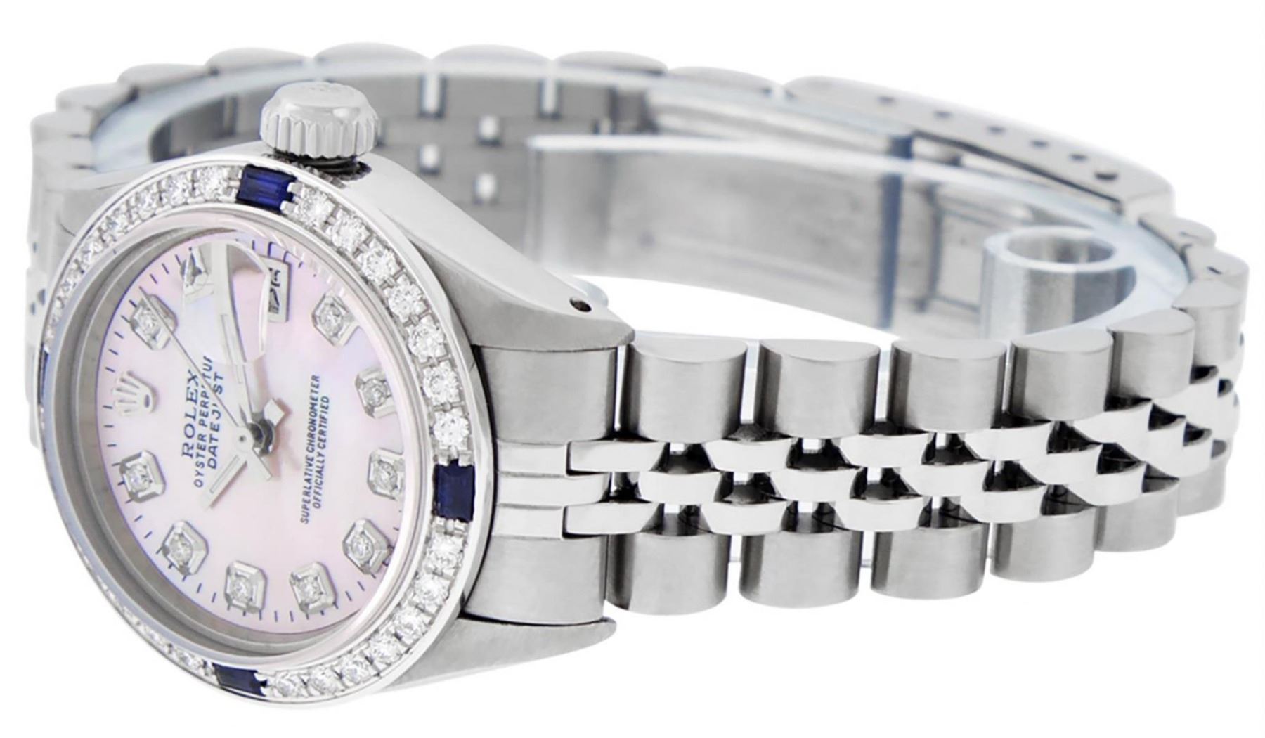 One Ladies Stainless Steel Rolex Datejust Polished Bright with Satin Finish, Serviced & Electronically Tested, Stainless Steel Case: 26mm, Stainless Steel Crown, Custom Bezel: New 18K White Gold Sapphire Beadset Diamond Bezel, Diamond + Gem Count: 28 Diamonds + 4 Sapphires. Total Weight .70 Carat, Clarity: SI-VS, Color: G to H. Custom Crystal: New Scratch Resistant Synthetic Sapphire Cyclops Lens. Custom Hands: New Luminescent Hands. Movement: Automatic Winding Movement. Custom Dial: Refinished Pink Mother Of Pearl With Diamond Hour Markers, Diamond Count: 10 Diamond in Dial, G To H In Color, Clarity: SI-VS. Date Window: 3 O'Clock Position Date Display, Model: Datejust. Condition: G-6 Extra Fine. Bracelet: Stainless Steel Jubilee Band. Bright Polish & Satin Finish. 6.0 Inch Length, Adjustable. Standard Clasp, With Rolex Logo. This Watch Has Been Serviced Time Tested And Is In Excellent Condition It Is Free Of All Scratches And Dents.