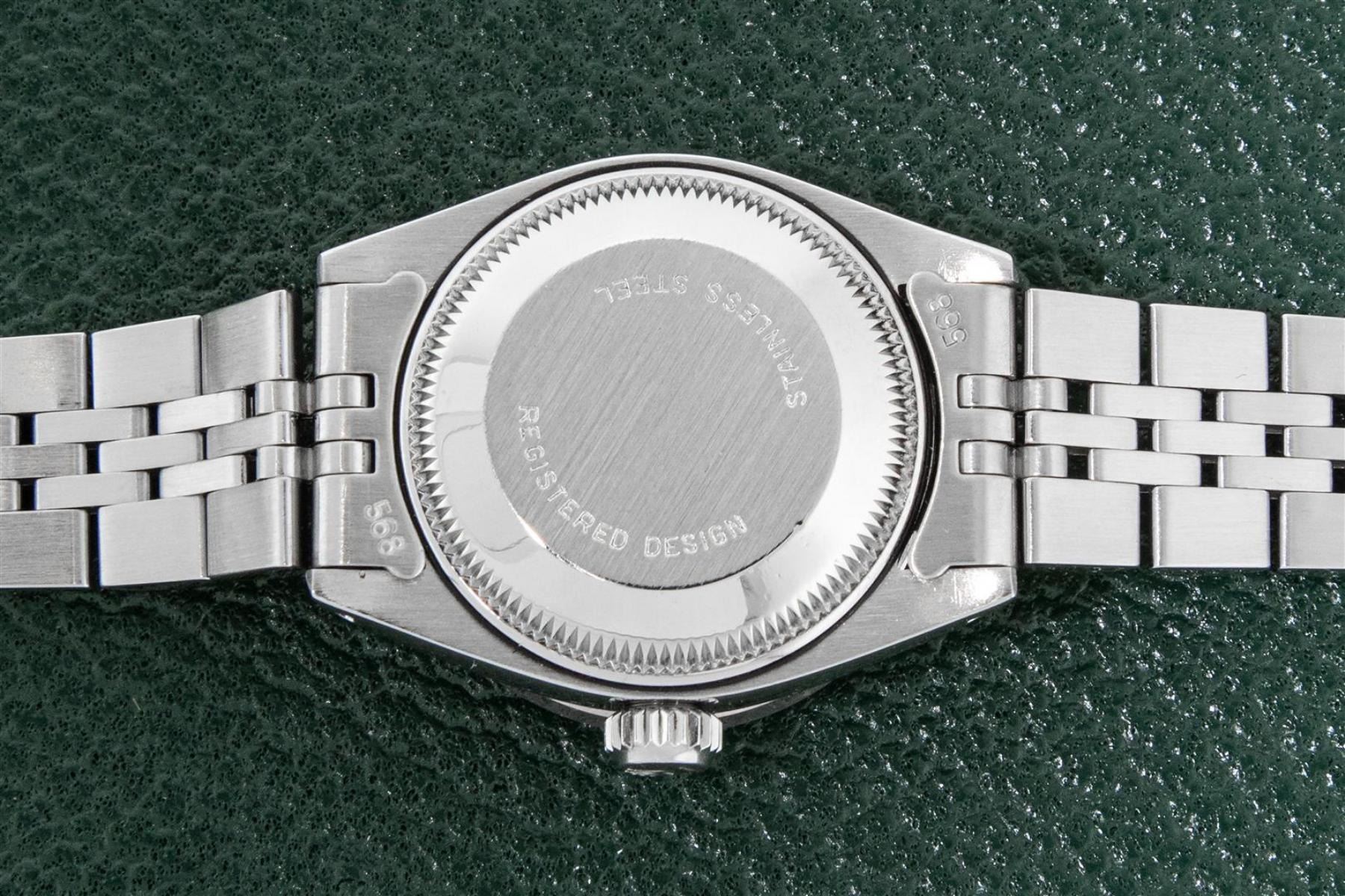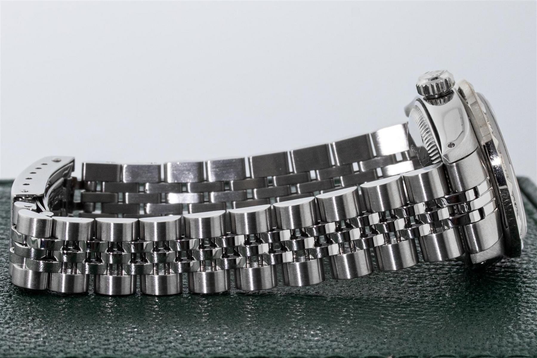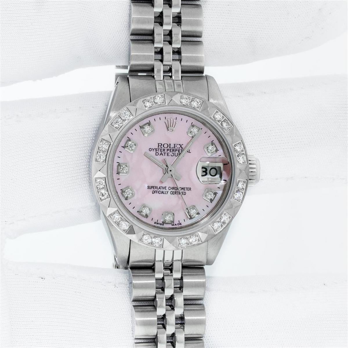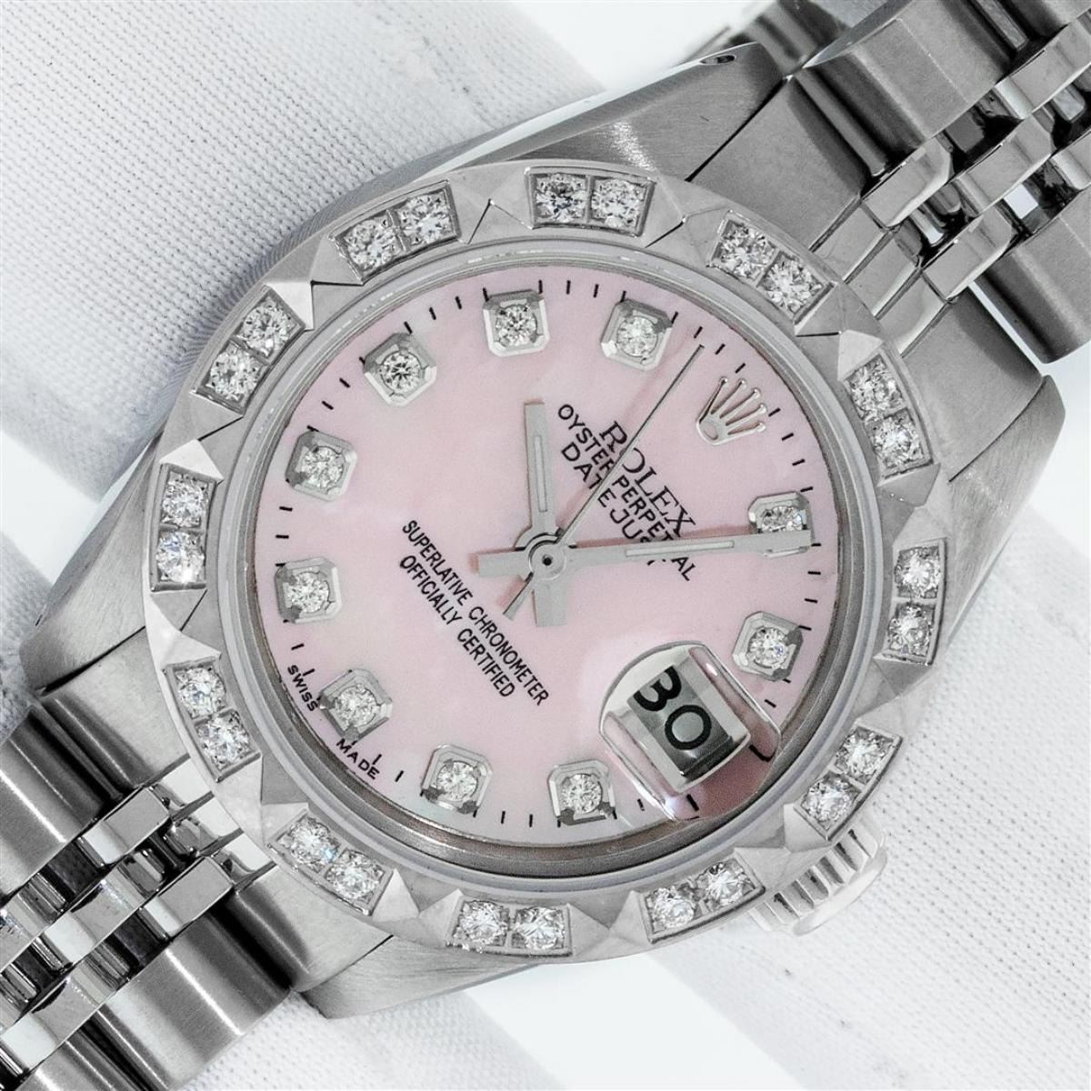 One Ladies Stainless Steel Rolex Datejust Polished Bright with Satin Finish, Serviced & Electronically Tested, Stainless Steel Case: 26mm, Stainless Steel Crown, Custom Bezel: New 18K White Gold Pyramid Diamond Bezel, Diamond Count: 24 Diamonds In Dial. Total Weight .50 Carat, Clarity: SI-VS, Color: G to H. Custom Crystal: New Scratch Resistant Synthetic Sapphire Cyclops Lens. Custom Hands: New Luminescent Hands. Movement: Automatic Winding Movement. Custom Dial: Light Pink Mother Of Pearl Diamond Dial. Diamond Count: 10 Diamonds In Dial. Clarity: SI-VS, Color: G to H. Date Window: 3 O'Clock Position Date Display, Model: Datejust. Condition: G-6 Extra Fine. Bracelet: Stainless Steel Jubilee Band With Rolex Crown On Buckle. Bright Polish & Satin Finish. Band Length: 6.0 Inch Length, Adjustable. Standard Clasp, With Rolex Logo. This Watch Has Been Serviced Time Tested And Is In Excellent Condition It Is Free Of All Scratches And Dents. This Watch Comes With A Rolex Box.