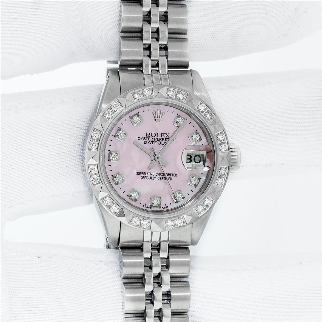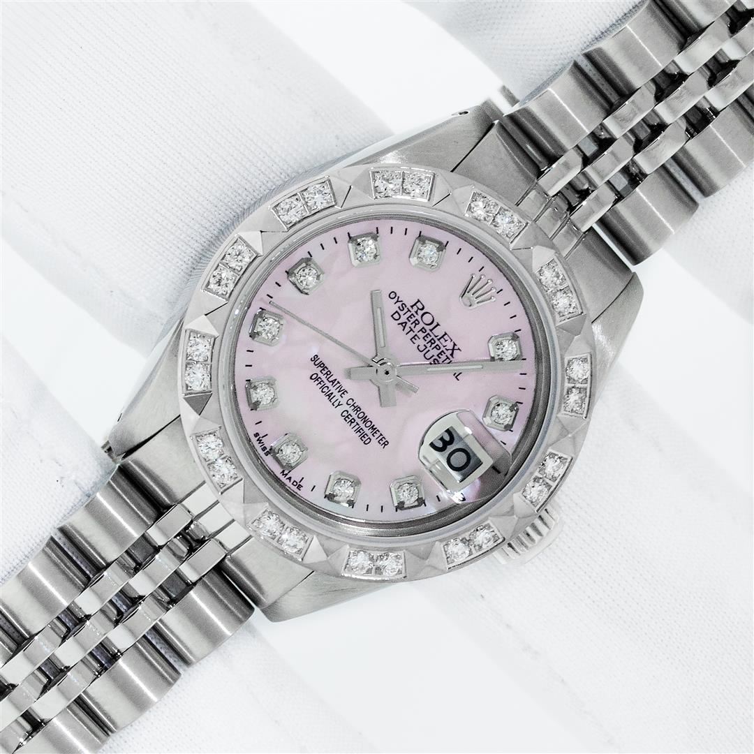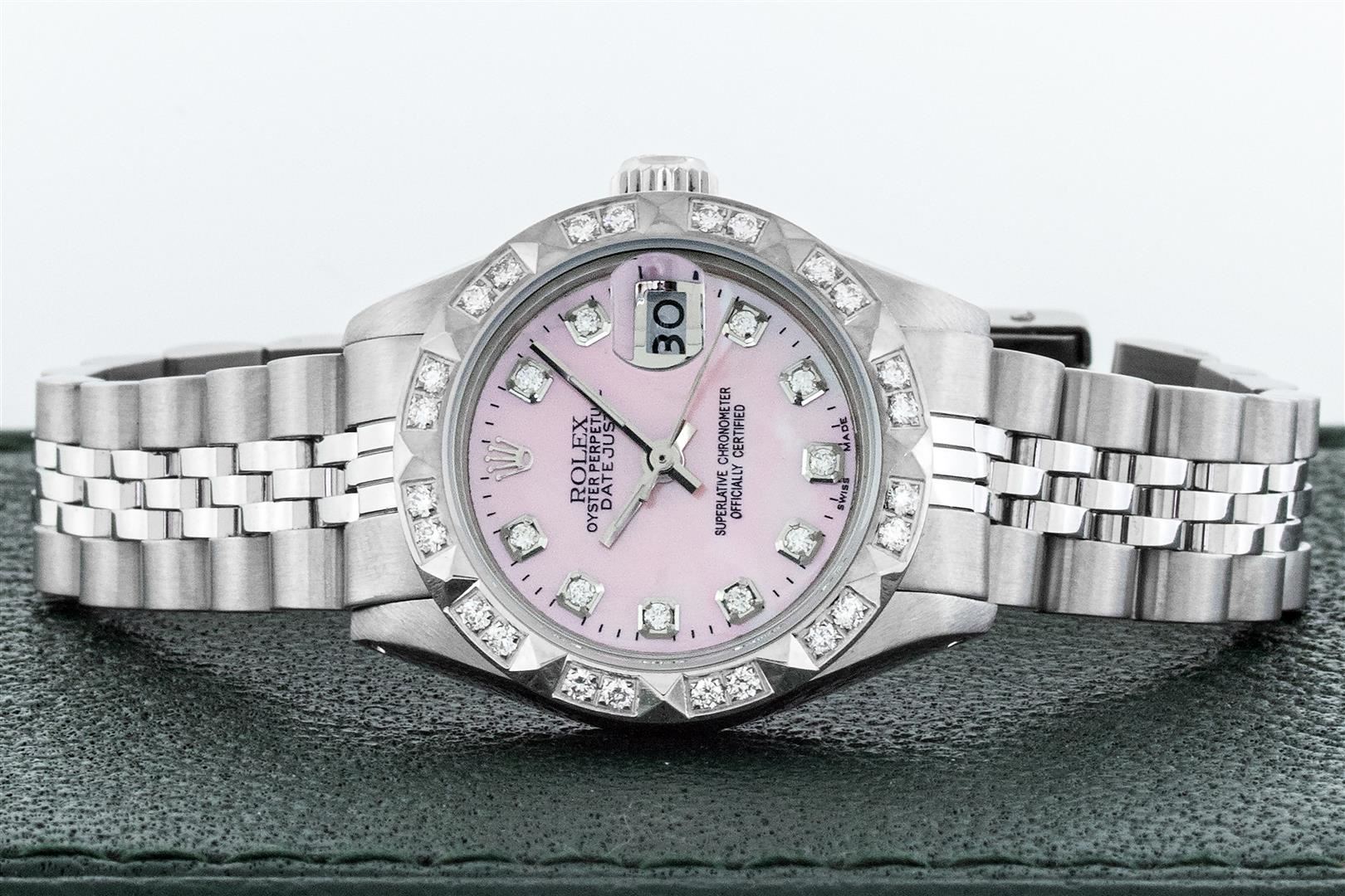 One Ladies Stainless Steel Rolex Datejust Polished Bright with Satin Finish, Serviced & Electronically Tested, Stainless Steel Case: 26mm, Stainless Steel Crown, Custom Bezel: New 18K White Gold Pyramid Diamond Bezel, Diamond Count: 24 Diamonds In Dial. Total Weight .50 Carat, Clarity: SI-VS, Color: G to H. Custom Crystal: New Scratch Resistant Synthetic Sapphire Cyclops Lens. Custom Hands: New Luminescent Hands. Movement: Automatic Winding Movement. Custom Dial: Light Pink Mother Of Pearl Diamond Dial. Diamond Count: 10 Diamonds In Dial. Clarity: SI-VS, Color: G to H. Date Window: 3 O'Clock Position Date Display, Model: Datejust. Condition: G-6 Extra Fine. Bracelet: Stainless Steel Jubilee Band With Rolex Crown On Buckle. Bright Polish & Satin Finish. Band Length: 6.0 Inch Length, Adjustable. Standard Clasp, With Rolex Logo. This Watch Has Been Serviced Time Tested And Is In Excellent Condition It Is Free Of All Scratches And Dents. This Watch Comes With A Rolex Box.
