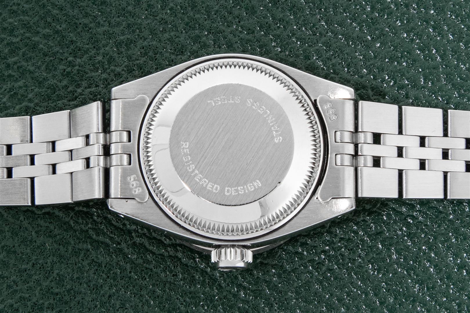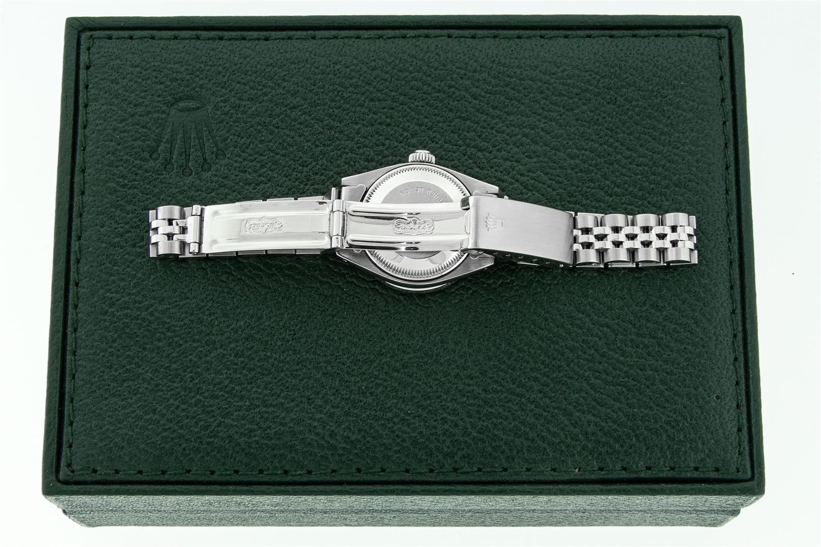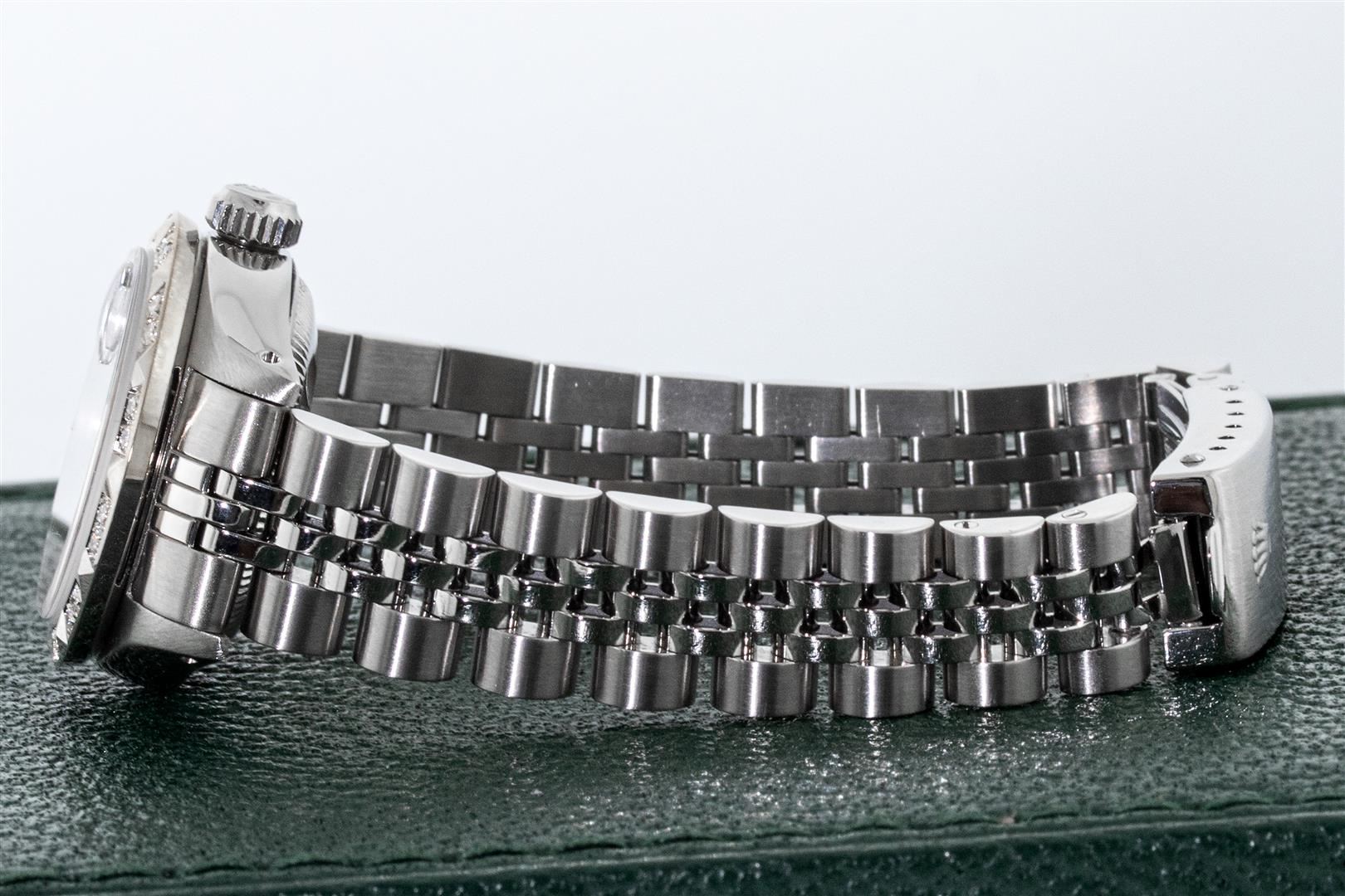 One Ladies Stainless Steel Rolex Datejust Polished Bright with Satin Finish, Serviced & Electronically Tested, Stainless Steel Case: 26mm, Stainless Steel Crown, Custom Bezel: New 18K White Gold Pyramid Diamond Bezel, Diamond Count: 24 Diamonds In Dial. Total Weight .50 Carat, Clarity: SI-VS, Color: G to H. Custom Crystal: New Scratch Resistant Synthetic Sapphire Cyclops Lens. Custom Hands: New Luminescent Hands. Movement: Automatic Winding Movement. Custom Dial: Light Pink Mother Of Pearl Diamond Dial. Diamond Count: 10 Diamonds In Dial. Clarity: SI-VS, Color: G to H. Date Window: 3 O'Clock Position Date Display, Model: Datejust. Condition: G-6 Extra Fine. Bracelet: Stainless Steel Jubilee Band With Rolex Crown On Buckle. Bright Polish & Satin Finish. Band Length: 6.0 Inch Length, Adjustable. Standard Clasp, With Rolex Logo. This Watch Has Been Serviced Time Tested And Is In Excellent Condition It Is Free Of All Scratches And Dents. This Watch Comes With A Rolex Box.
