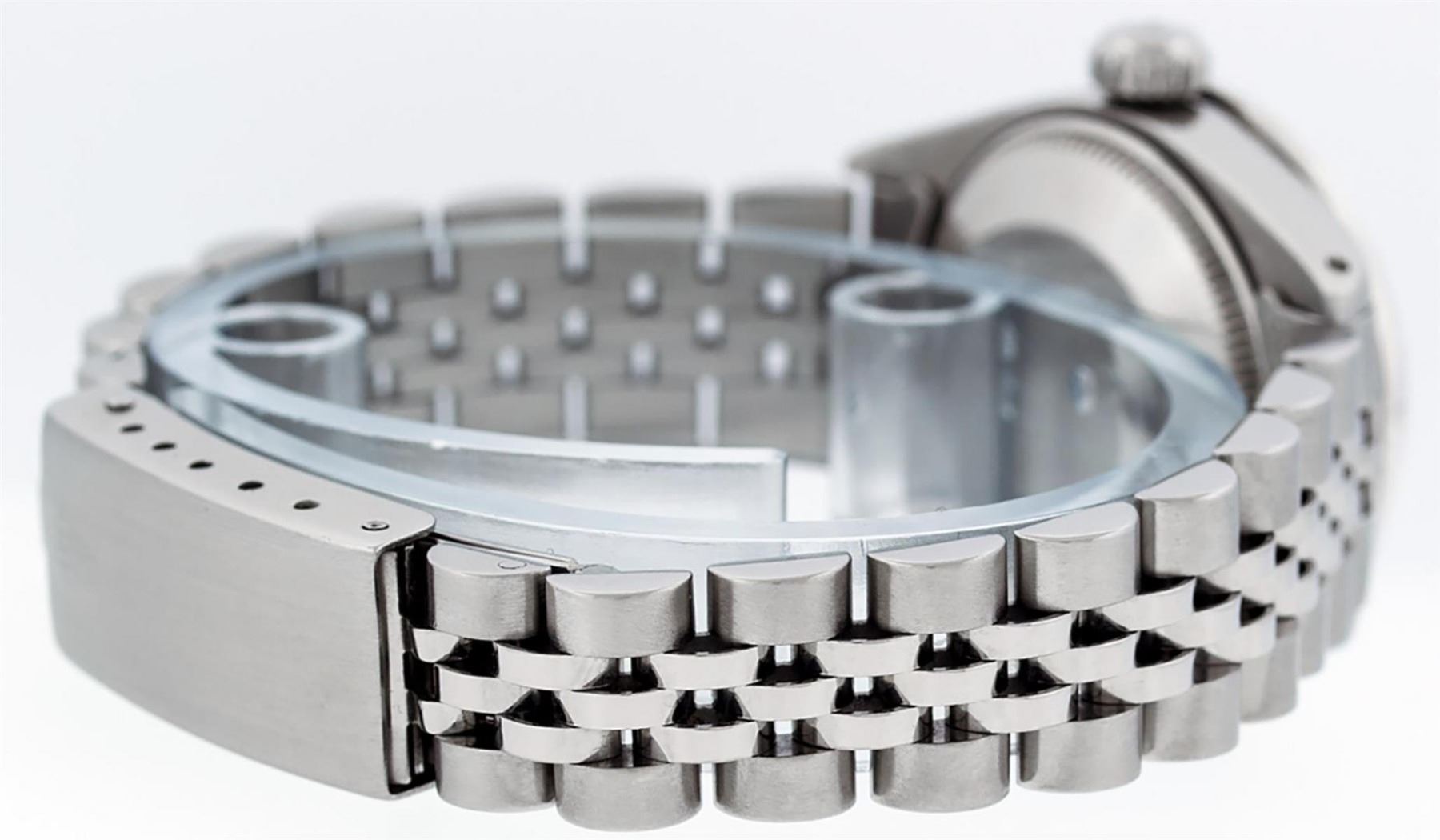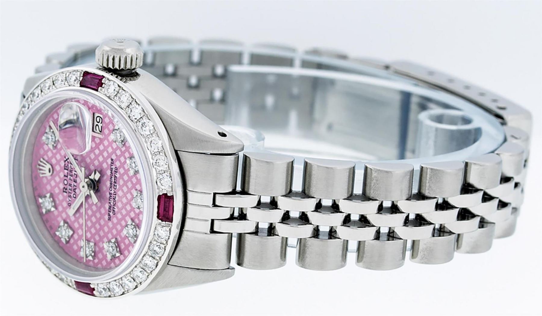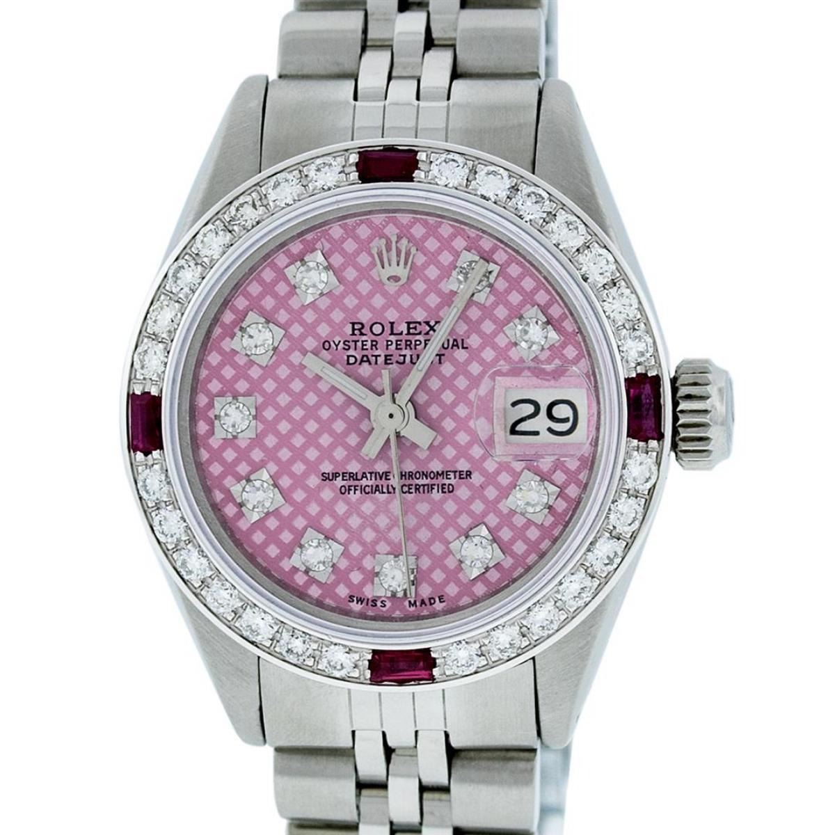 One Ladies Stainless Steel Rolex Datejust Polished Bright with Satin Finish, Serviced & Electronically Tested, Stainless Steel Case: 26mm, Stainless Steel Crown, Custom Bezel: New 18K White Ruby Beadset Diamond Bezel, Diamond + Gem Count: 28 Diamonds + 4 Rubies. Total Weight .70 Carat, Clarity: SI-VS, Color: G to H. Custom Crystal: New Scratch Resistant Synthetic Sapphire Cyclops Lens. Custom Hands: New Luminescent Hands. Movement: Automatic Winding Movement. Custom Dial: Pink Stamp With Single Cut Diamond Hour Markers, 10 Diamonds in Dial, G To H In Color, Clarity: SI-VS. Date Window: 3 O'Clock Position Date Display, Model: Datejust. Condition: G-6 Extra Fine. Bracelet: Stainless Steel Jubilee Band. Bright Polish & Satin Finish. 6.0 Inch Length, Adjustable. Standard Clasp, With Rolex Logo. This Watch Has Been Serviced Time Tested And Is In Excellent Condition It Is Free Of All Scratches And Dents.
