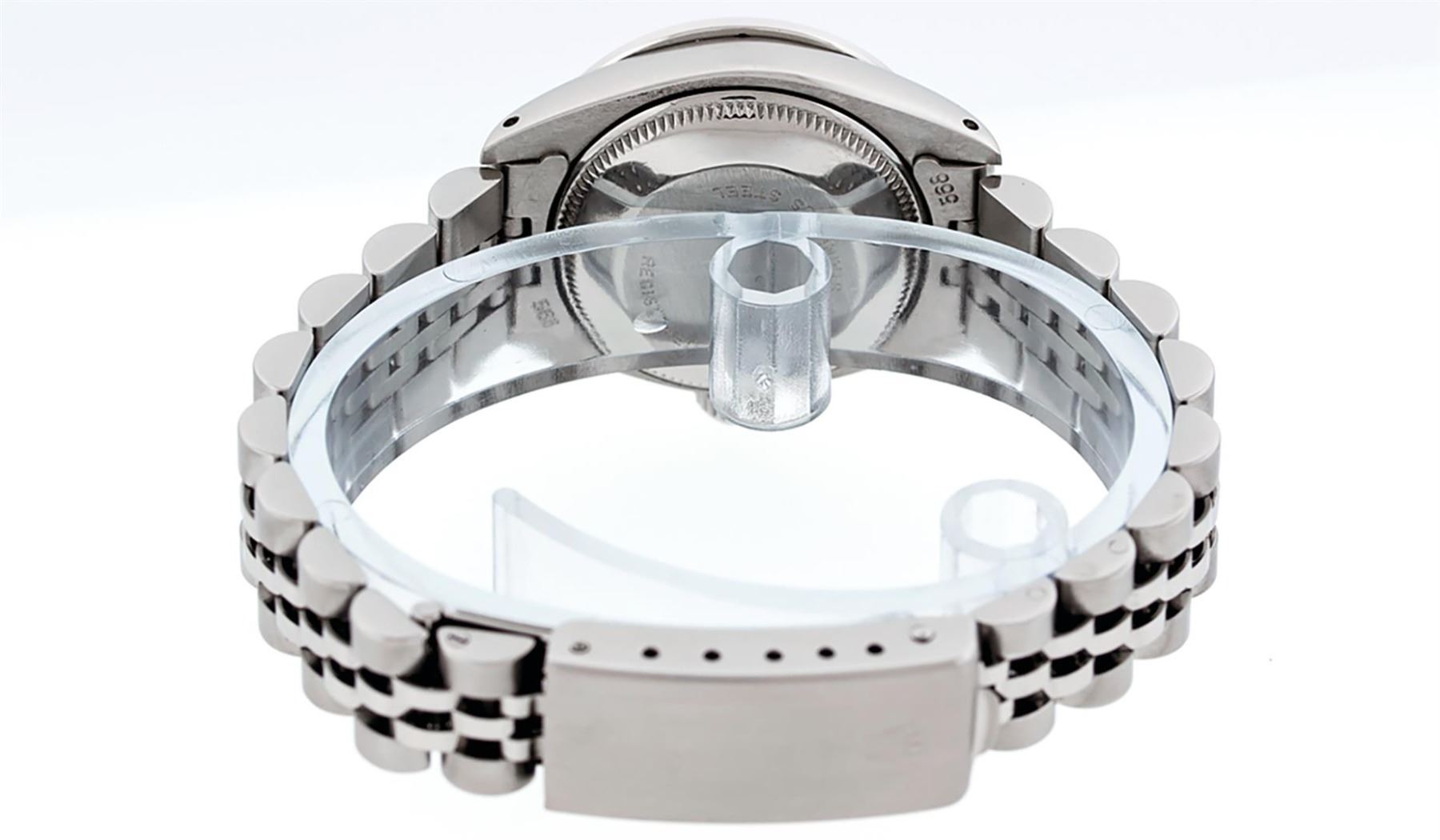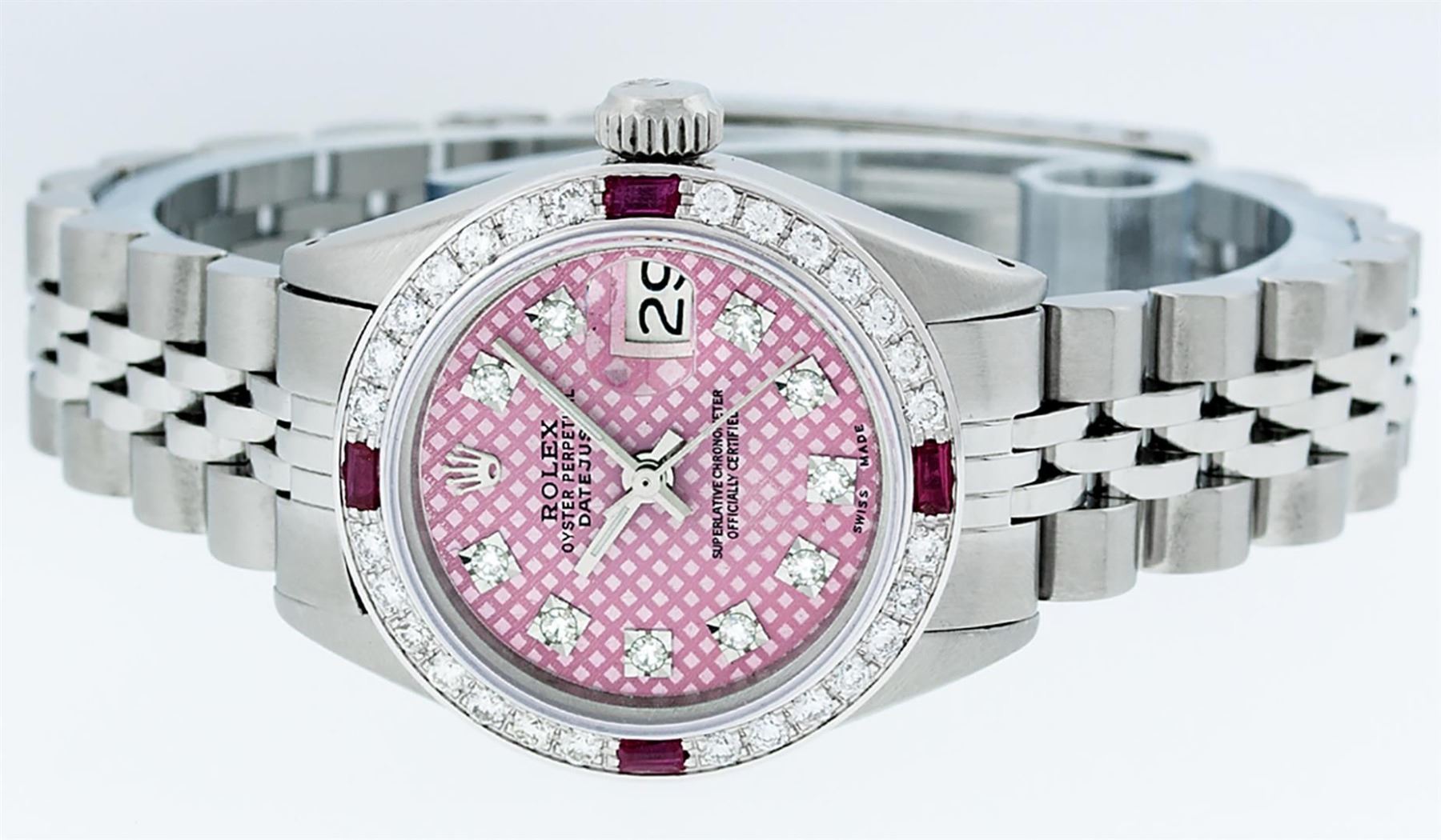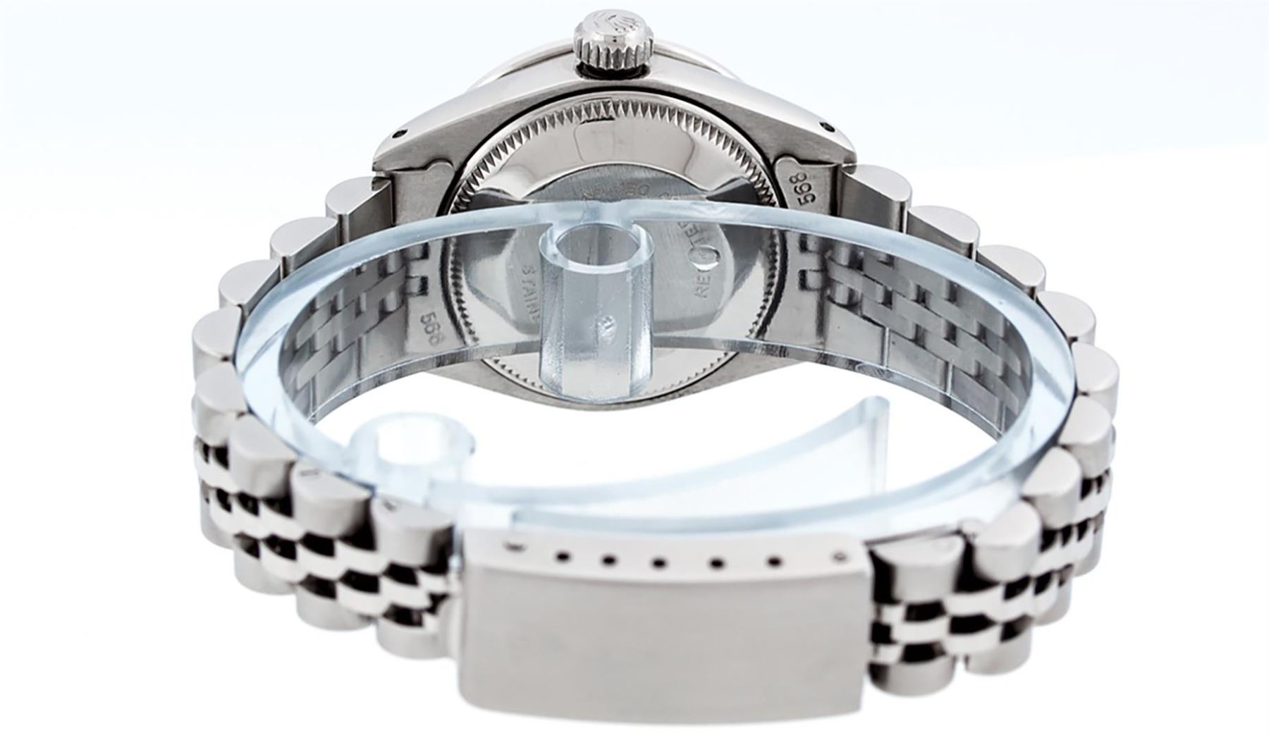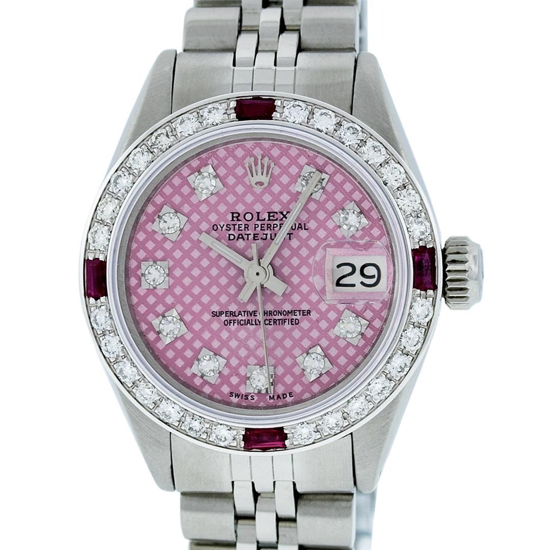 One Ladies Pre Owned Stainless Steel Rolex Datejust Polished Bright with Satin Finish, Serviced & Electronically Tested, Stainless Steel Case: 26mm, Stainless Steel Crown, Custom Bezel: New 18K White Ruby Beadset Diamond Bezel, Diamond + Gem Count: 28 Dia