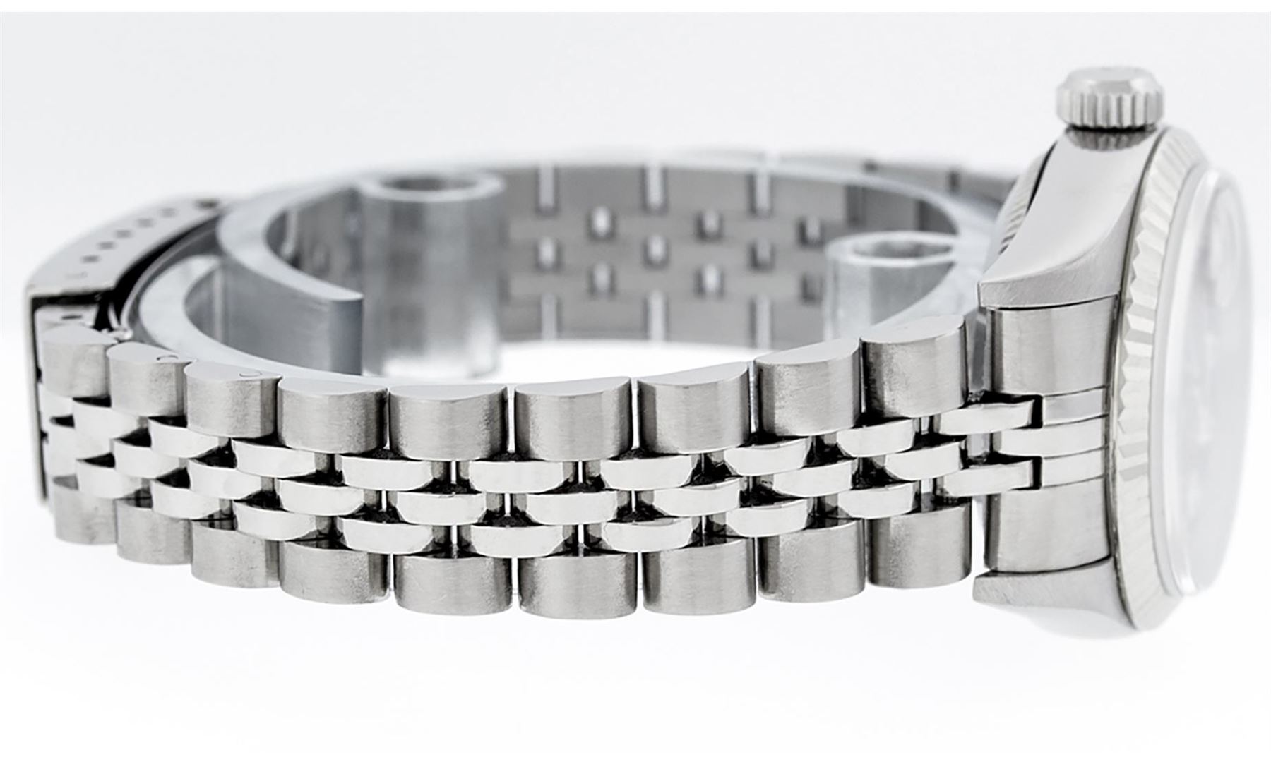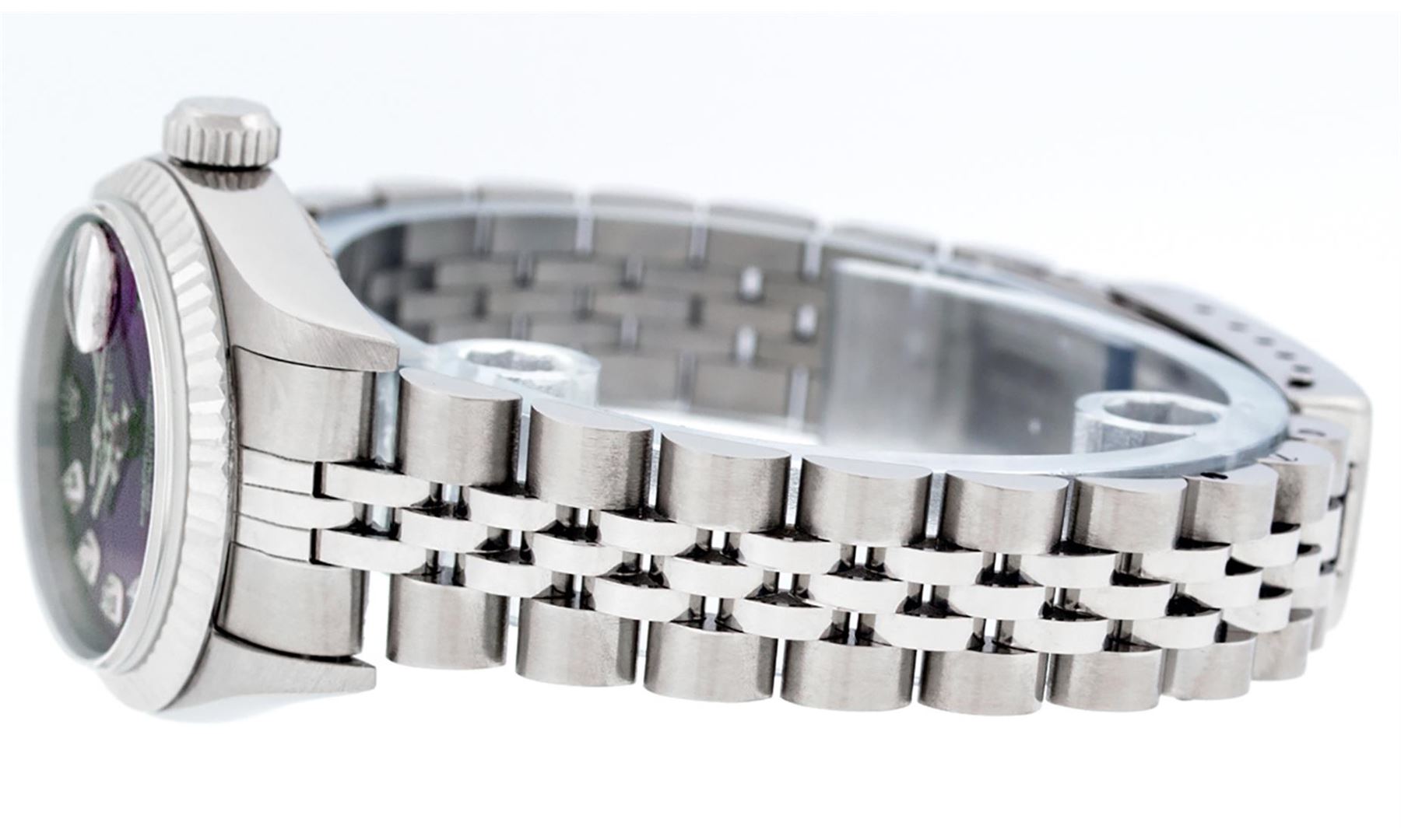 One Ladies Pre Owned Quickset Stainless Steel Rolex Datejust Polished Bright with Satin Finish, Serviced & Electronically Tested, Rolex Stainless Steel Case: 26mm, Rolex Stainless Steel Crown, Rolex Bezel: 18K White Gold Fluted Bezel. Custom Crystal: New Scratch Resistant Sapphire Cyclops Lens. Custom Hands: New Luminescent Hands. Rolex Movement: Automatic Winding Movement. Custom Dial: Refinished To Purple With Added Diamonds, Diamond Count: 10 Diamonds In Dial, Color: G to H, Clarity: SI1 Date Window: 3 O'Clock Position Date Display, Model: 79174 Quickset Datejust Caliber 2230. Condition: G-6 Extra Fine. Rolex Bracelet: Stainless Steel Jubilee Band. Bright Polish & Satin Finish. 6.0 Inch Length, Adjustable. Standard Clasp, With Rolex Logo. This Watch Has Been Serviced Time Tested And Is In Excellent Condition It Is Free Of All Scratches And Dents.