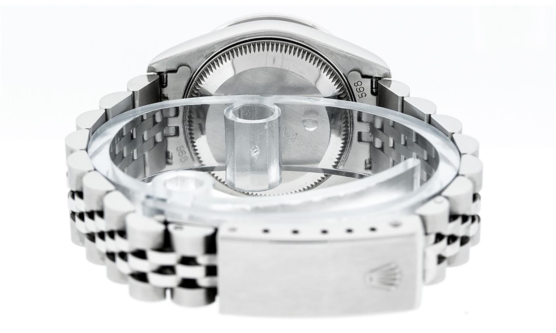 One Ladies Pre Owned Quickset Stainless Steel Rolex Datejust Polished Bright with Satin Finish, Serviced & Electronically Tested, Rolex Stainless Steel Case: 26mm, Rolex Stainless Steel Crown, Rolex Bezel: 18K White Gold Fluted Bezel. Custom Crystal: New Scratch Resistant Sapphire Cyclops Lens. Custom Hands: New Luminescent Hands. Rolex Movement: Automatic Winding Movement. Custom Dial: Refinished To Purple With Added Diamonds, Diamond Count: 10 Diamonds In Dial, Color: G to H, Clarity: SI1 Date Window: 3 O'Clock Position Date Display, Model: 79174 Quickset Datejust Caliber 2230. Condition: G-6 Extra Fine. Rolex Bracelet: Stainless Steel Jubilee Band. Bright Polish & Satin Finish. 6.0 Inch Length, Adjustable. Standard Clasp, With Rolex Logo. This Watch Has Been Serviced Time Tested And Is In Excellent Condition It Is Free Of All Scratches And Dents.